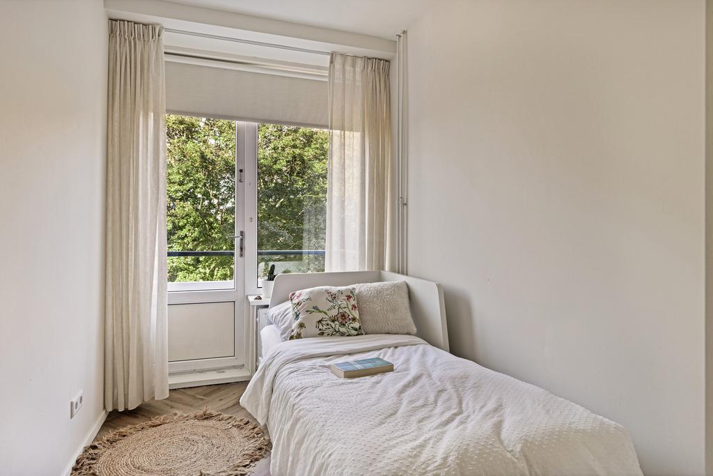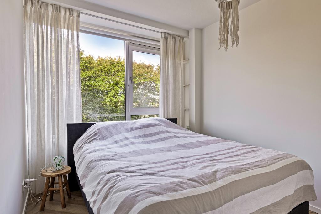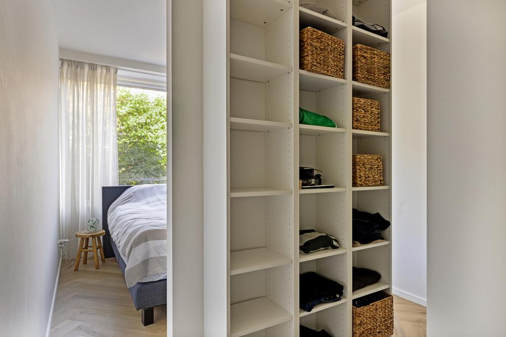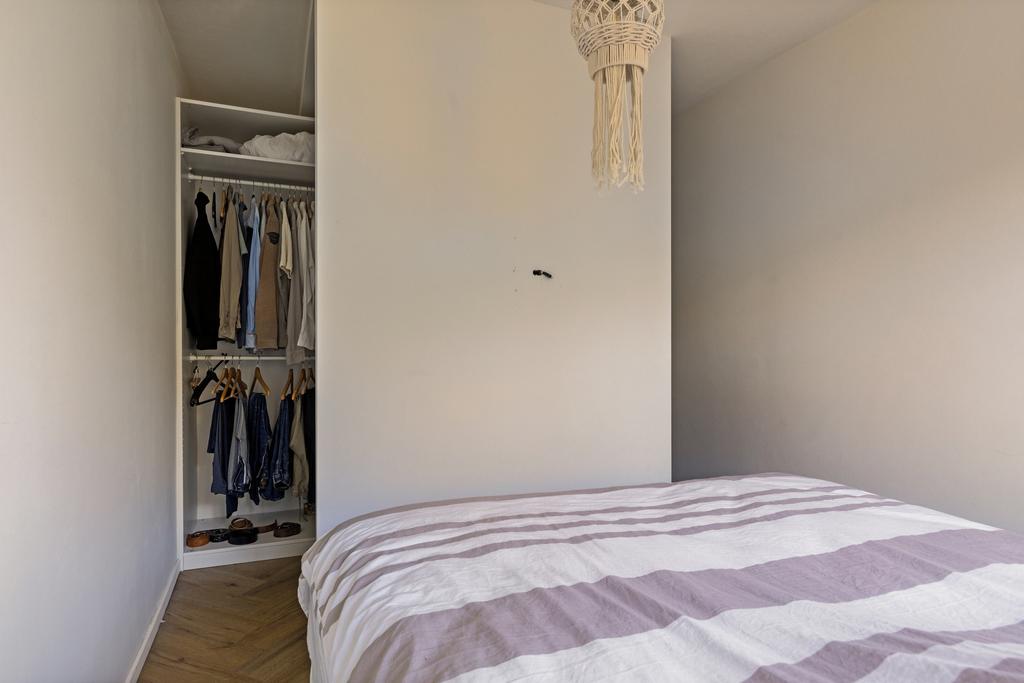 De twee slaapkamers van het appartement bevinden zich aan de zijgevel. De wanden en plafonds zijn in deze ruimtes fraai afgewerkt. En de kleine slaapkamer geeft een deur naar een tweede balkon. Er is ook nog een berging aanwezig in het appartement. Hier vindt u de aansluitingen voor de wasmachine en de droger, de elektrische boiler (Bosch, 2023) en heeft u ruimte om spullen op te bergen.