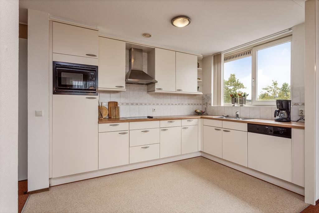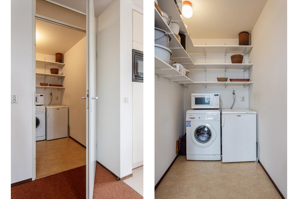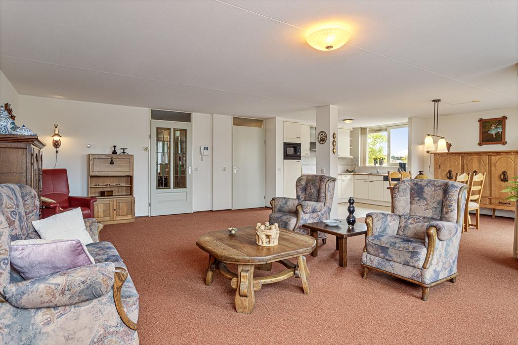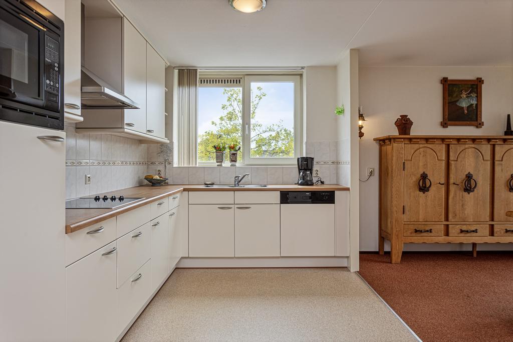 De woonkamer is prettig licht en afgewerkt met licht gestucte wanden, strak plafond en tapijt als vloerafwerking. Er is ruimte voor een ruime zit- en eethoek en toegang tot het speelse balkon middels een schuifpui. Doordat het appartement op de hoek is gelegen, heeft u geen aangrenzend balkon van de buren. Zowel vanuit de woonkamer als het balkon heeft u zicht op de winkels. Vanuit de woonkamer is de open keuken te bereiken. De keuken in L-opstelling is voorzien van diverse apparatuur zoals een koelkast, combimagnetron, kookplaat, afzuiging, vaatwasser en spoelbak. Er is voldoende kastruimte aanwezig, door de open ligging staat de keuken in verbinding met de woonkamer. Daarnaast is de berging bereikbaar vanuit de woonkamer, hier bevinden zich de aansluitingen voor de wasapparatuur.