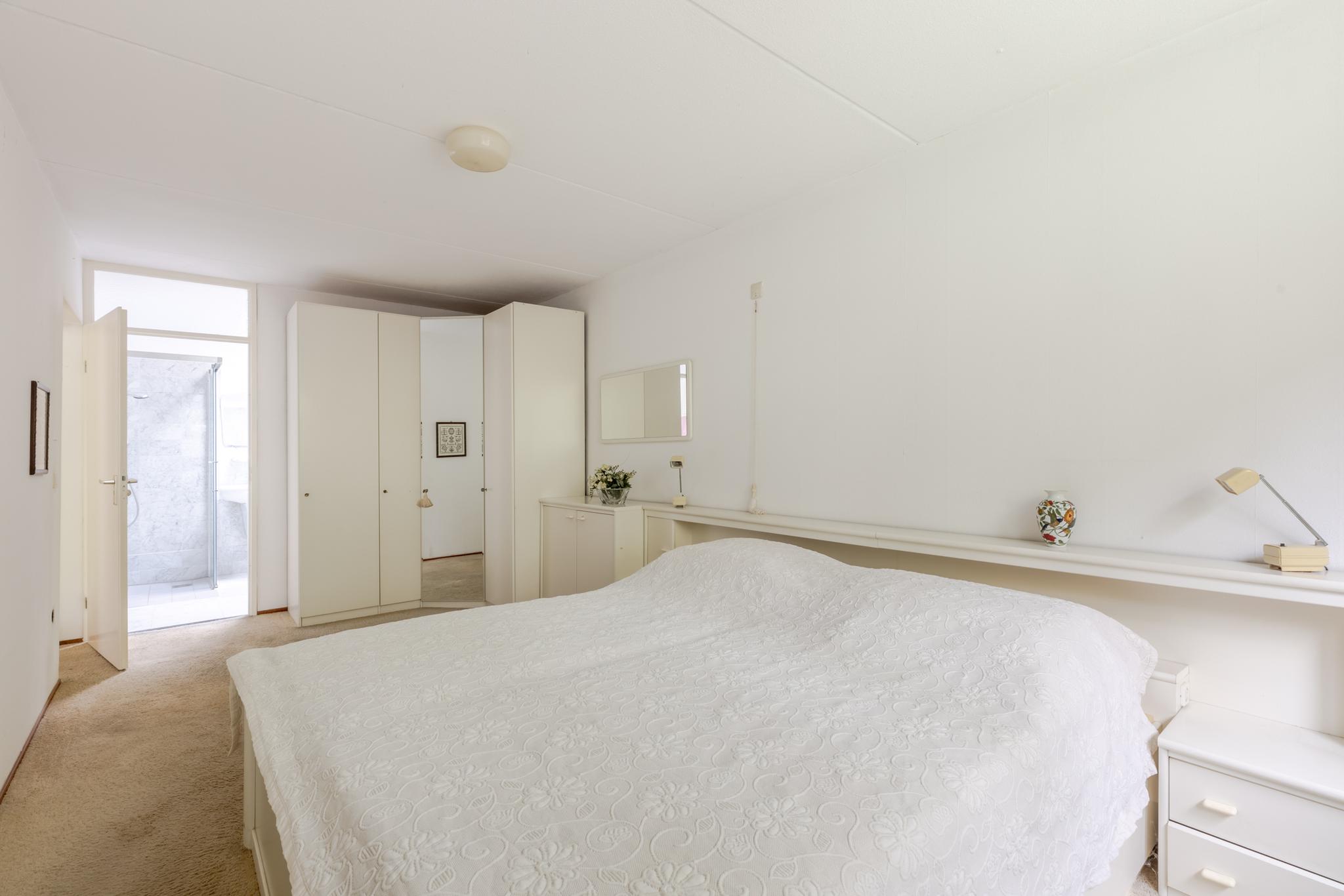 De royale slaapkamer op de begane grond biedt volop comfort en privacy, met uitzicht op de achtertuin door een groot raam voorzien van een rolluik. Direct aangrenzend bevindt zich een ruime, rolstoelvriendelijke badkamer die van alle gemakken is voorzien: een inloopdouche, dubbele wastafel, ligbad, toilet, radiator en een te openen lichtkoepel voor extra daglicht en natuurlijke ventilatie. Een ideale combinatie van gemak en luxe op de begane grond.