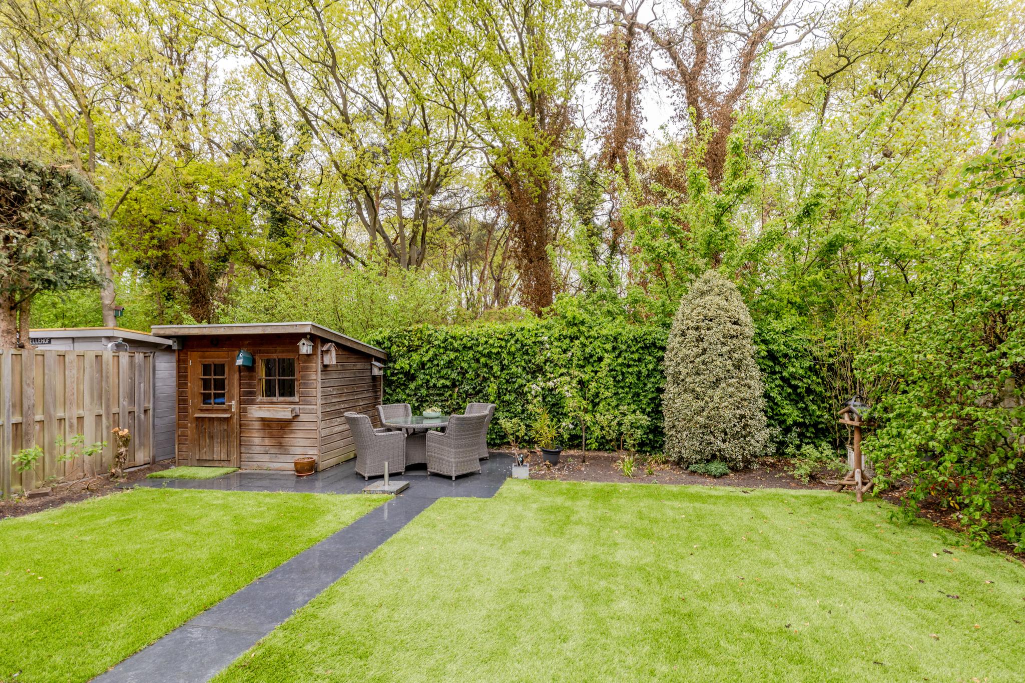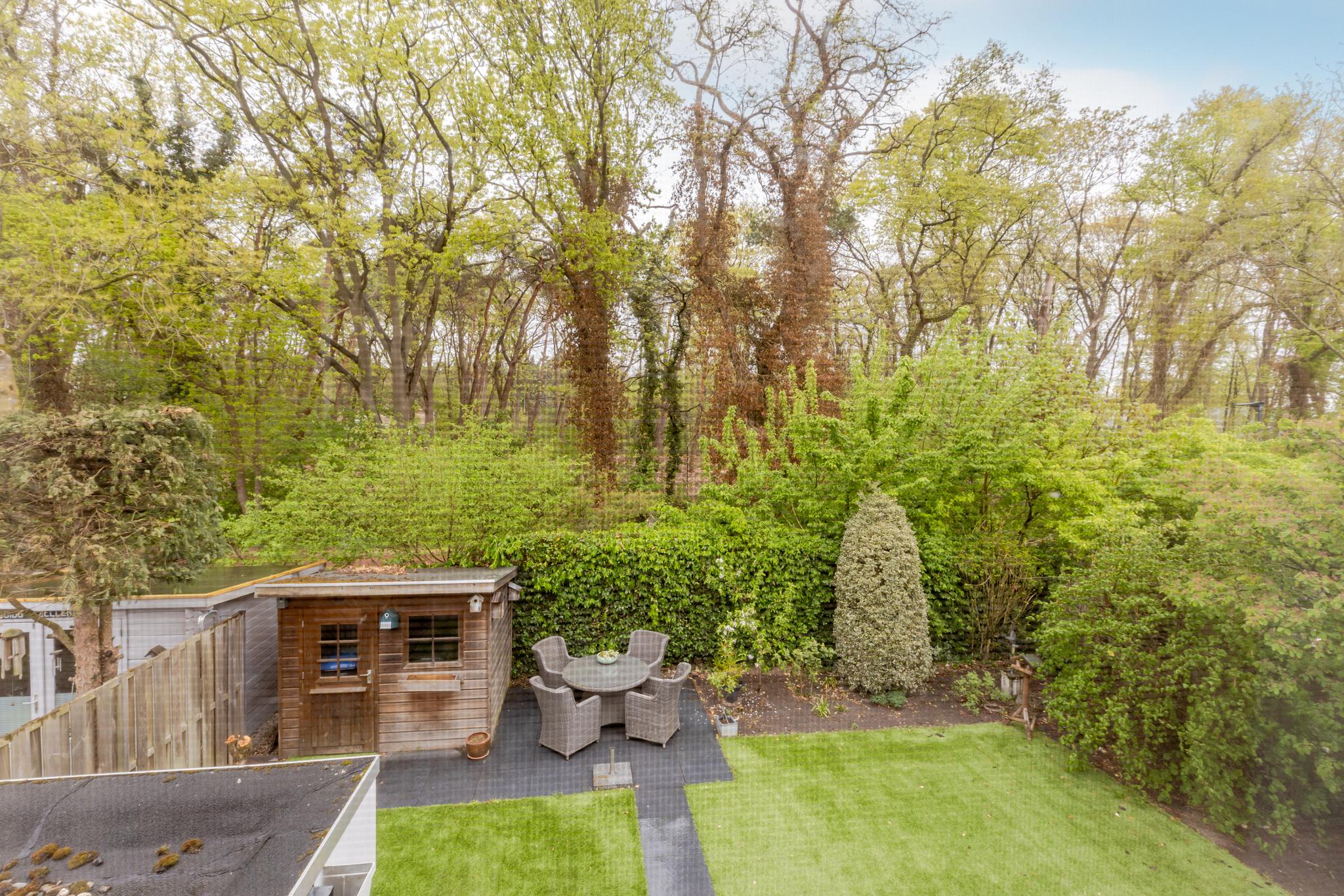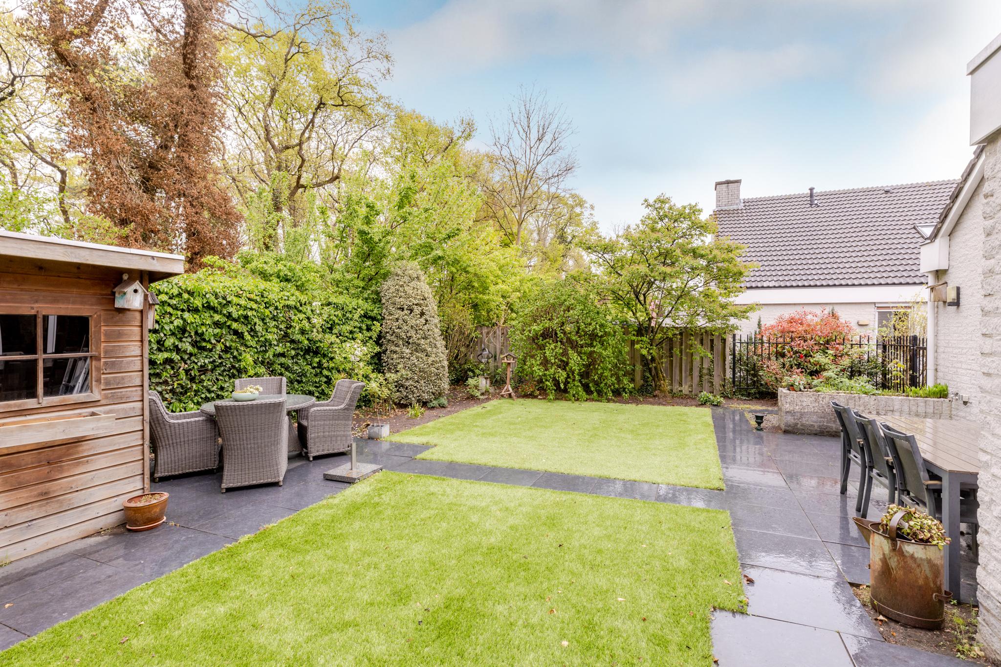 Achter de woning ligt een fraai aangelegde tuin op het noordoosten, met een terras aan het huis en achterin de tuin een sfeervolle zithoek en een houten berging. Perfect voor het opbergen van fietsen en tuingereedschap. De tuin grenst direct aan een groene zone, wat zorgt voor veel privacy en een prachtig uitzicht waar u kunt genieten van de natuur.