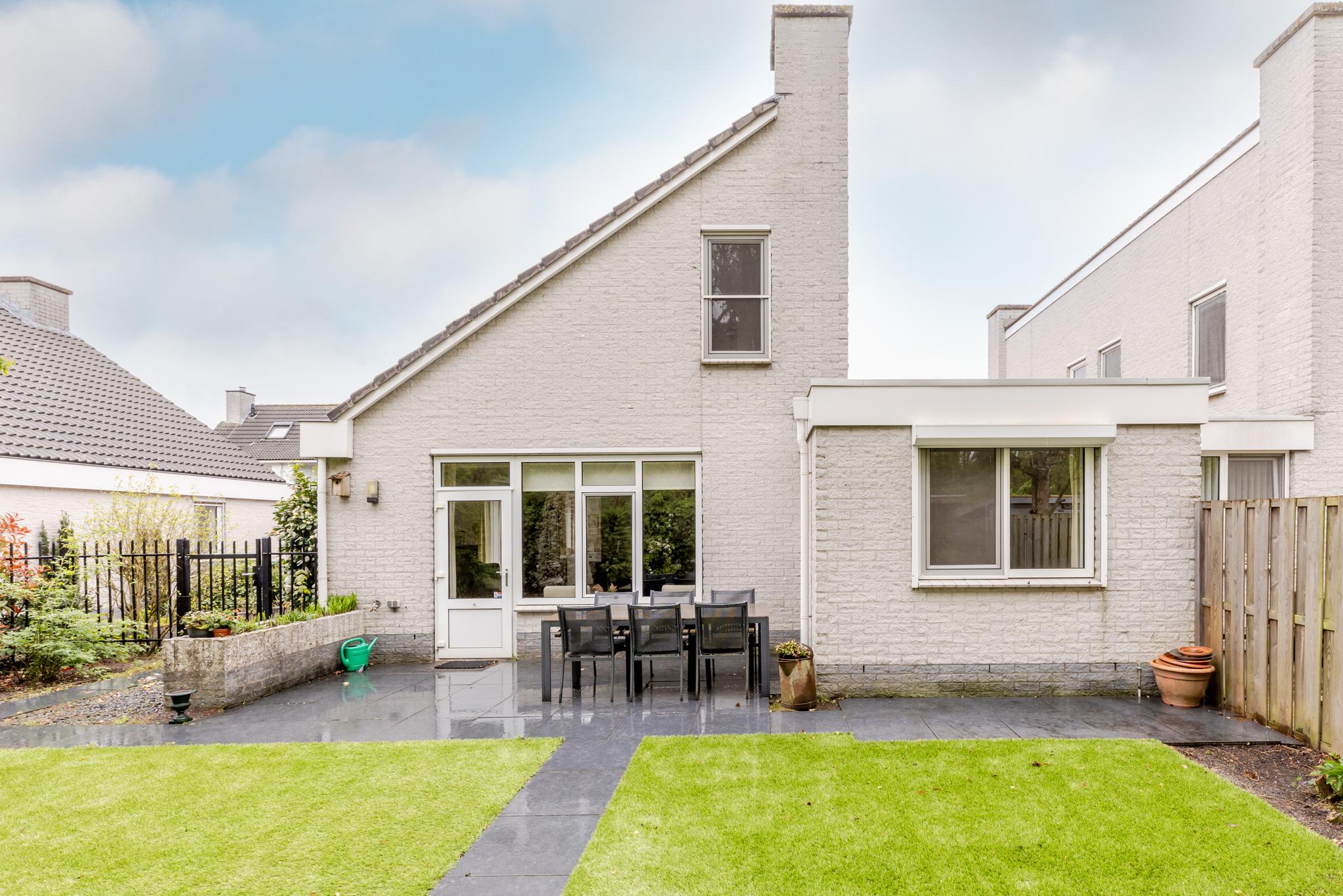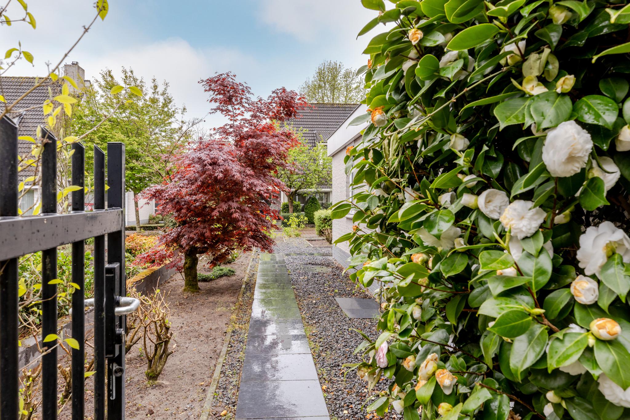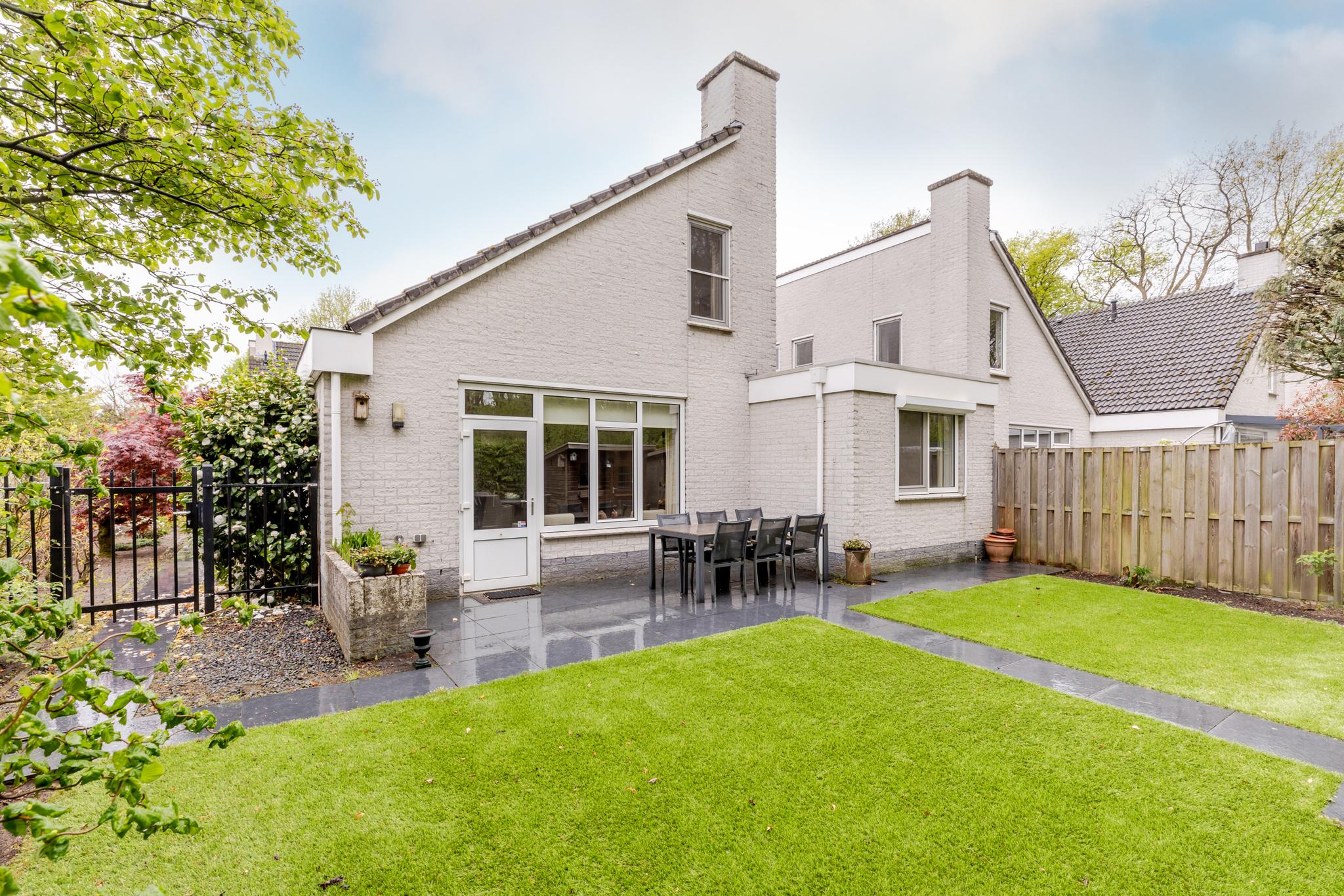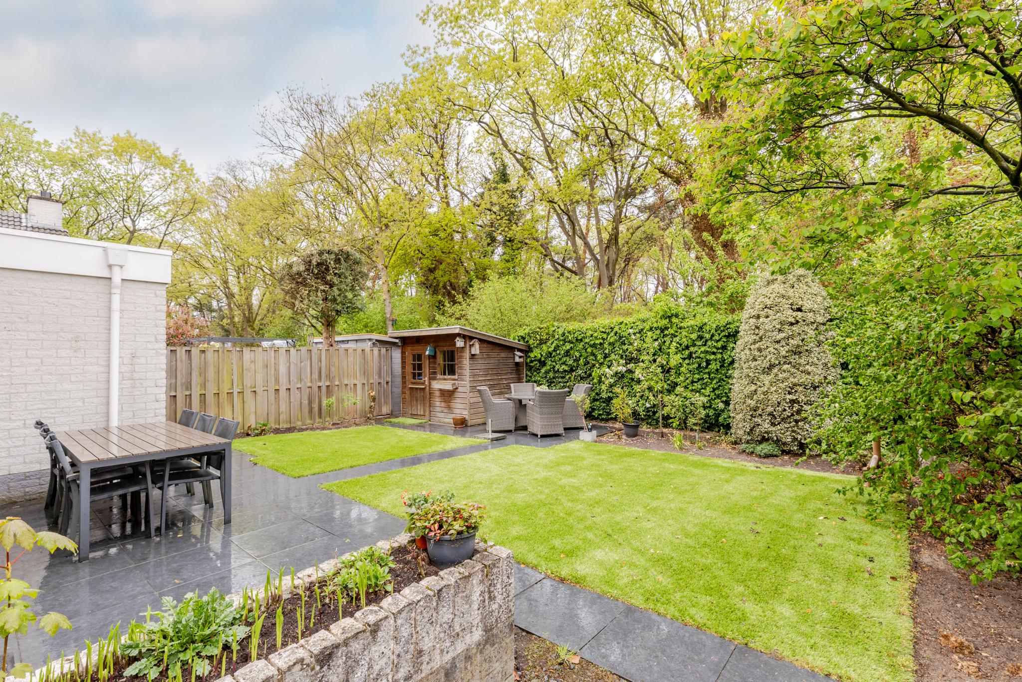 Achter de woning ligt een fraai aangelegde tuin op het noordoosten, met een terras aan het huis en achterin de tuin een sfeervolle zithoek en een houten berging. Perfect voor het opbergen van fietsen en tuingereedschap. De tuin grenst direct aan een groene zone, wat zorgt voor veel privacy en een prachtig uitzicht waar u kunt genieten van de natuur.