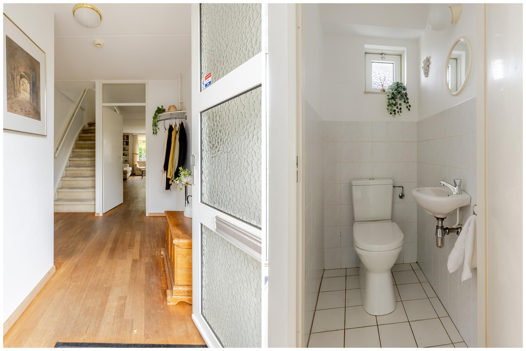 Bij aankomst valt direct de verzorgde voortuin op, die onderhoudsvriendelijk is aangelegd. De oprit biedt ruimte genoeg voor een auto en leidt naar zowel de garage als de overdekte entree. Binnenkomst in de woning is via de hal, waar zich de meterkast, het toilet, de trapopgang naar de eerste verdieping, de toegang tot de garage en de woonkamer bevinden. Het toilet is licht betegeld en voorzien van een fonteintje.