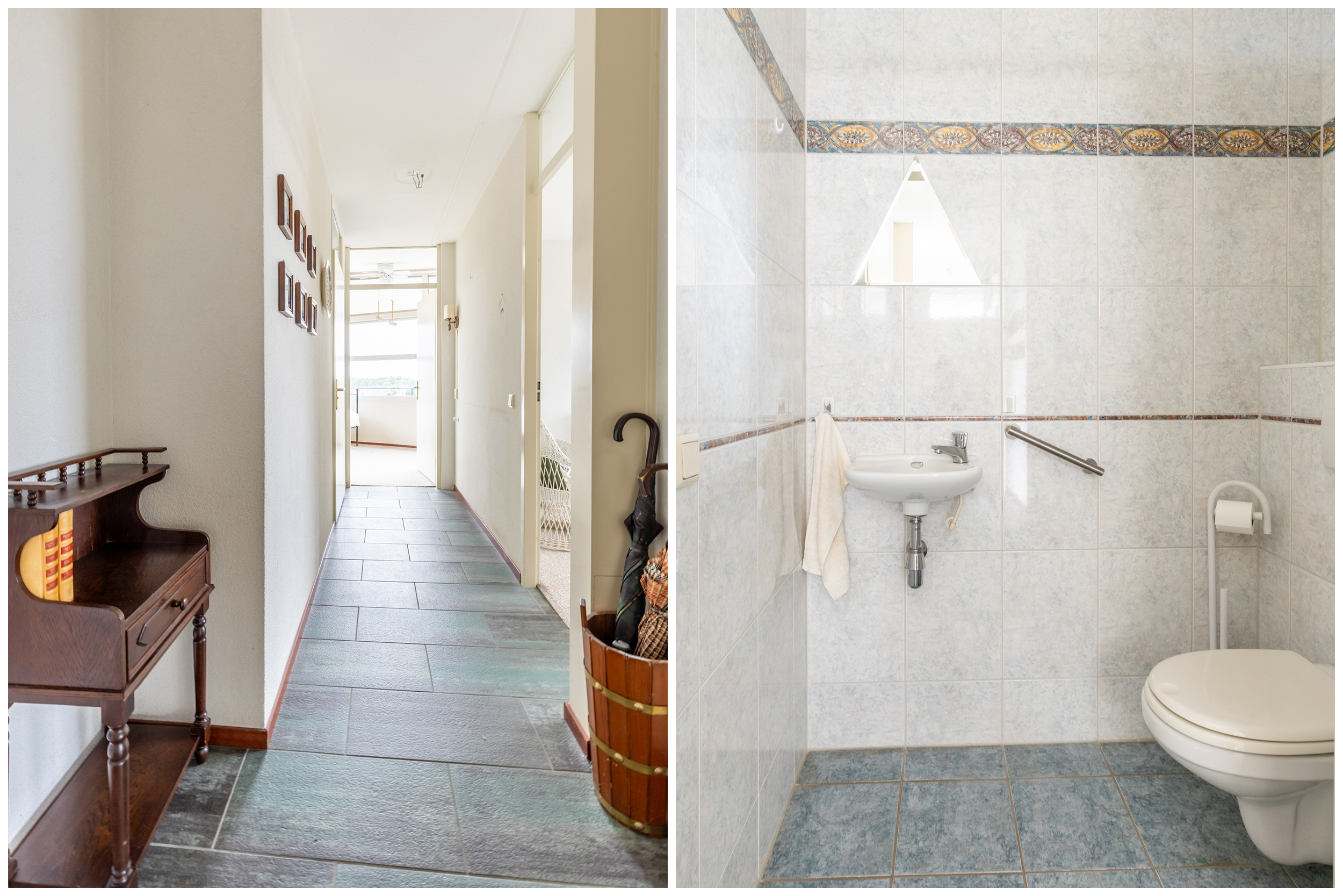 Bij binnenkomst in de entree/hal vind je direct rechts de toiletruimte. Aan deze hal grenzen ook de woonkamer, de twee ruime slaapkamers en de badkamer. De badkamer bestaat uit een ligbad, douche, wastafel en een tweede toilet. Beide slaapkamers zijn ruim bemeten en hebben toegang tot het dakterras.