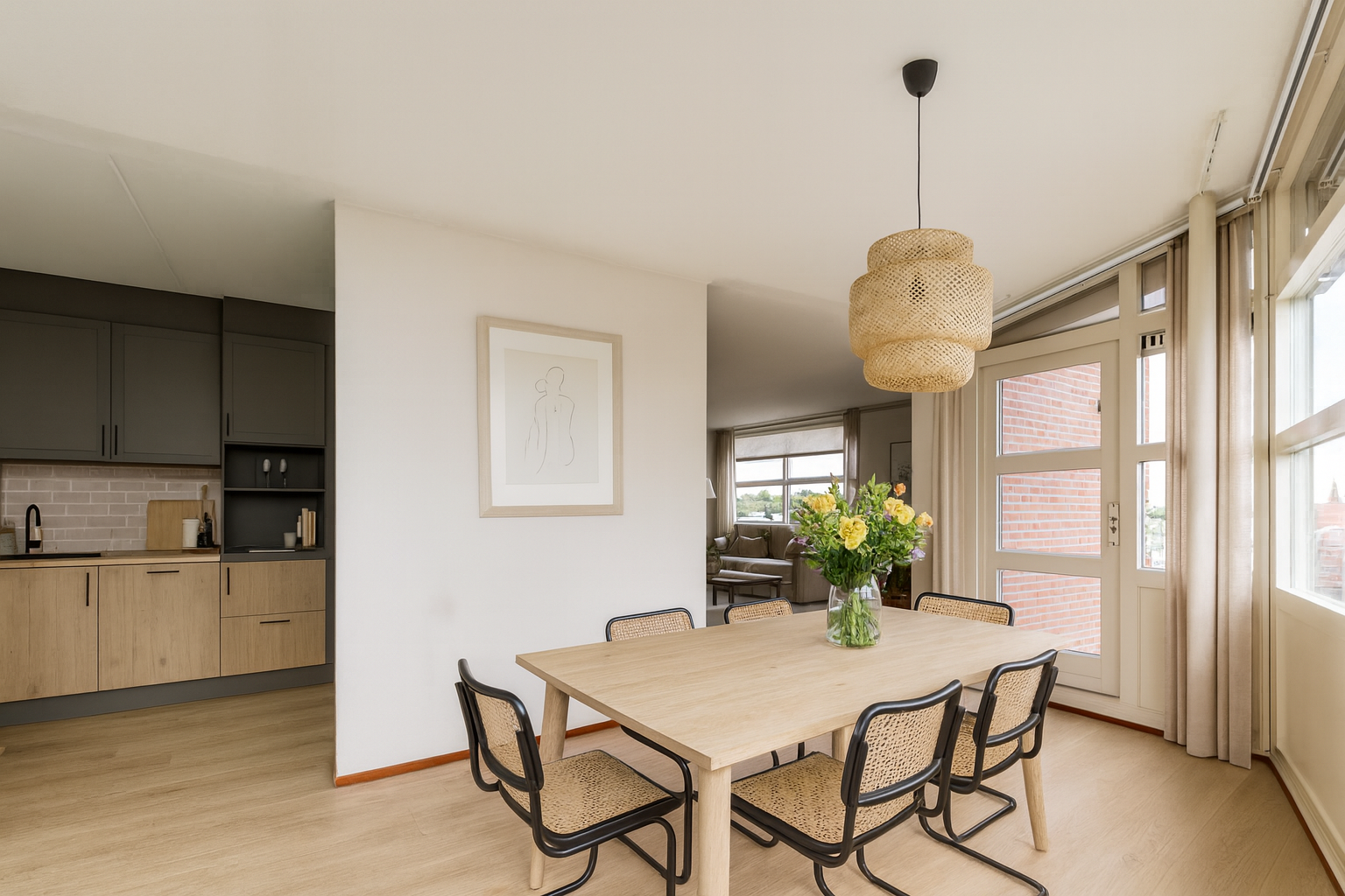 De woonkamer is ruim en heeft een fijne lichtinval door de grote raampartijen. Dubbele tuindeuren geven hier toegang tot het dakterras. Aangrenzen aan de woonkamer is de eetkamer en de keuken. De keuken is in een L-vorm opgesteld en voorzien van diverse inbouwapparatuur. In de keuken is een deur naar de bijkeuken aanwezig. Naast de cv-ketel en wasapparatuur is hier meer dan voldoende plek voor voorraad en schoonmaakspullen.