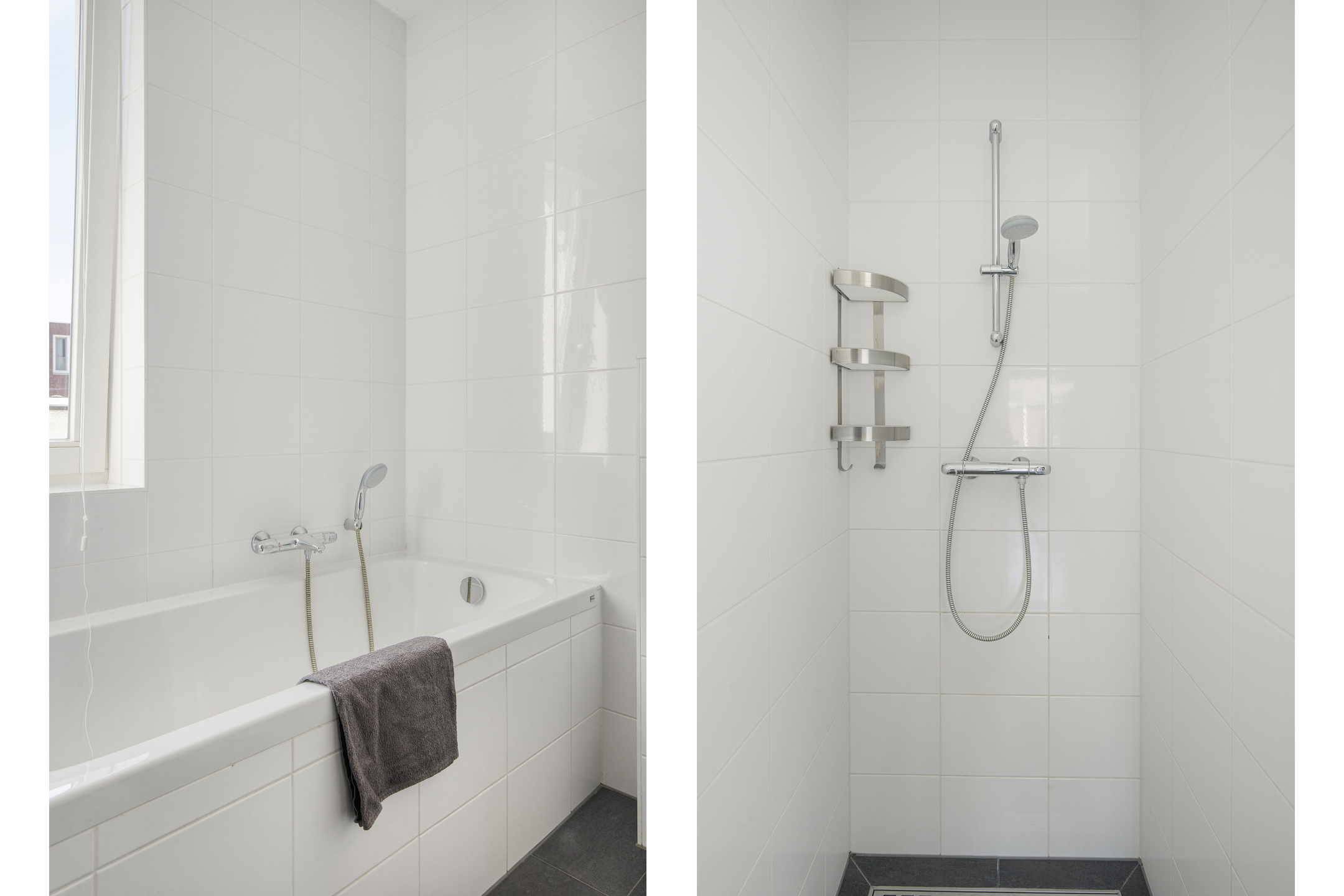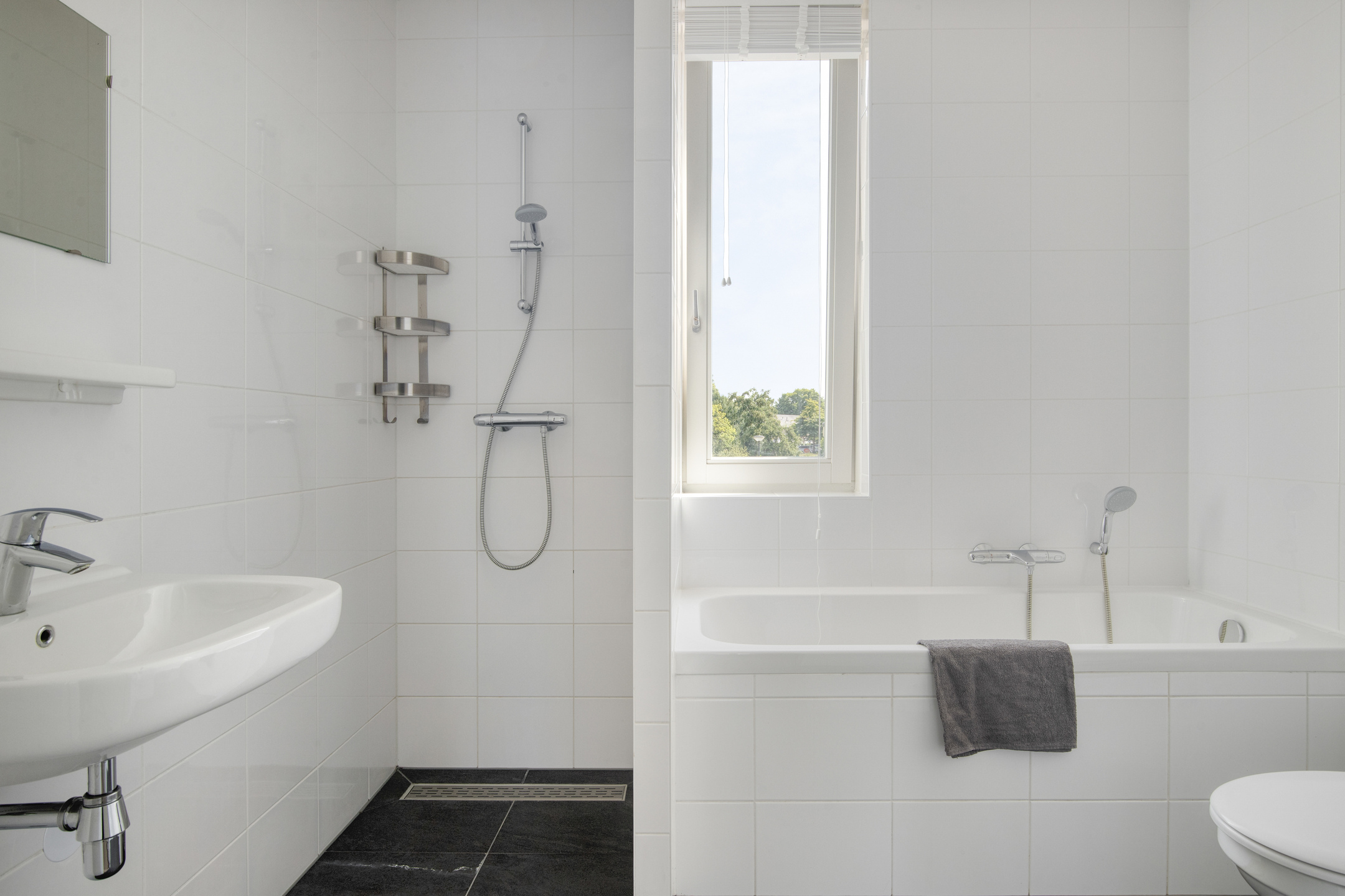 De badkamer is praktisch en compleet uitgerust met een ligbad, aparte douche, wastafel en tweede toilet. De witte wandtegels in combinatie met de donkere vloertegels geven de ruimte een moderne en tijdloze uitstraling. Het aanwezige raam met houten kozijn en draaikiepraam zorgt voor natuurlijk licht en ventilatie. Daarnaast beschikt de badkamer ook over mechanische ventilatie en een elektrische radiator, wat bijdraagt aan extra comfort.