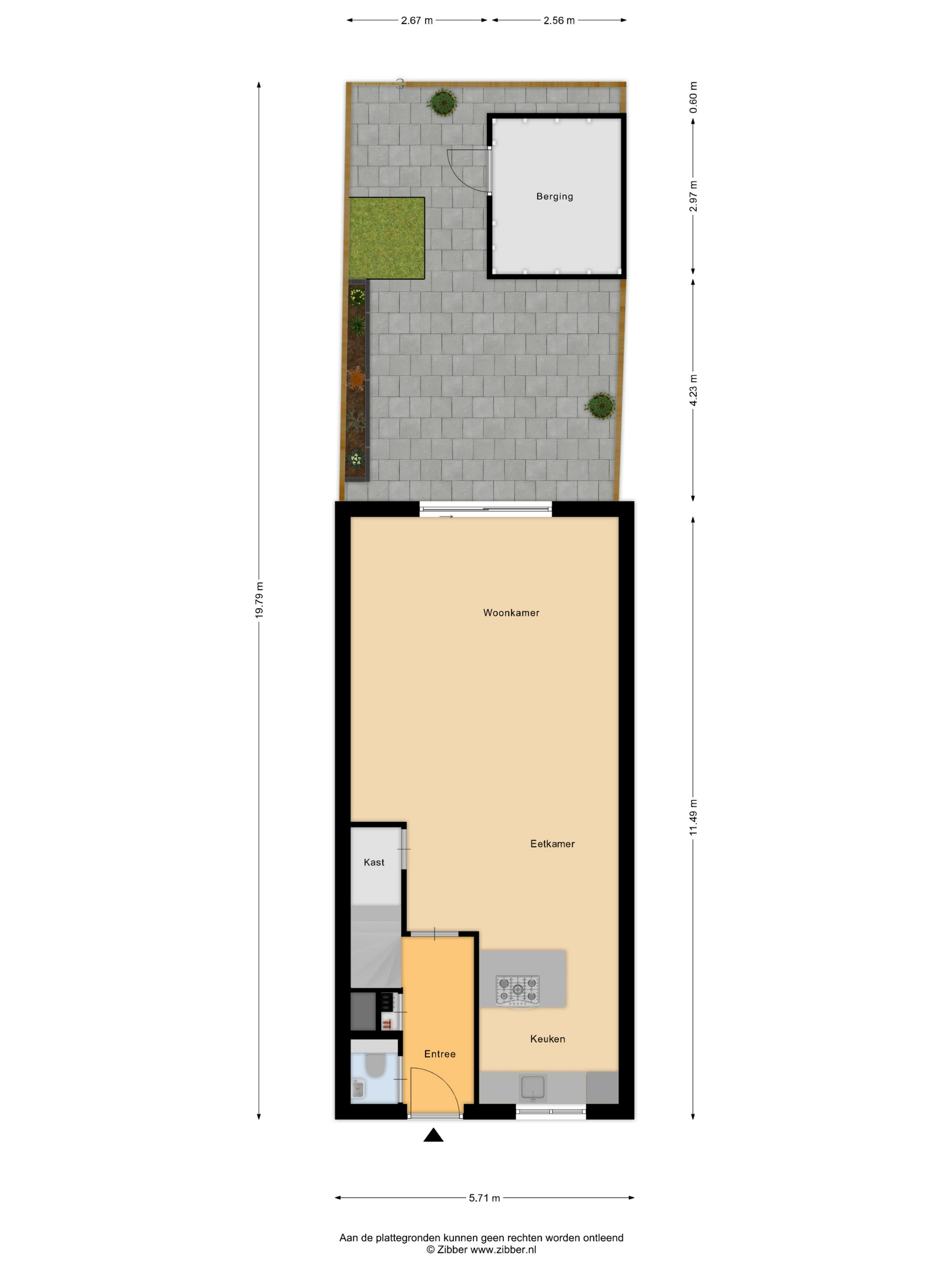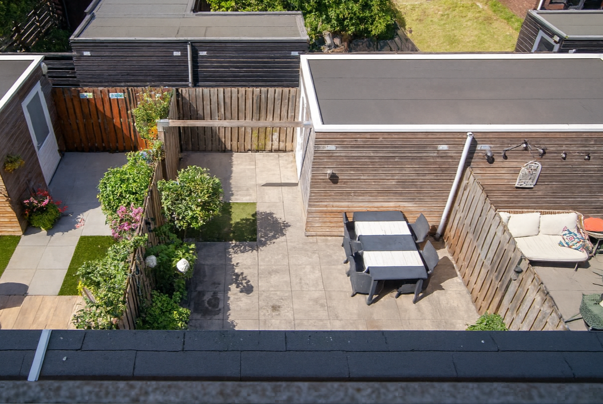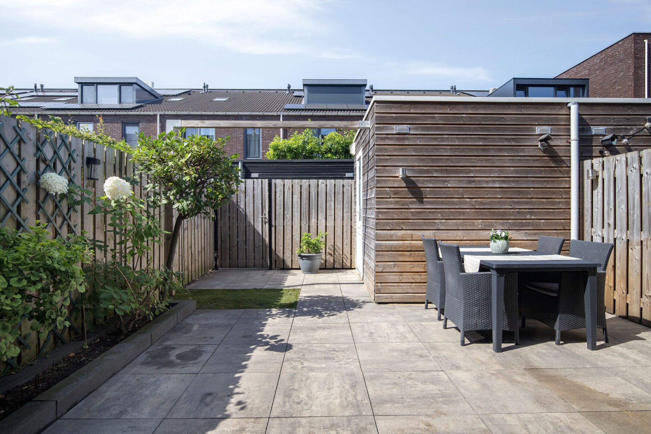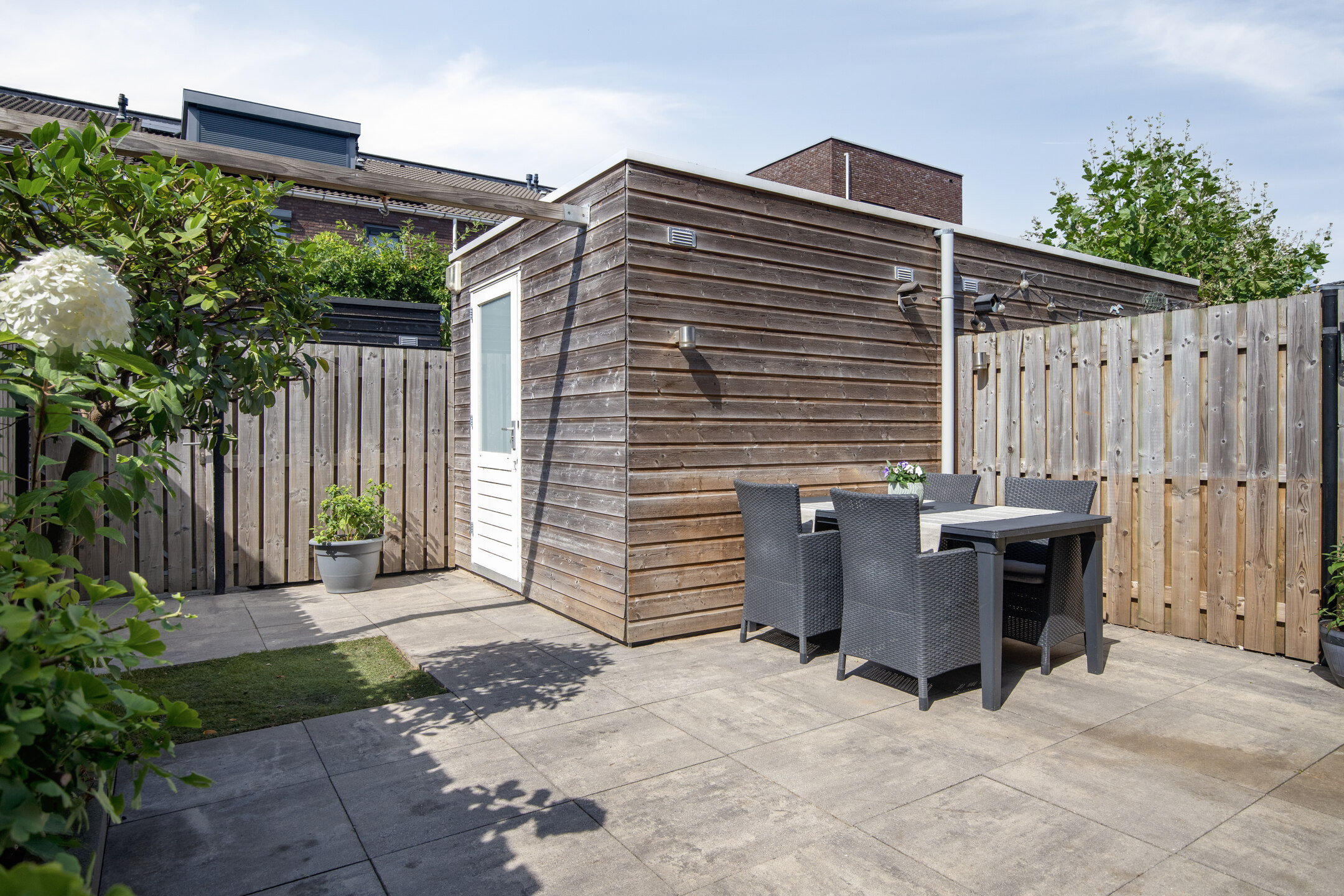 De achtertuin is gelegen op het noordwesten en is onderhoudsvriendelijk aangelegd met bestrating en een aantal groene accenten. Achterin de tuin staat een houten berging met elektra, ideaal voor het stallen van fietsen of het opbergen van tuingereedschap. Daarnaast beschikt de tuin over een praktische achterom met toegang tot de brandgang.