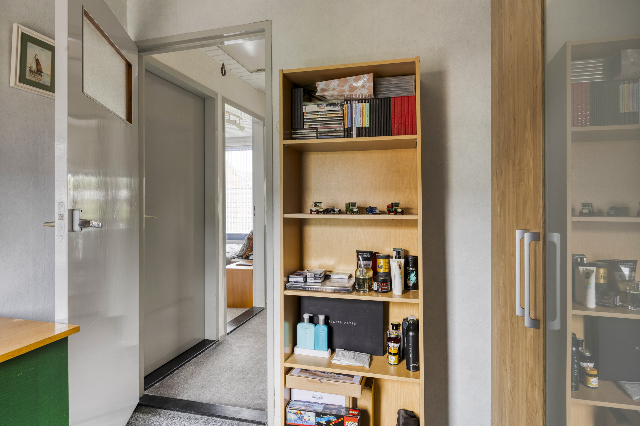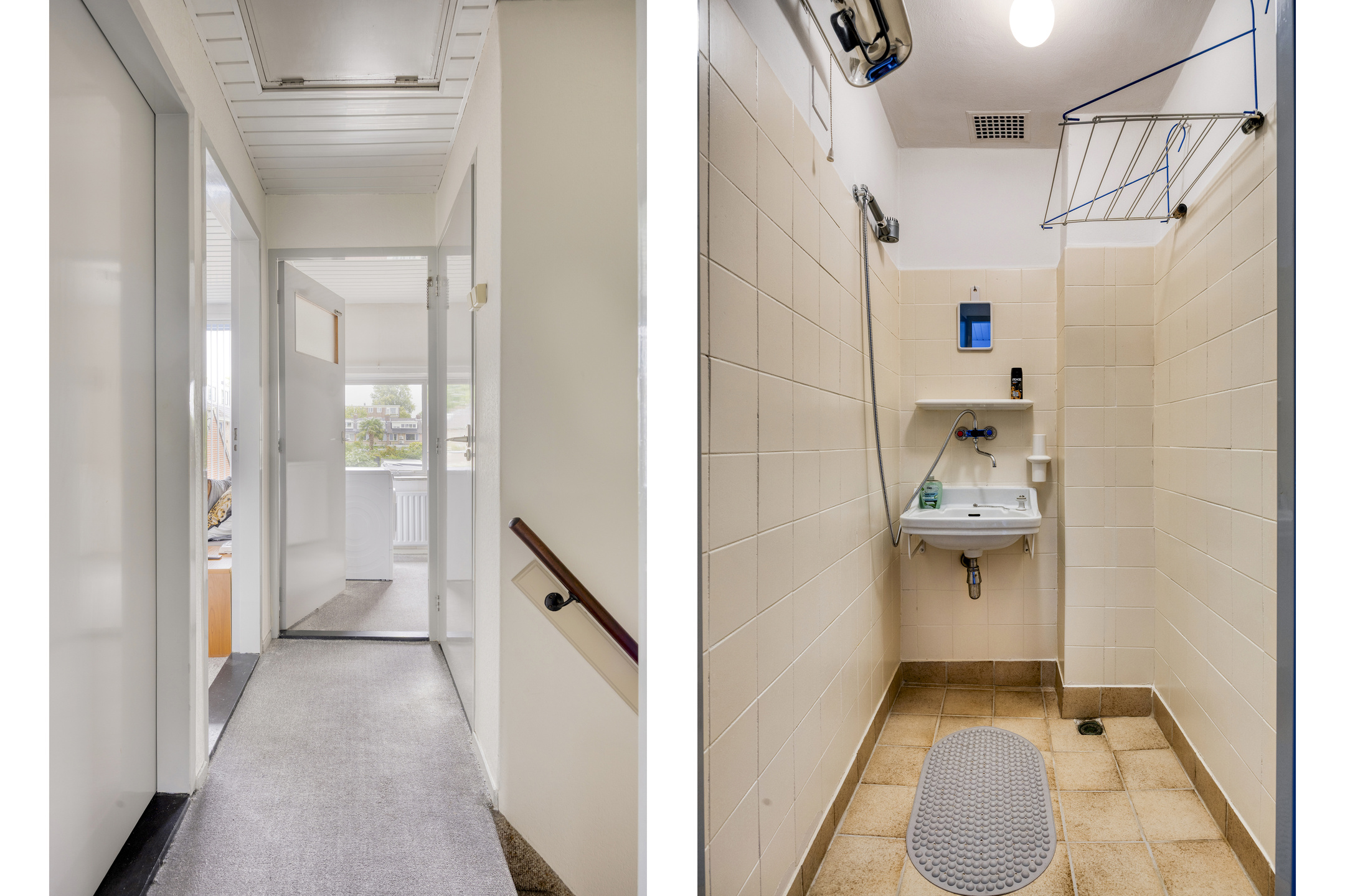Ruime overloop met toegang tot 3 slaapkamers, een wasruimte en de eenvoudige badkamer met douche en wastafel. Vanaf de overloop is via een luik met vlizotrap toegang tot de bergzolder.