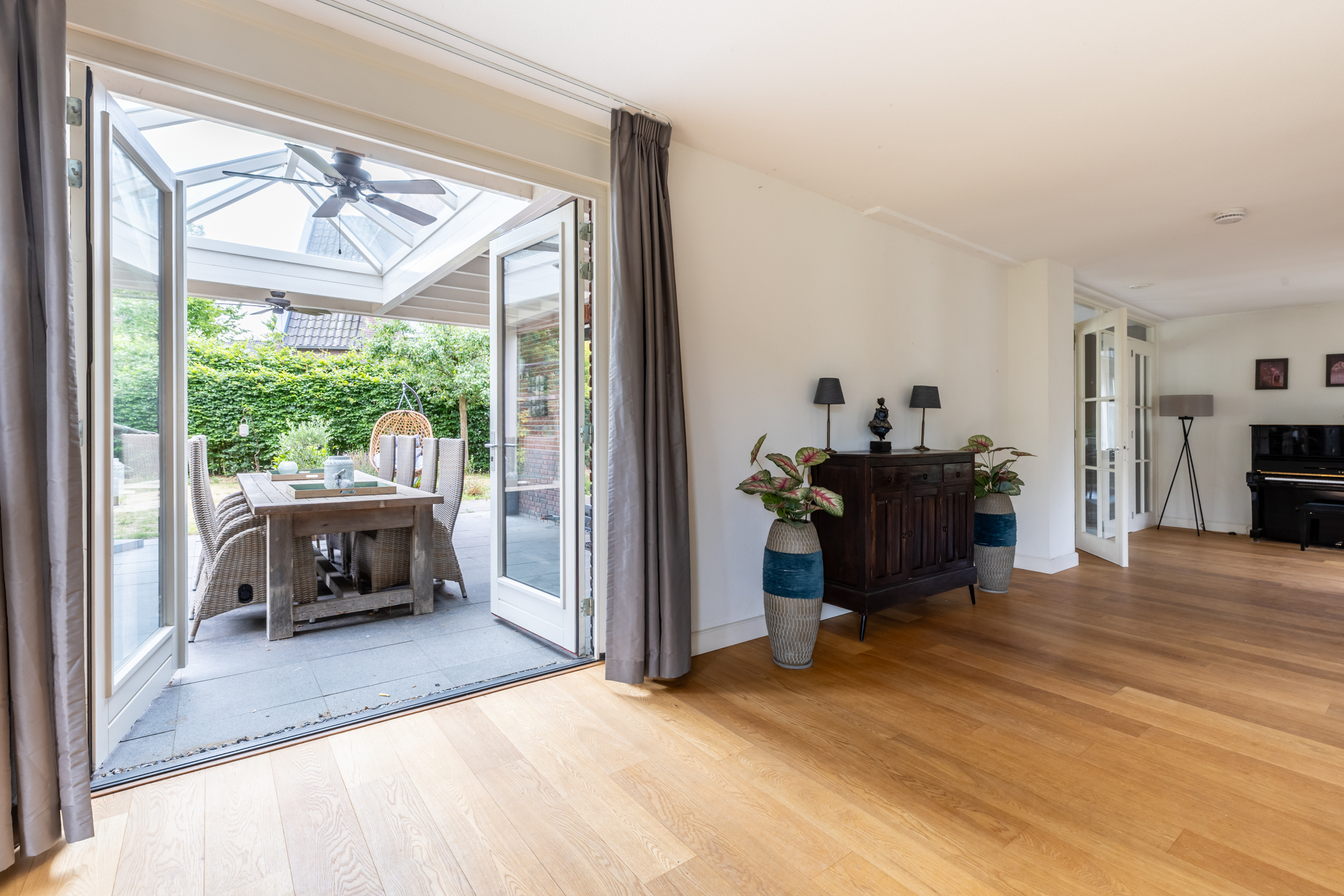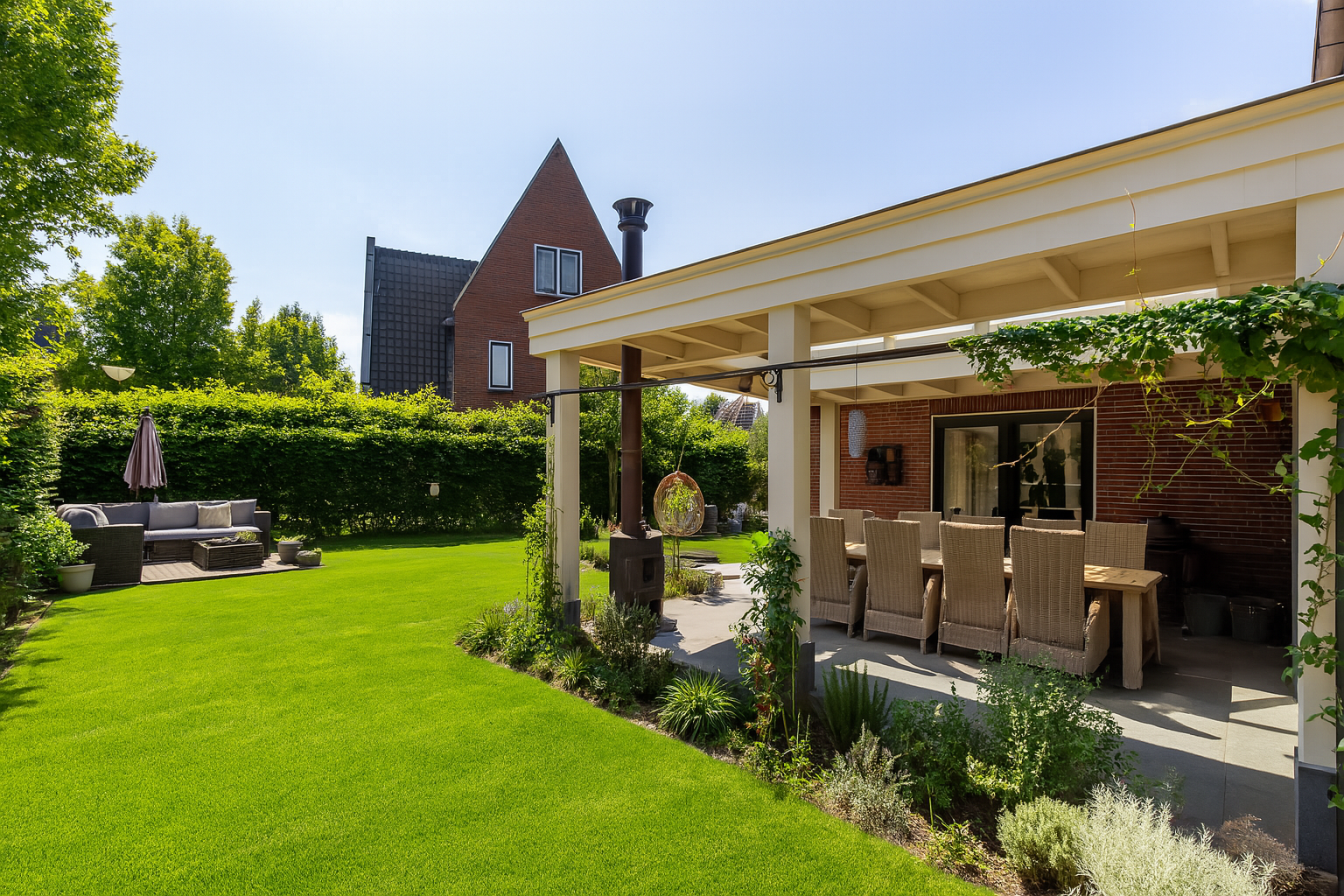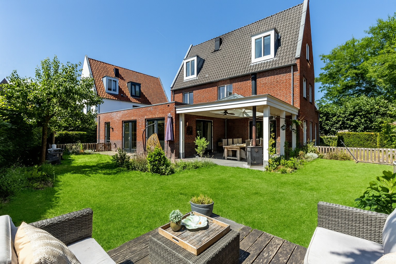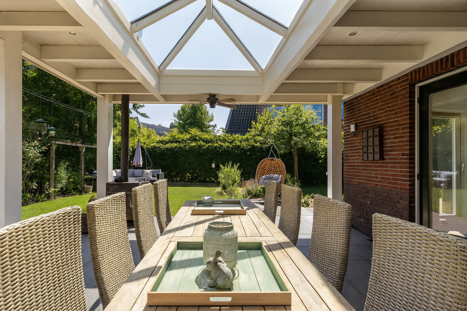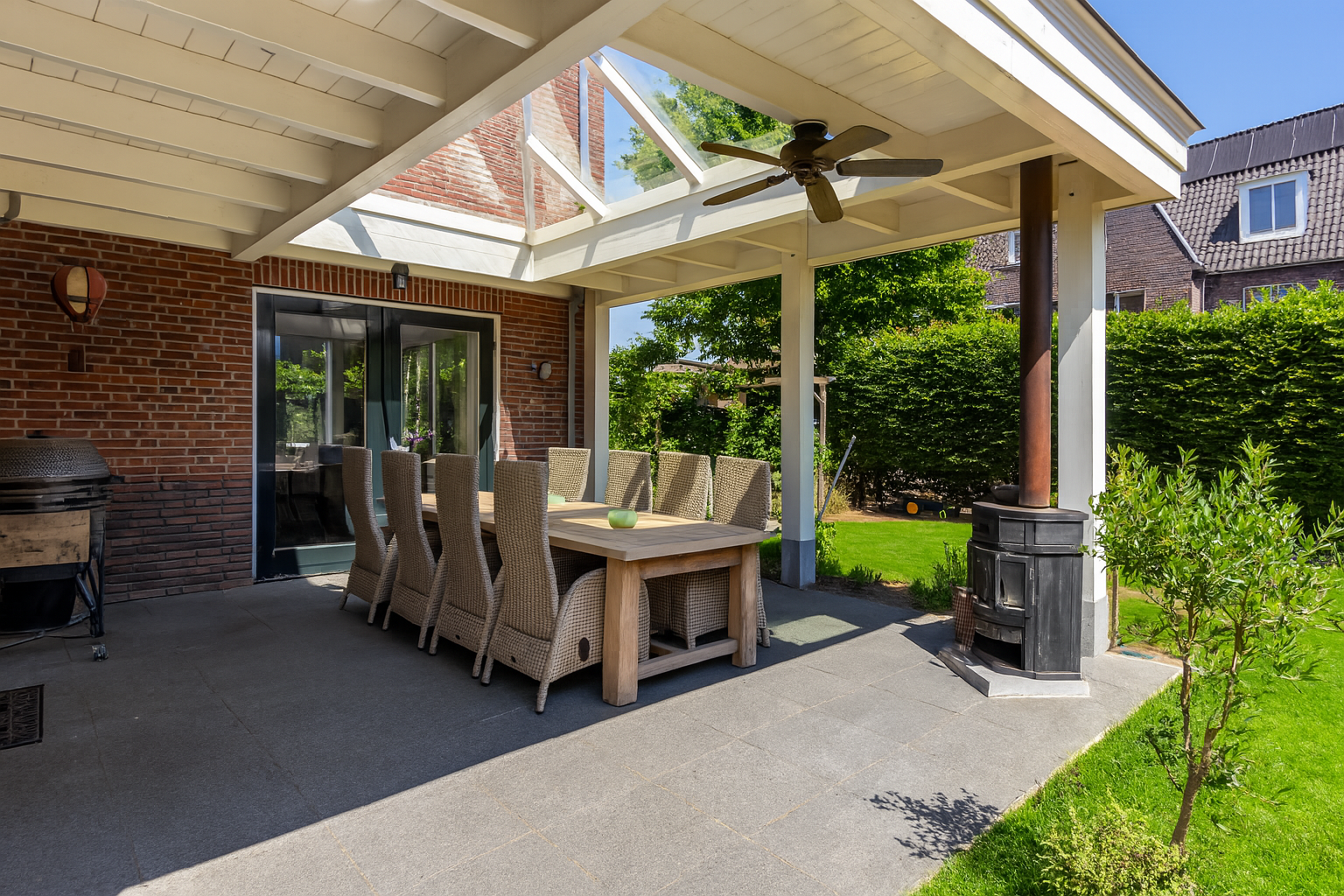Aan de tuinzijde geven dubbele openslaande deuren toegang tot de riante, deels overdekte terrassen. De overkapping is uitgerust met een lichtstraat, ventilator en houtkachel, perfect voor lange zomeravonden en gezellige etentjes in elk seizoen.