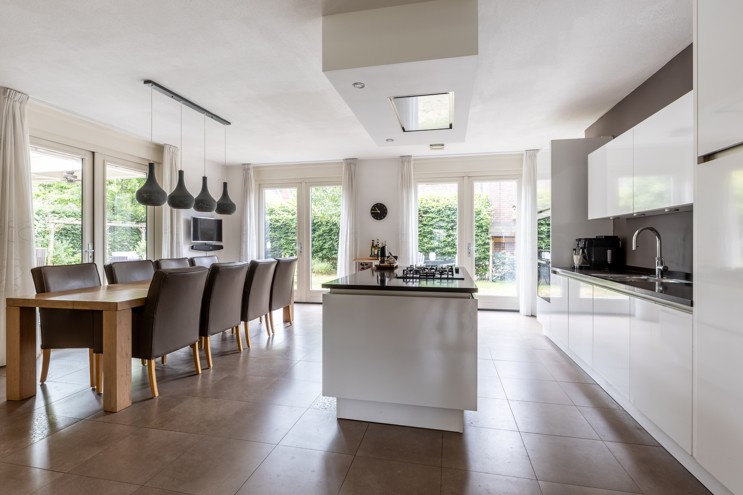 De ruime, afsluitbare leefkeuken is volledig ingericht met een centraal kookeiland met 5-pits gaskookplaat en spoelgedeelte met Quooker, een praktische kastenwand met ingebouwde apparatuur: koelkast, vaatwasser, oven en combi-oven. Dankzij de royale opzet is er veel bergruimte, en de bijkeuken, eveneens voorzien van keukenkasten, biedt extra gemak. Drie openslaande deuren zorgen voor een mooie connectie met de tuin en de overkapping.