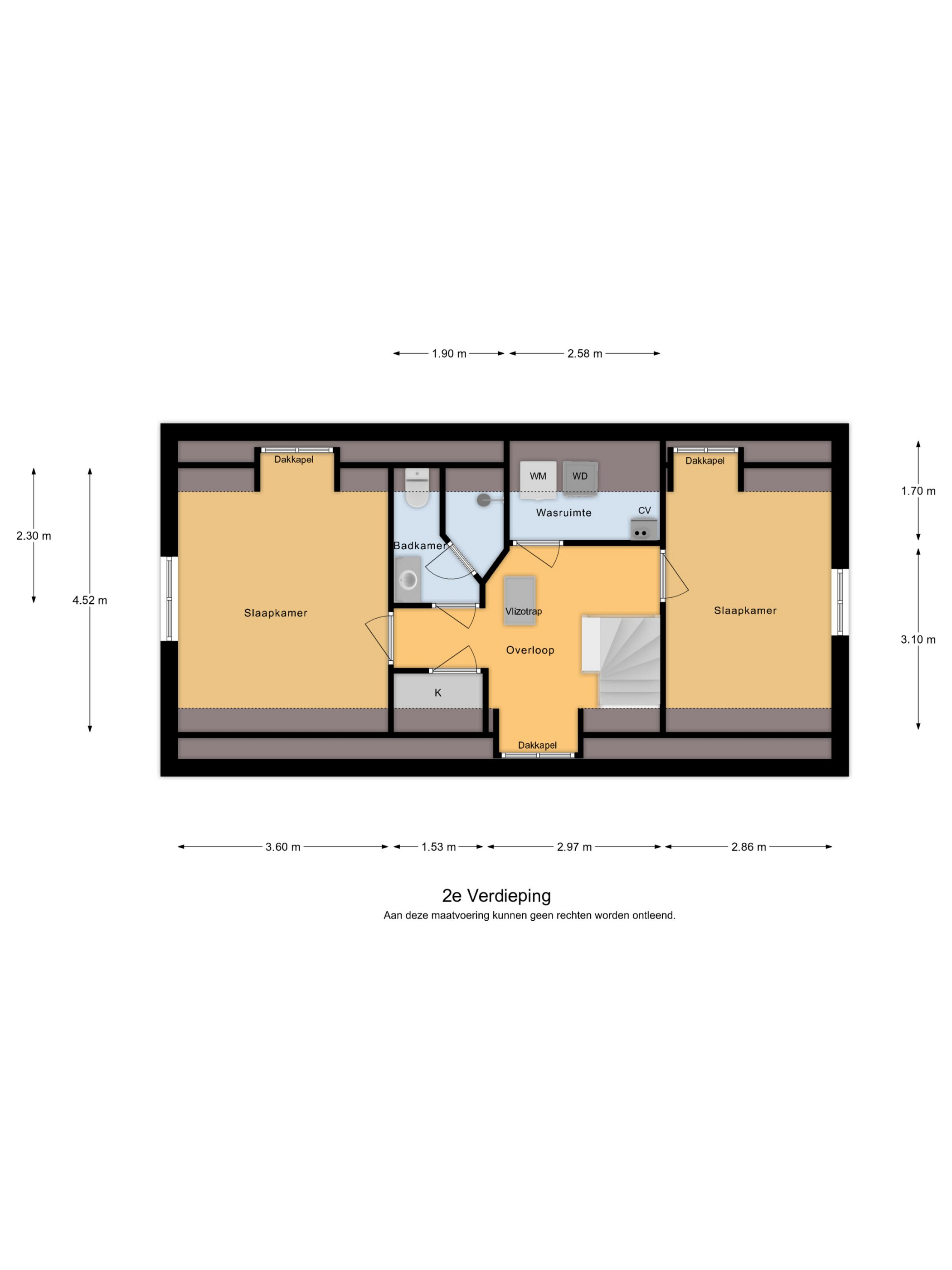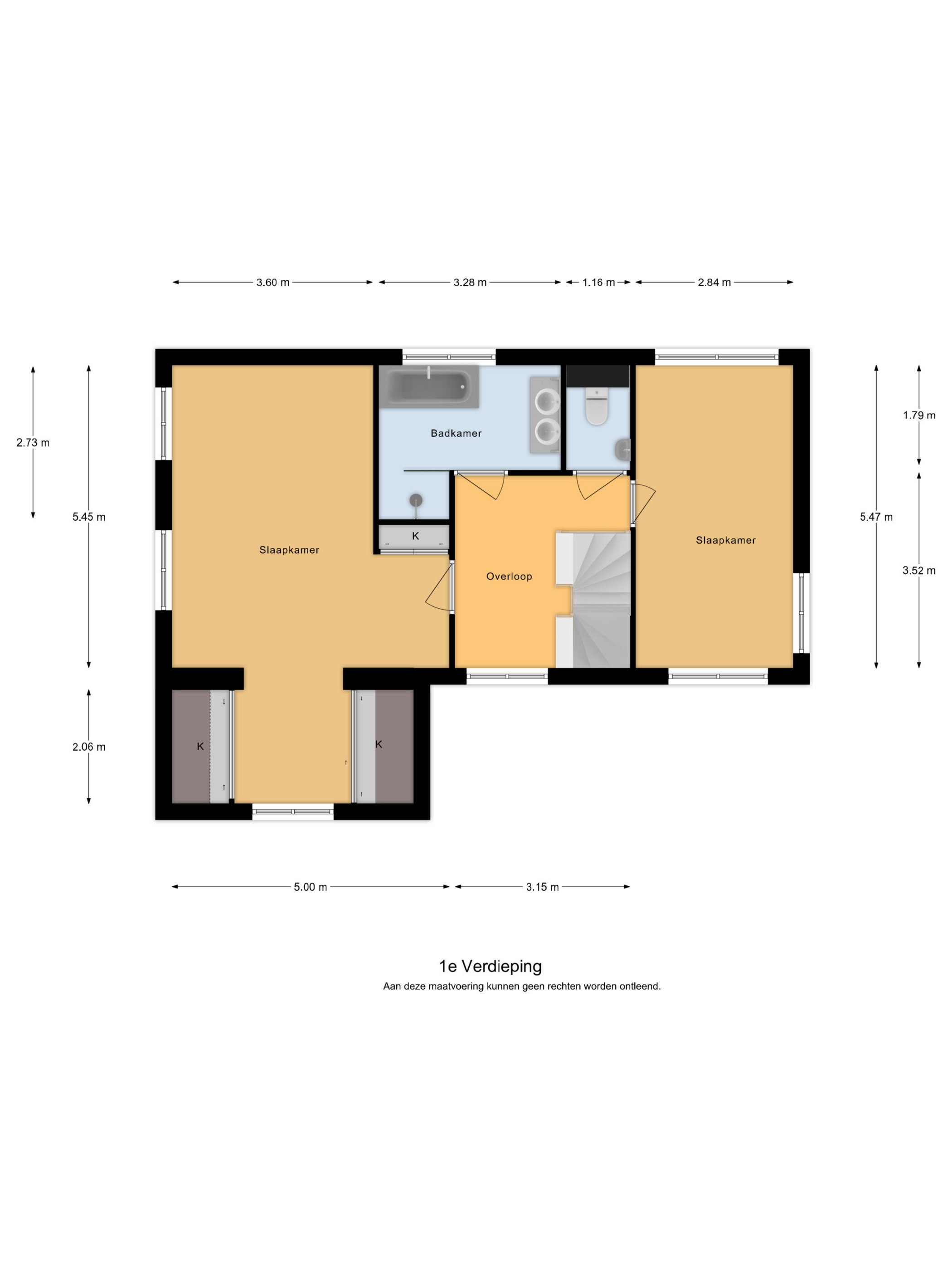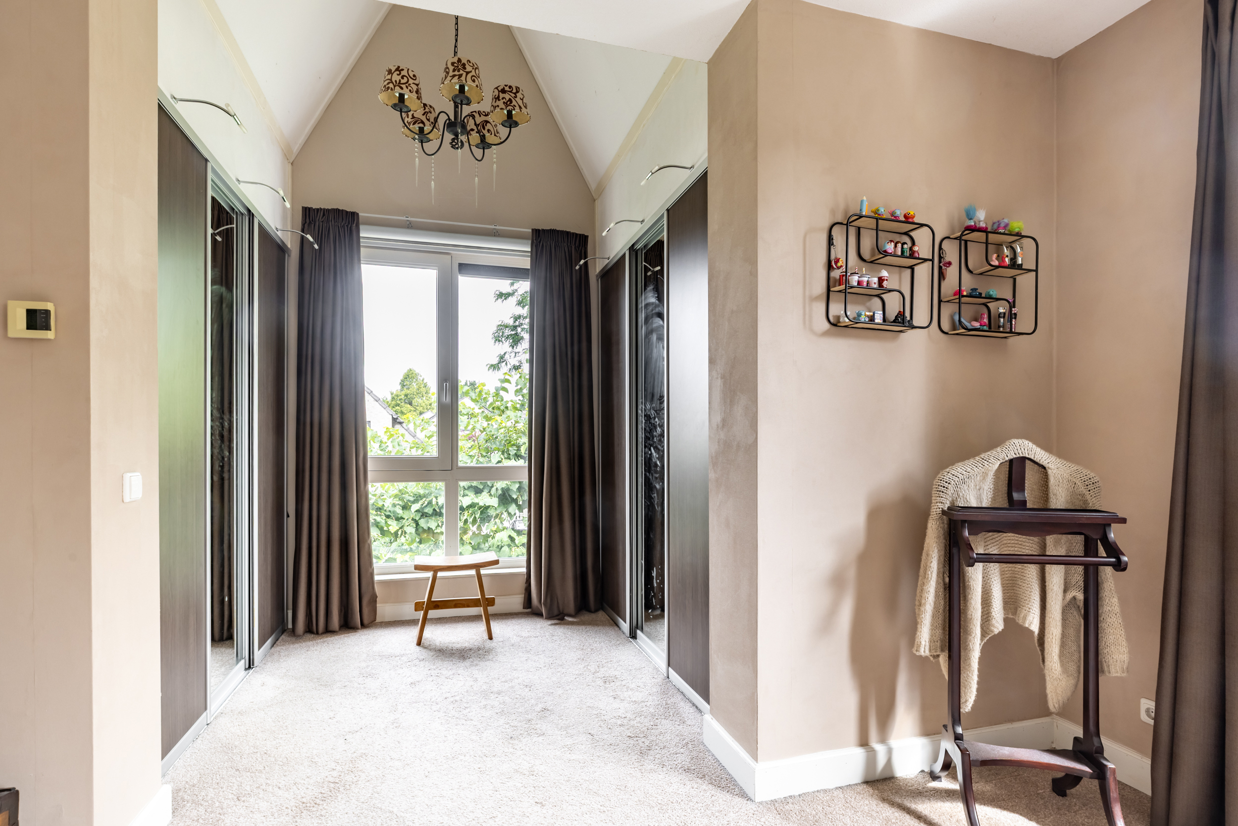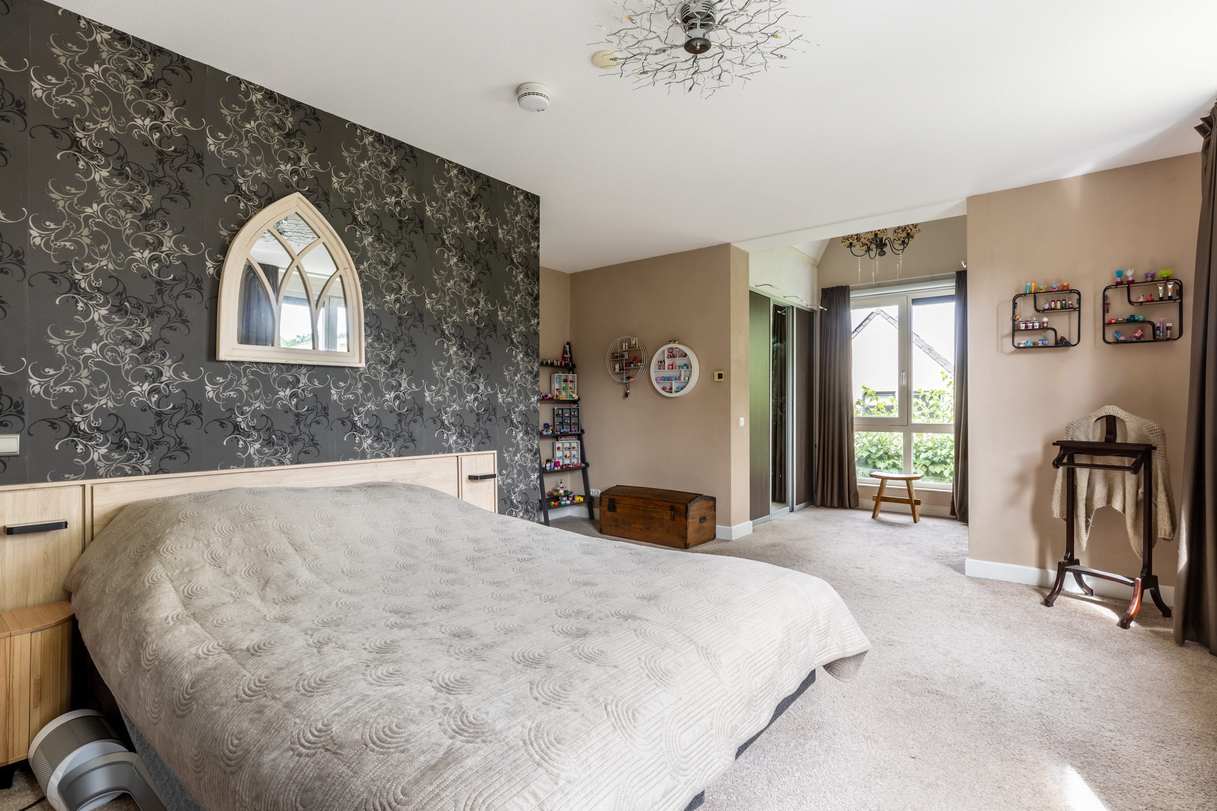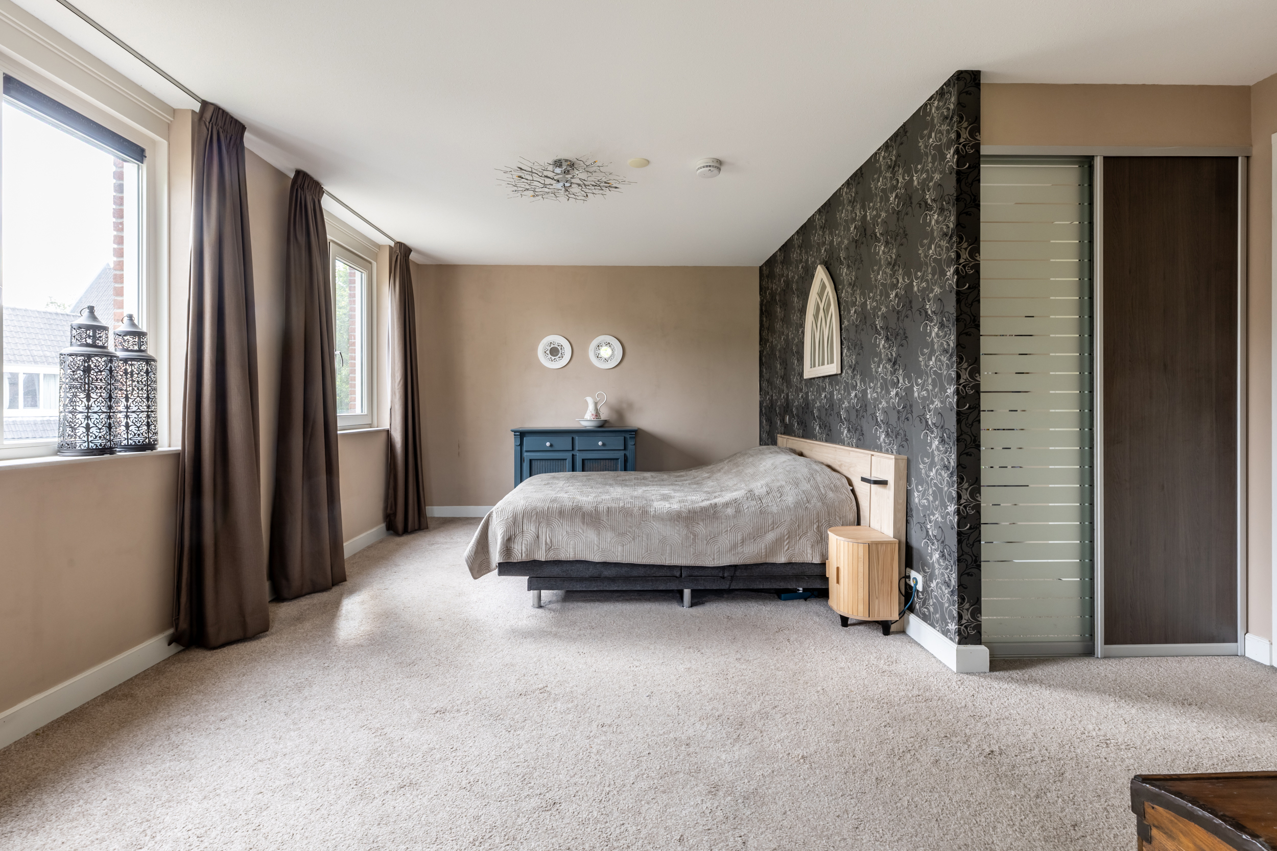 De eerste verdieping biedt toegang tot twee slaapkamers, een apart toilet en een royale badkamer. De ouderslaapkamer (ca. 27 m²) is indrukwekkend ruim en beschikt over zowel een inbouwkast als een inloopkast. De speelse indeling met schuine kap versterkt het ruimtelijk gevoel.