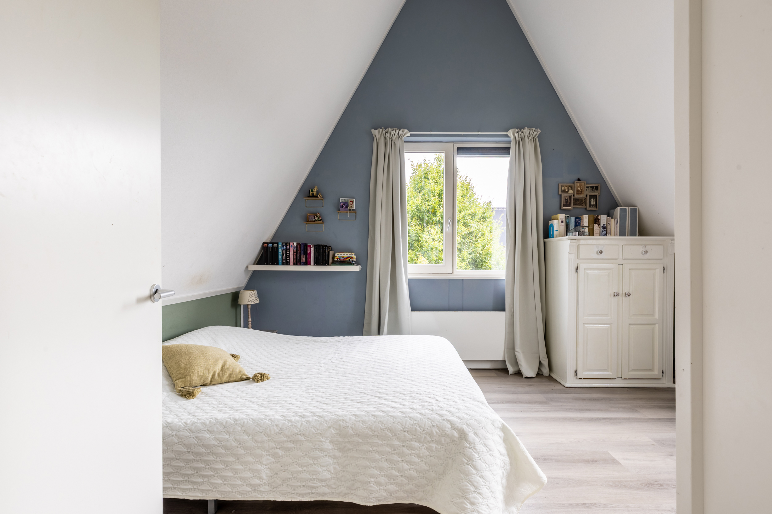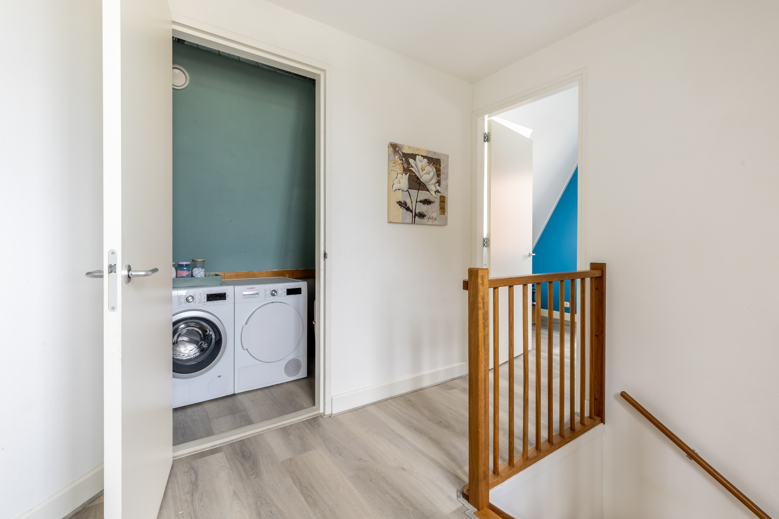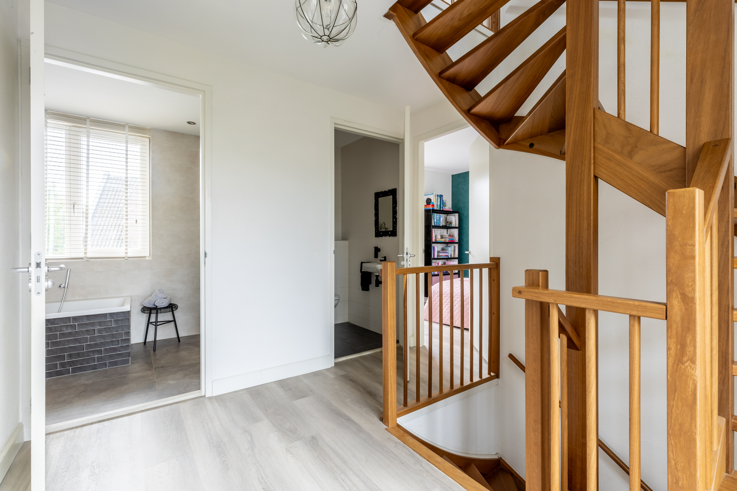 Op de tweede verdieping vind je nog twee fijne slaapkamers, een tweede badkamer, aparte wasruimte, bergkast en toegang tot de bergzolder. De hoge nok, dakkapel en dakramen zorgen ook hier voor een speels en licht geheel.