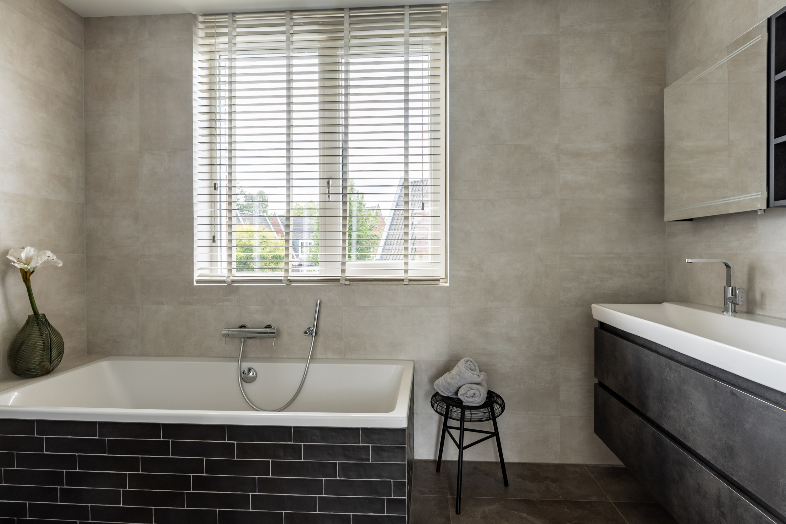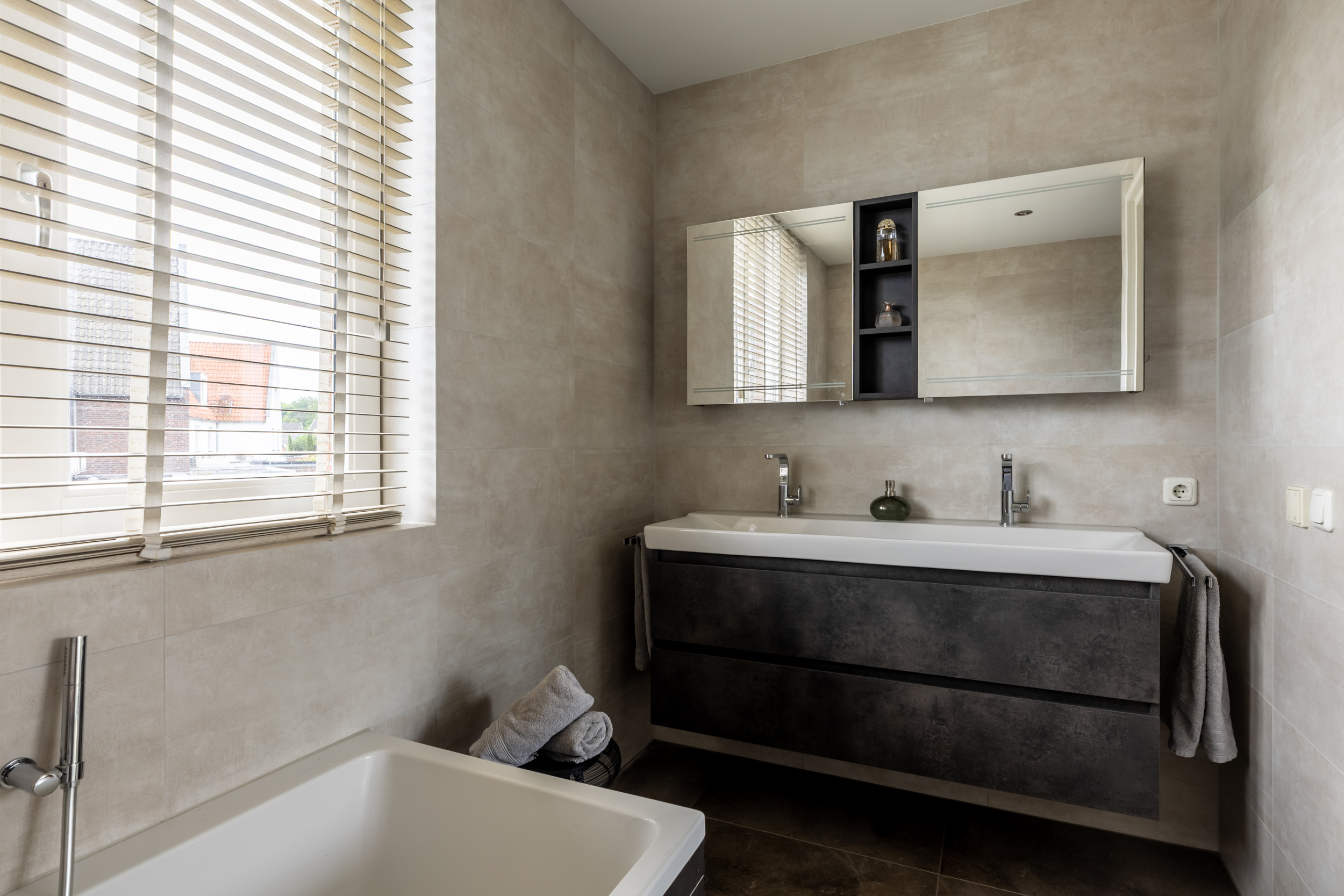 De comfortabele badkamer is compleet uitgerust met een ligbad, inloopdouche en dubbel wastafelmeubel met royale spiegelkast. Een raam zorgt voor daglicht en natuurlijke ventilatie, naast de aanwezige mechanische afzuiging.