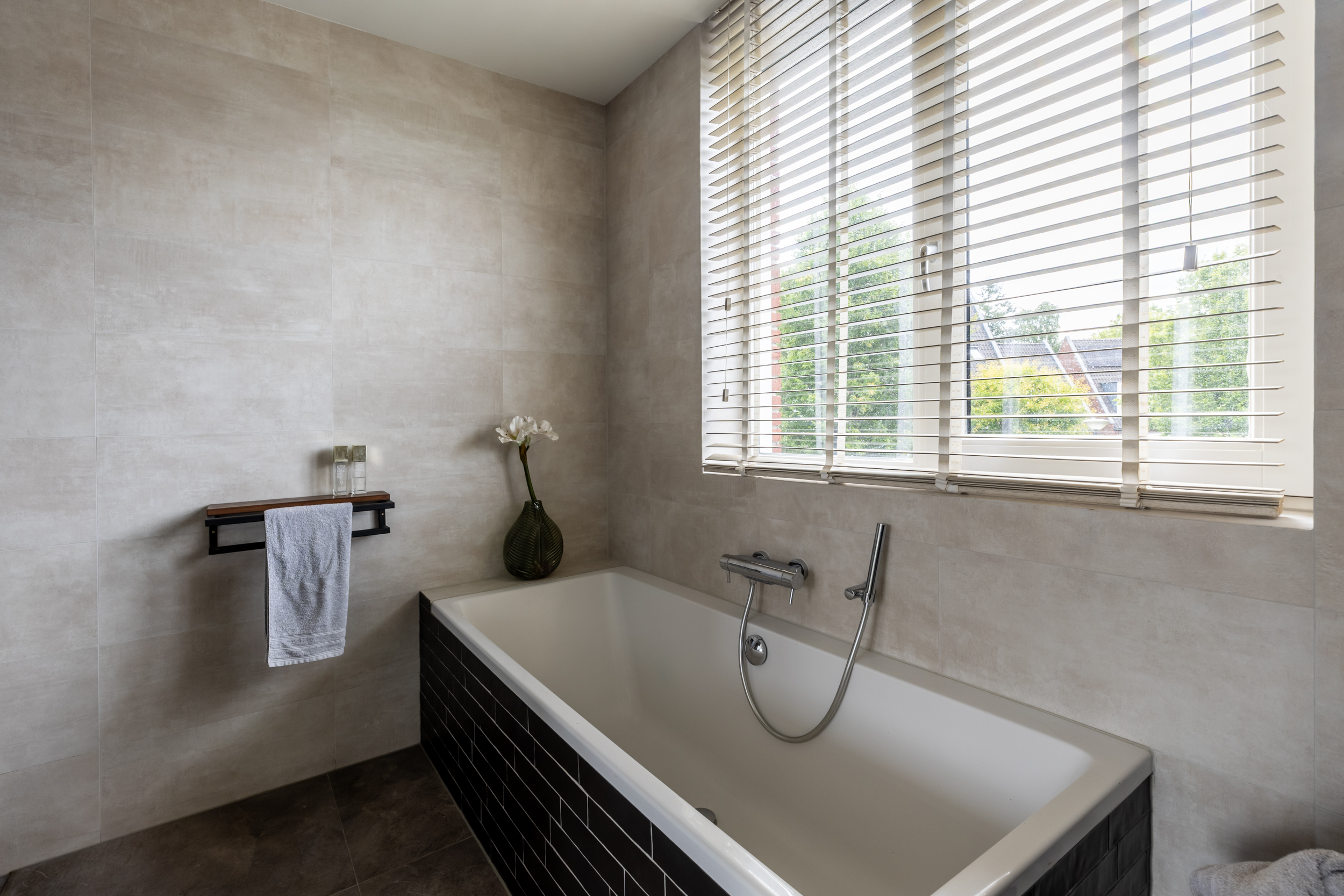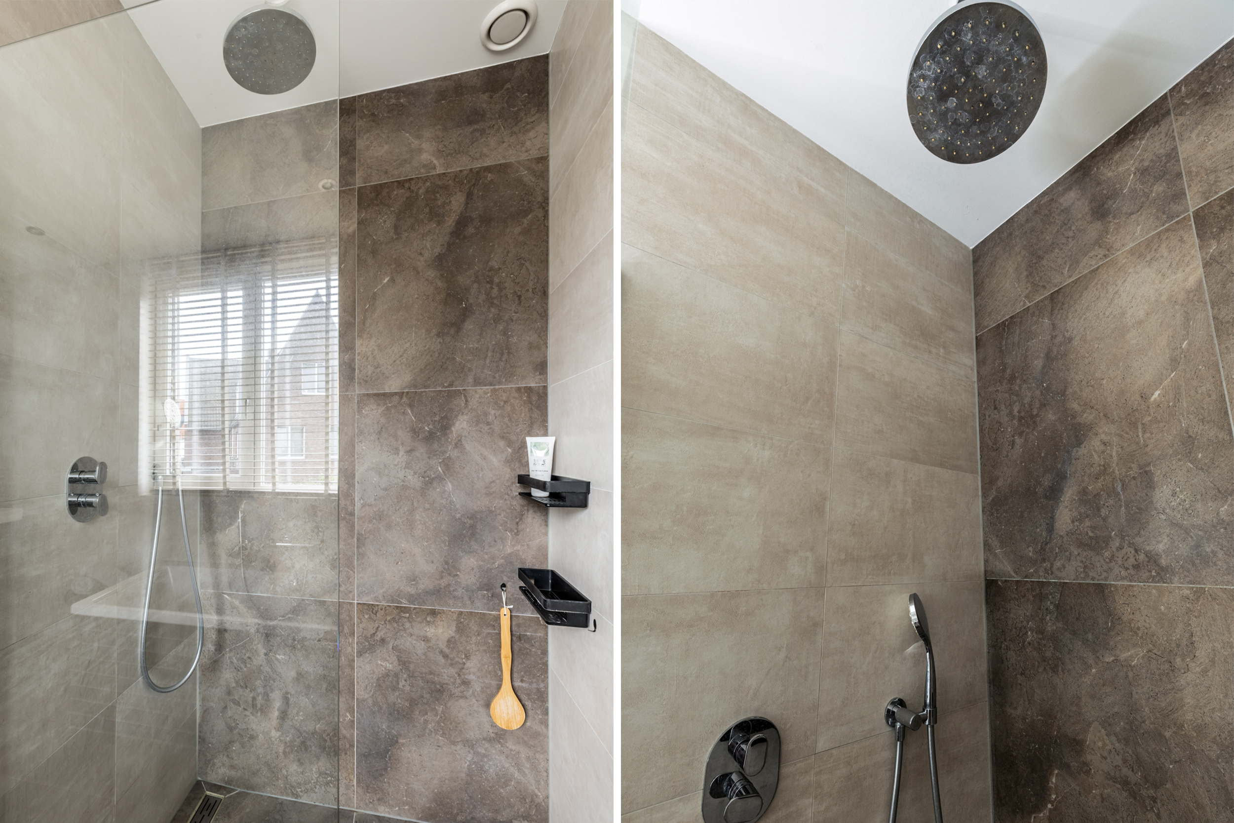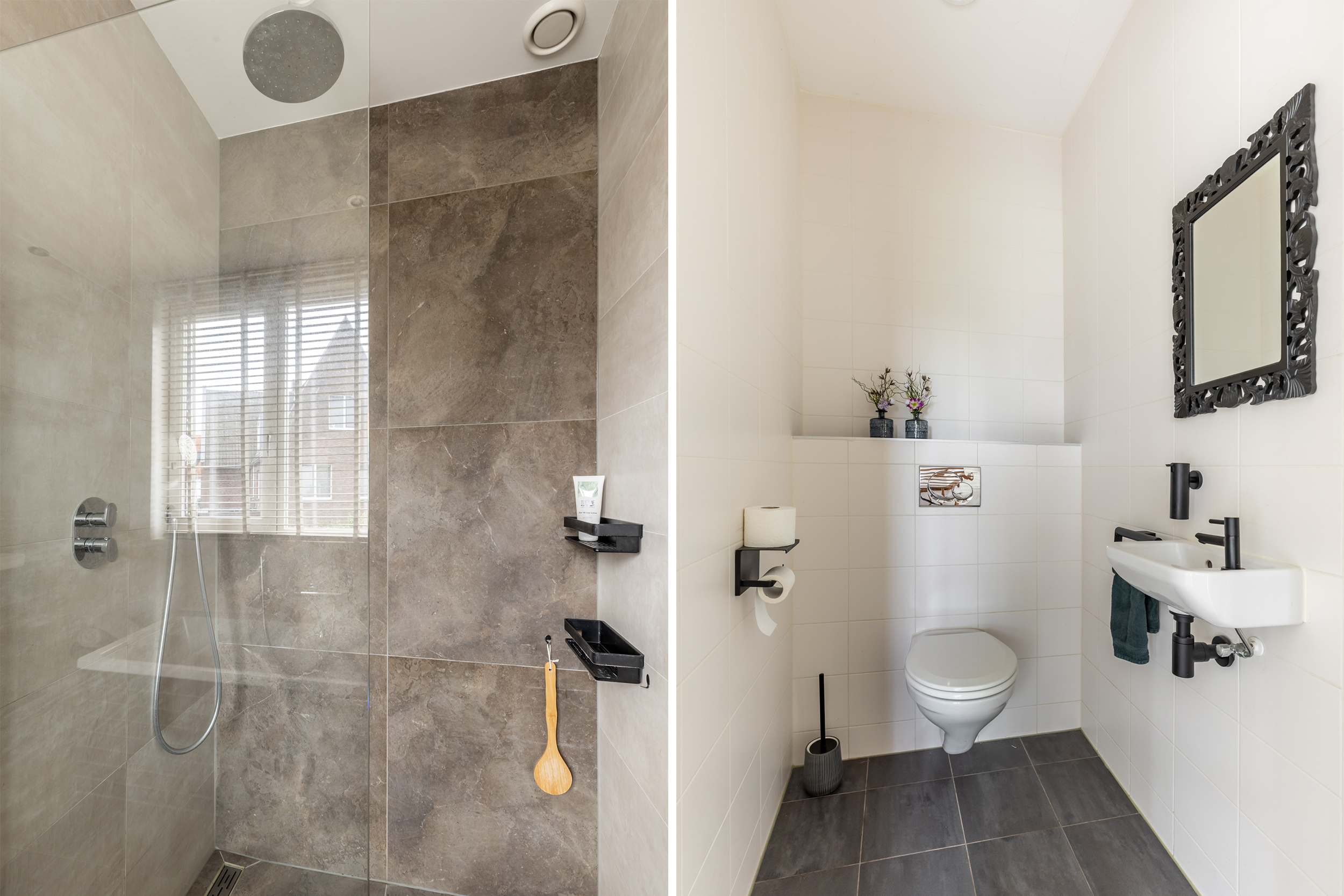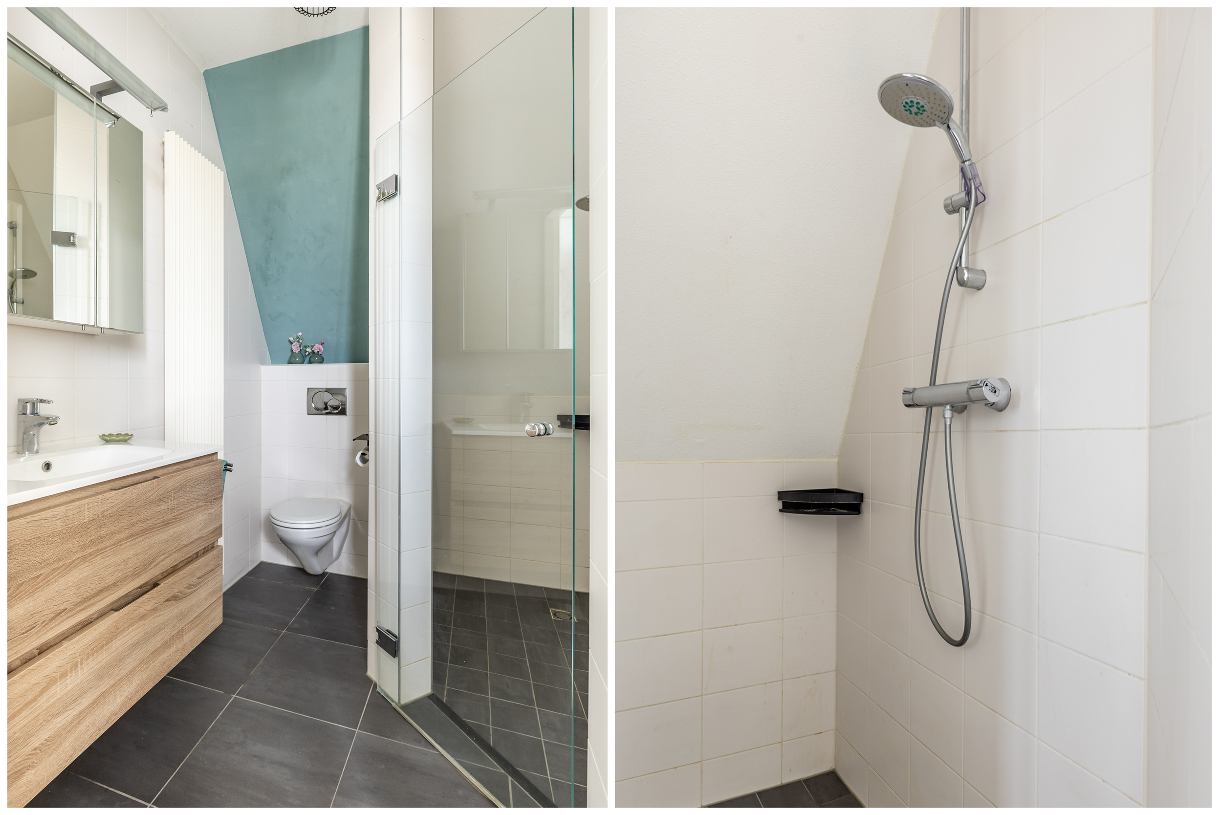 De tweede badkamer is fris en modern afgewerkt met een douche, vrijhangend toilet en wastafelmeubel met spiegelkast, ideaal voor (oudere) kinderen, gasten of een au pair.