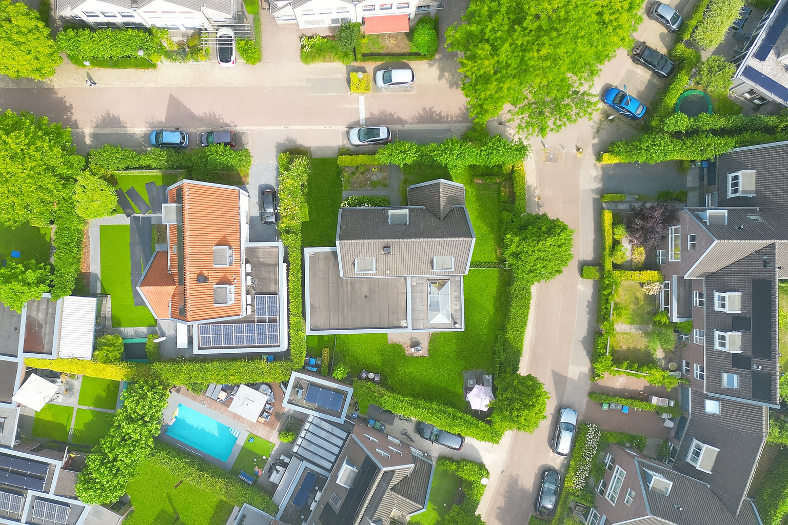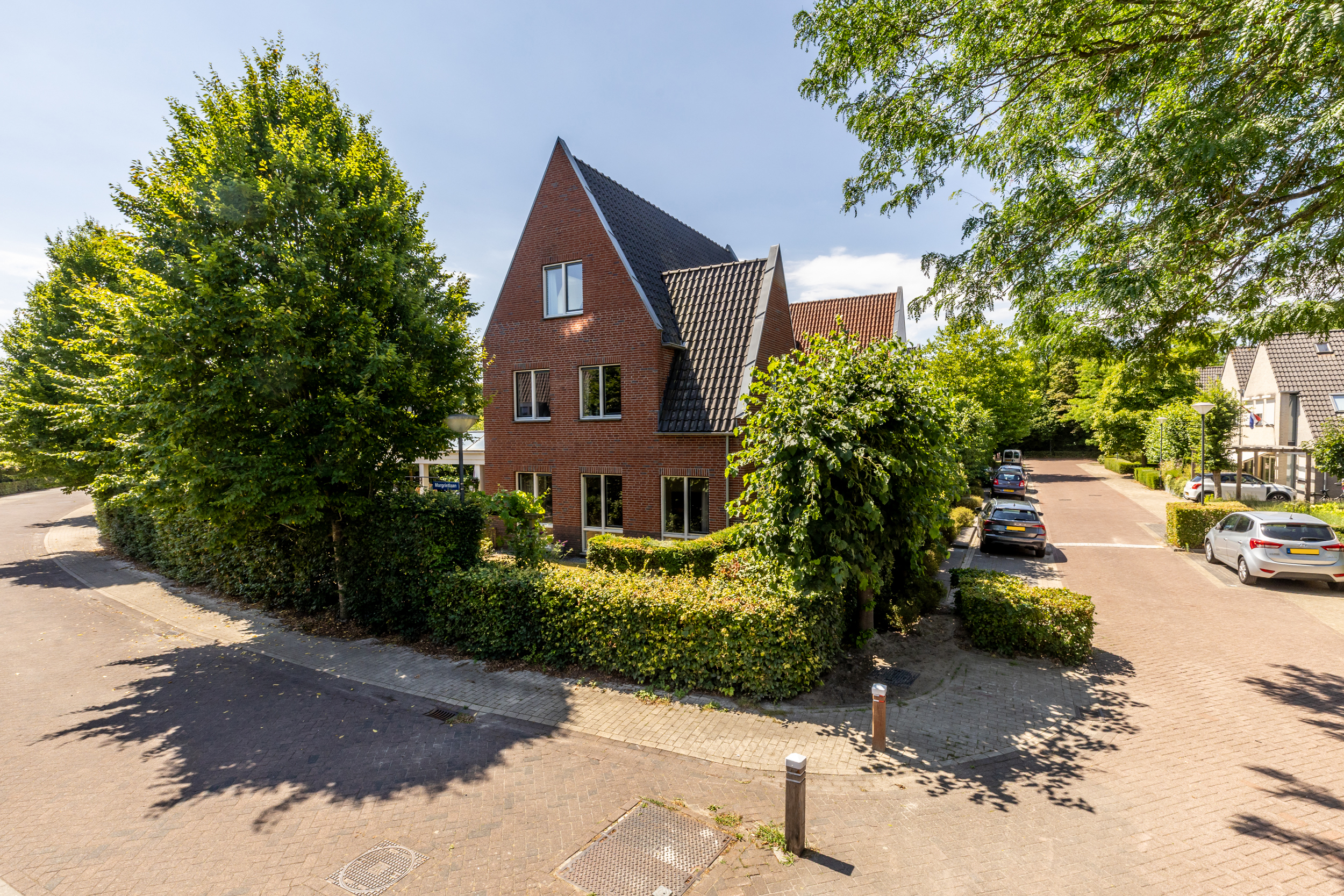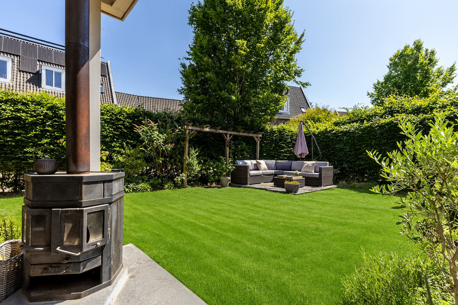 De tuin rondom de woning is fraai aangelegd en biedt volop privacy. Aan de voorzijde zorgen leibomen voor beschutting, aan de achterzijde garandeert een hoge beukenhaag een groene, rustige omgeving. De achtertuin ligt gunstig en is met zorg ingericht, inclusief de luxe overkapping: jouw tweede woonkamer in de zomer.