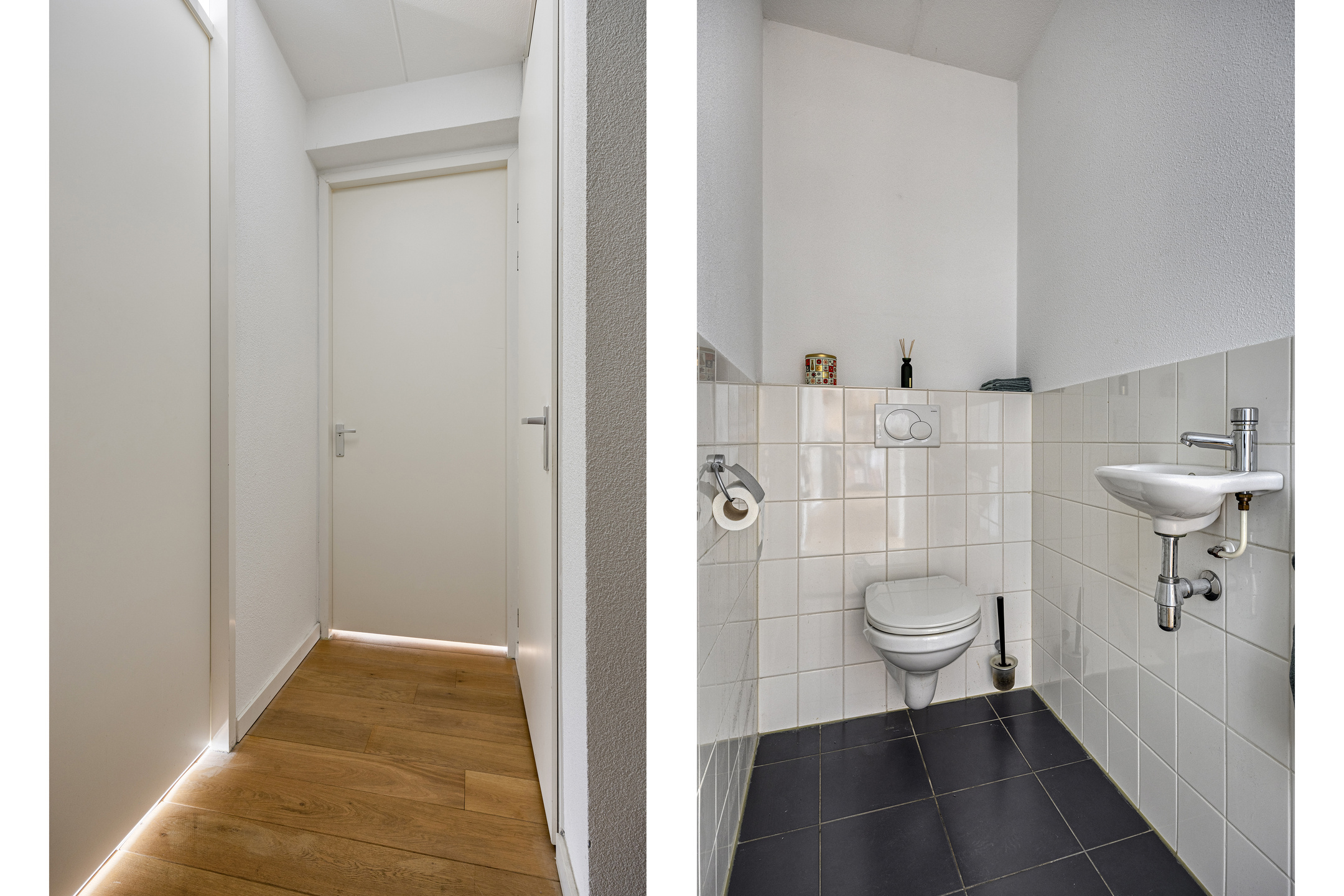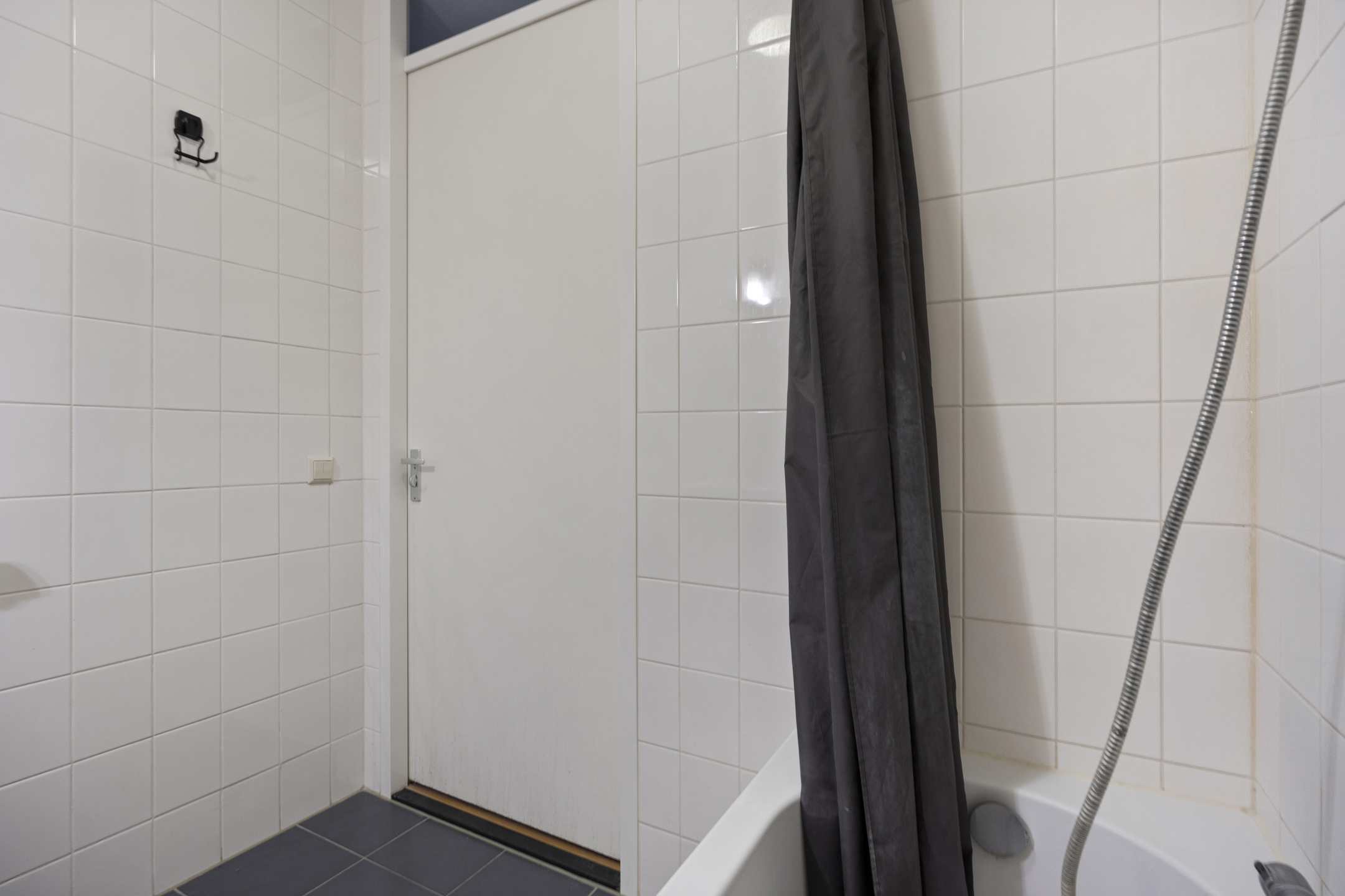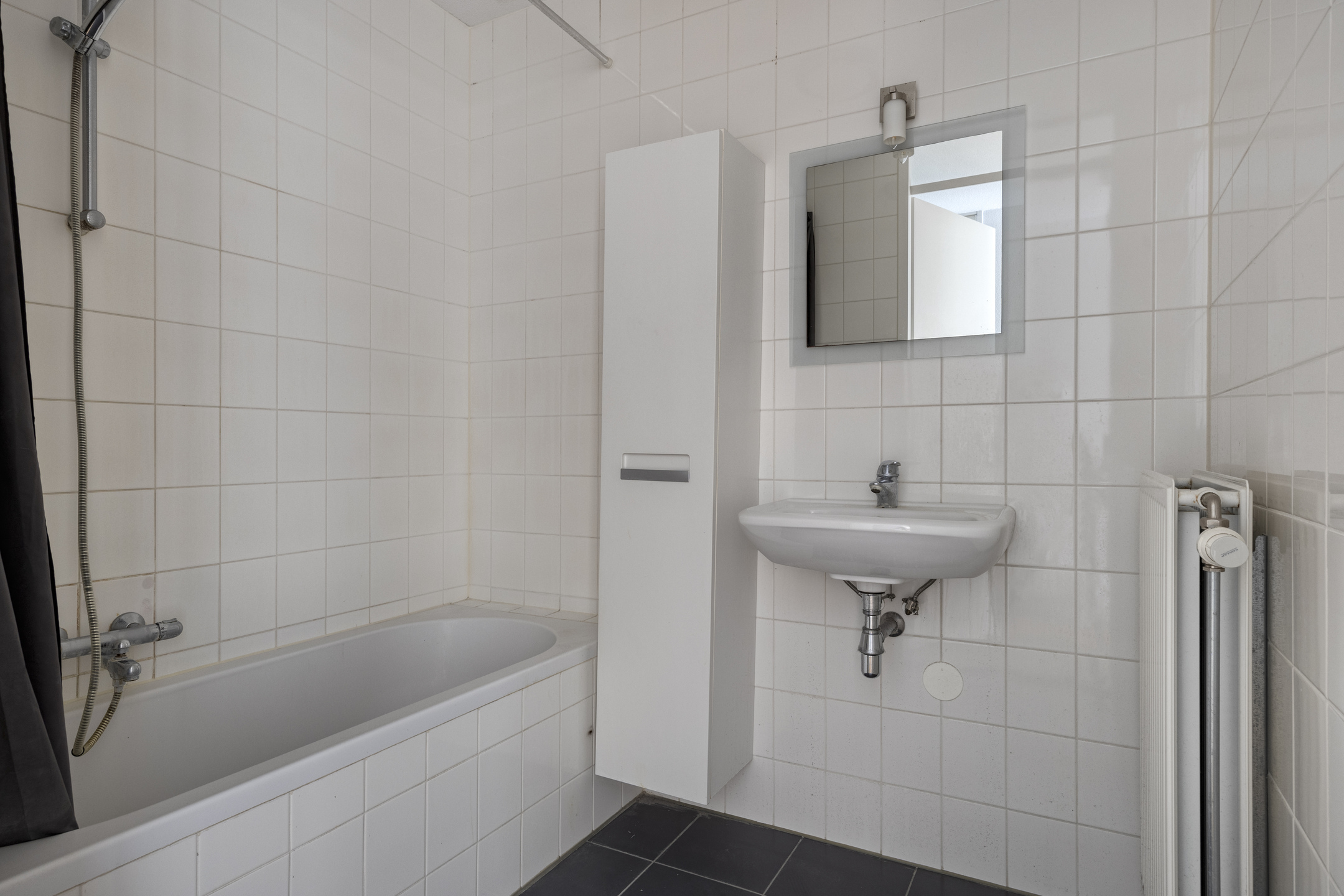De badkamer is keurig afgewerkt, voorzien van tegelvloer en wandtegels tot aan het plafond. Een ligbad met douche en scherm, een wastafel met spiegel, een praktisch meubel en een radiator. De separate toiletruimte beschikt over een zwevend closet, een fonteintje en heeft een mooie donkere tegelvloer en een lichte tegel tot halfweg de wanden.