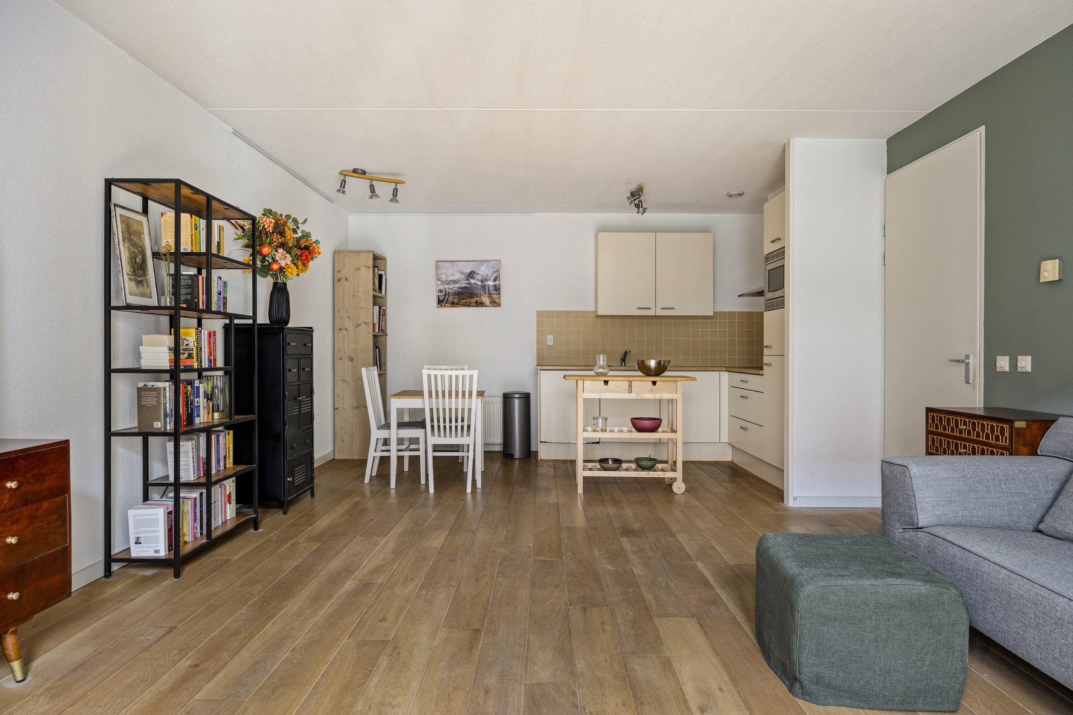 In de hal en woonkamer/keuken ligt een prachtige, strak gelegde moderne licht eiken planken vloer. De slaapkamer is voorzien van vloerbedekking. Al deze ruimtes zijn afgewerkt met hoge, witte plinten. De woonkamer is ruim met een prettige lichtinval en biedt uitzicht op de fraaie binnentuin. De dubbele deuren geven toegang tot het balkon.
