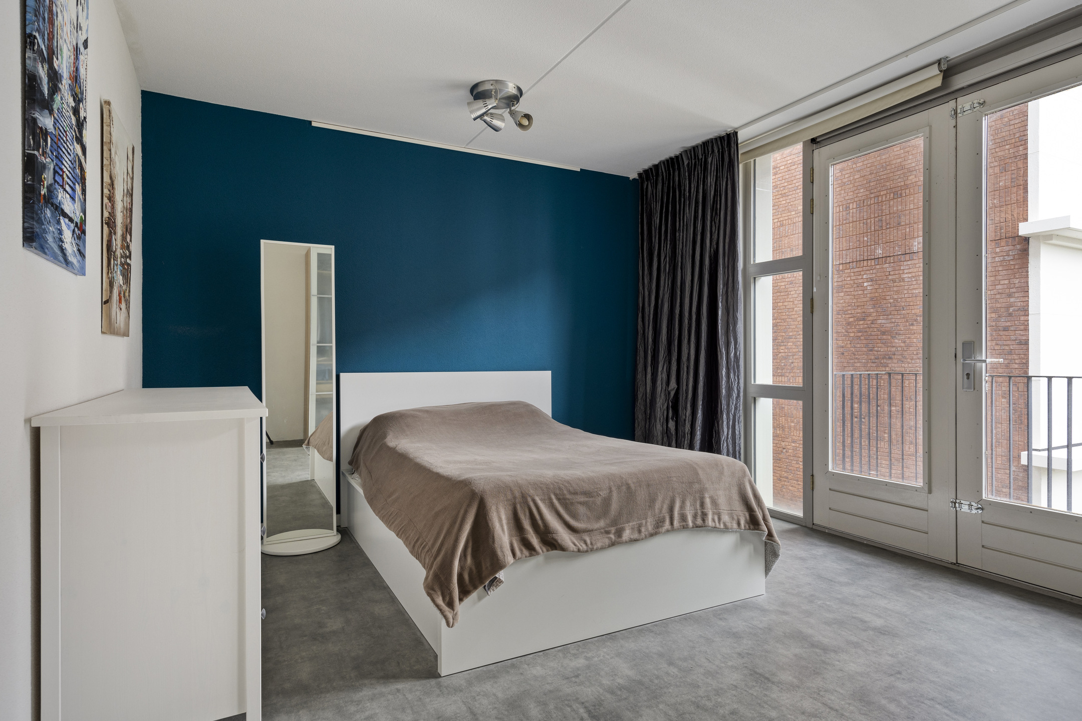 De slaapkamer biedt naast ruimte voor een tweepersoons bed ook de mogelijkheid voor plaatsing van een grote kastenwand en bureau. Middels dubbele deuren heeft u toegang tot het 2e balkon, ook met uitzicht op de binnentuin.