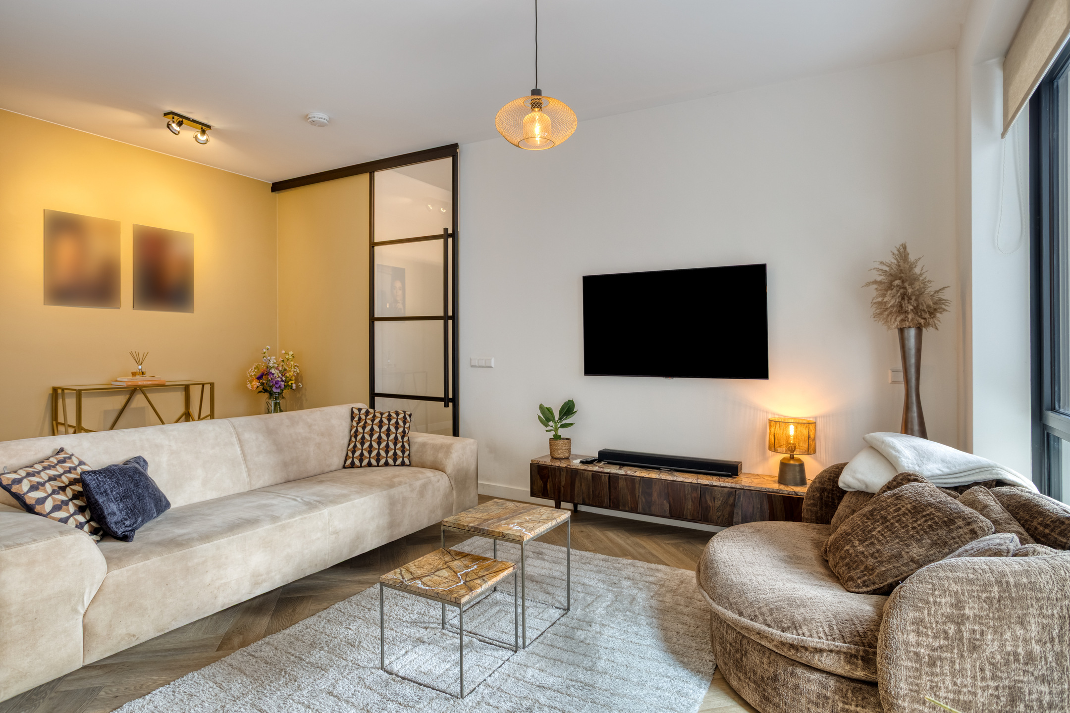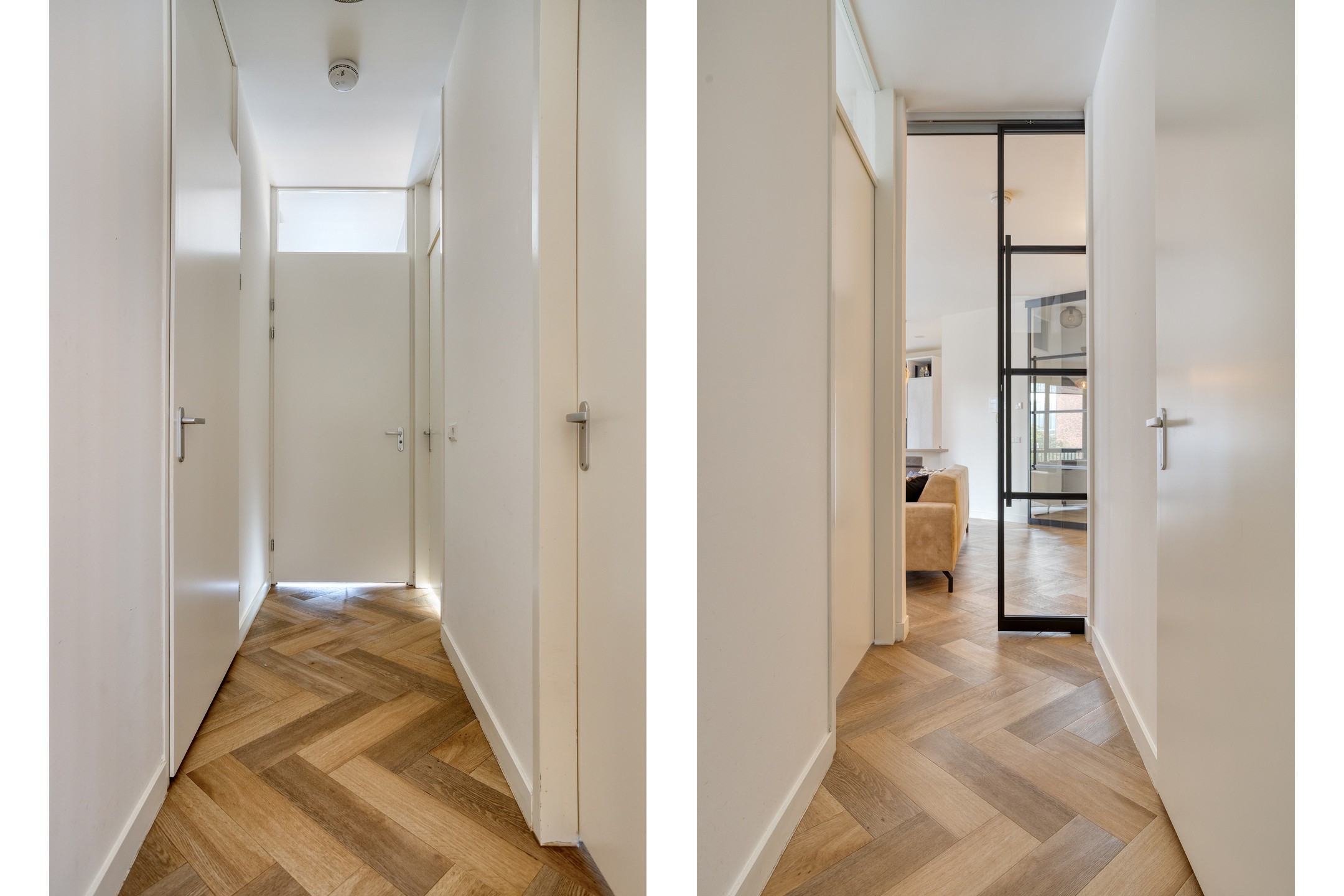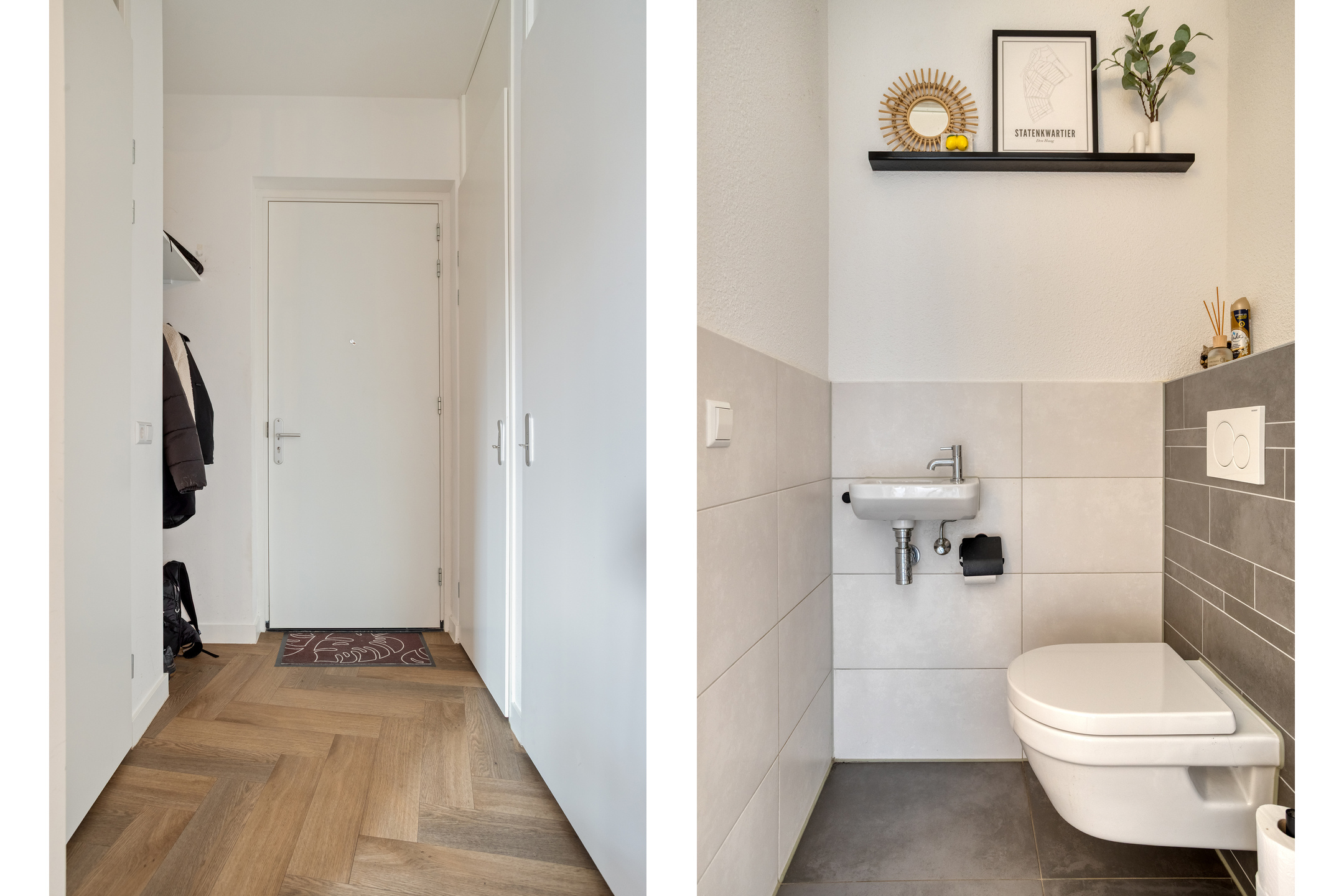 Via de entree bereik je de hal met garderoberuimte en een modern toilet met hangcloset en fonteintje. Vanuit hier stap je binnen in de lichte woonkamer met grote raampartijen die zorgen voor veel natuurlijk daglicht. De ruimte is voorzien van een prachtige visgraat vloer en stijlvolle stalen glazen deuren met een softclosesysteem, die het geheel een luxe en warme uitstraling geven.