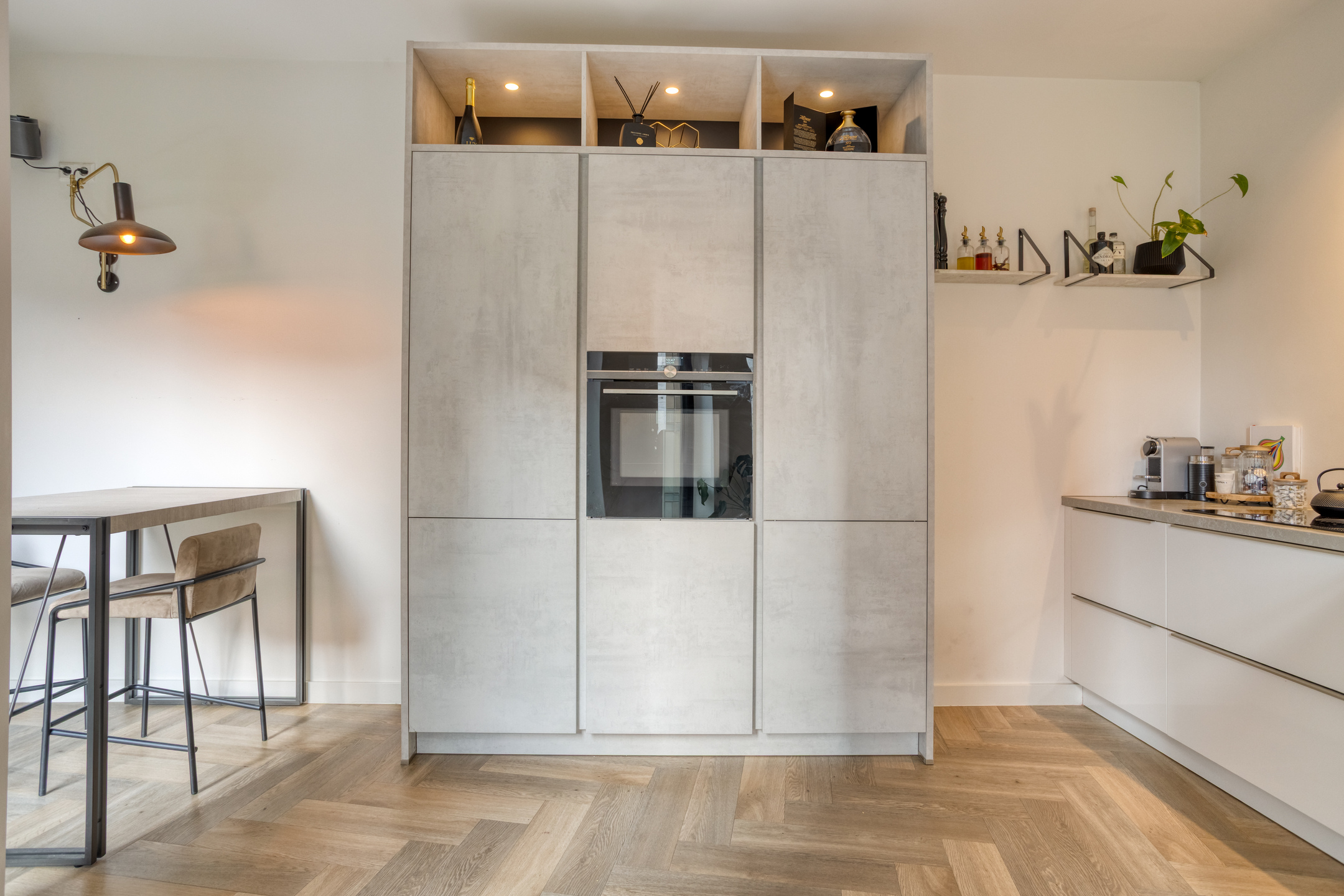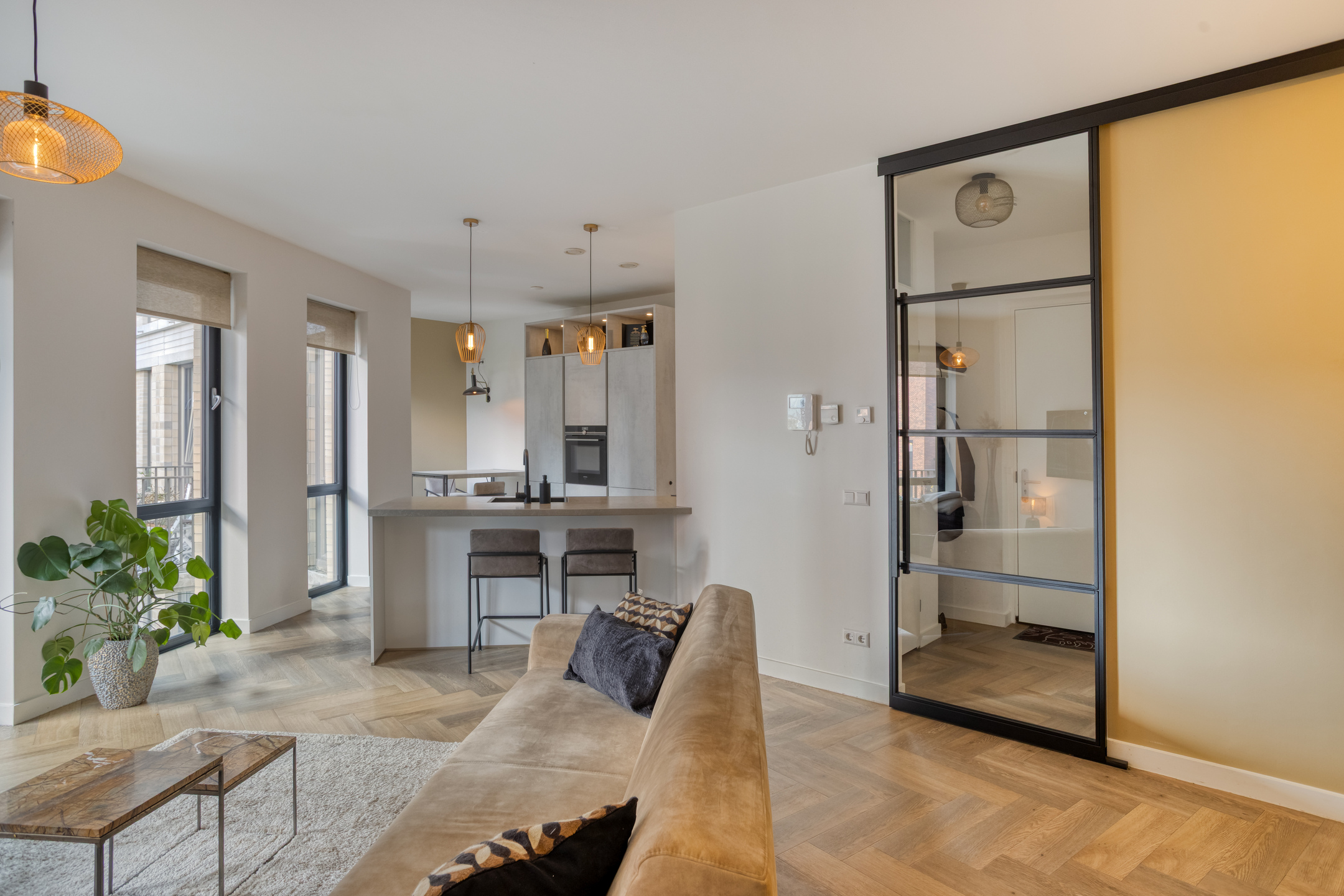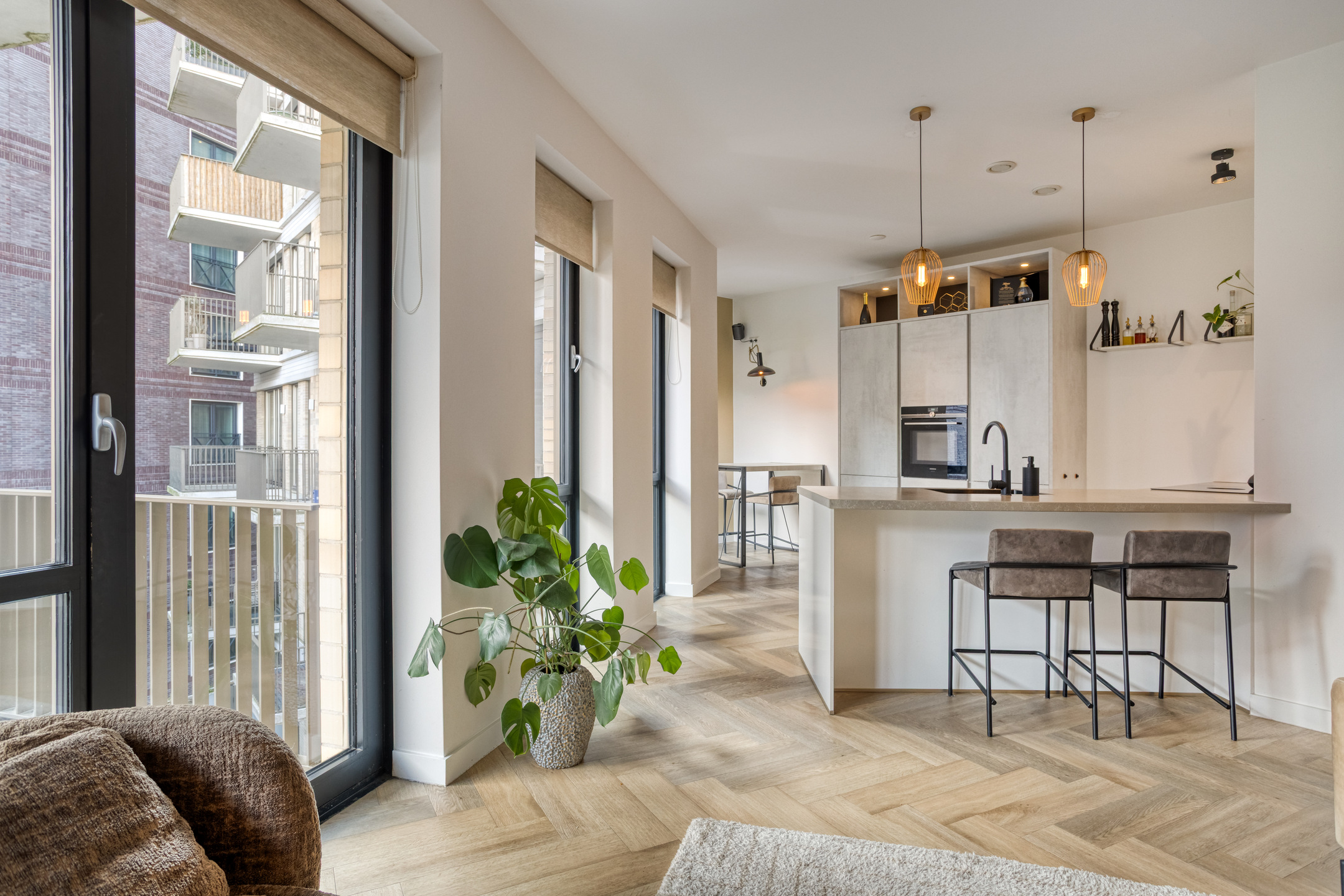 De open keuken vormt het hart van het appartement. Deze is uitgerust met een modern spoeleiland dat de keuken op een natuurlijke manier met de woonkamer verbindt. Verder beschikt de keuken over een ruime kastenwand en hoogwaardige inbouwapparatuur, waaronder een koelkast, vriezer, combi oven/magnetron en kookplaat met geïntegreerd afzuigsysteem.