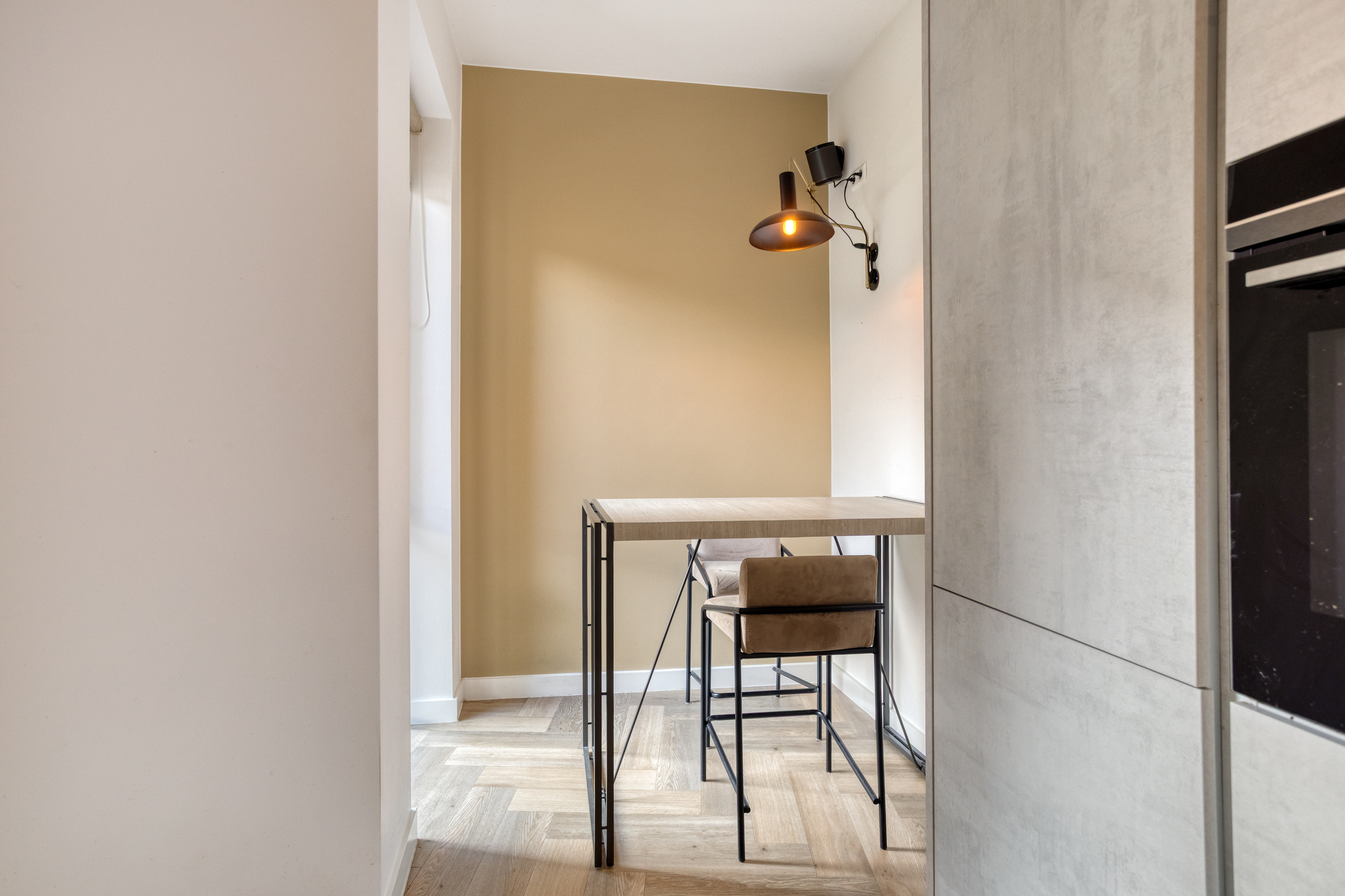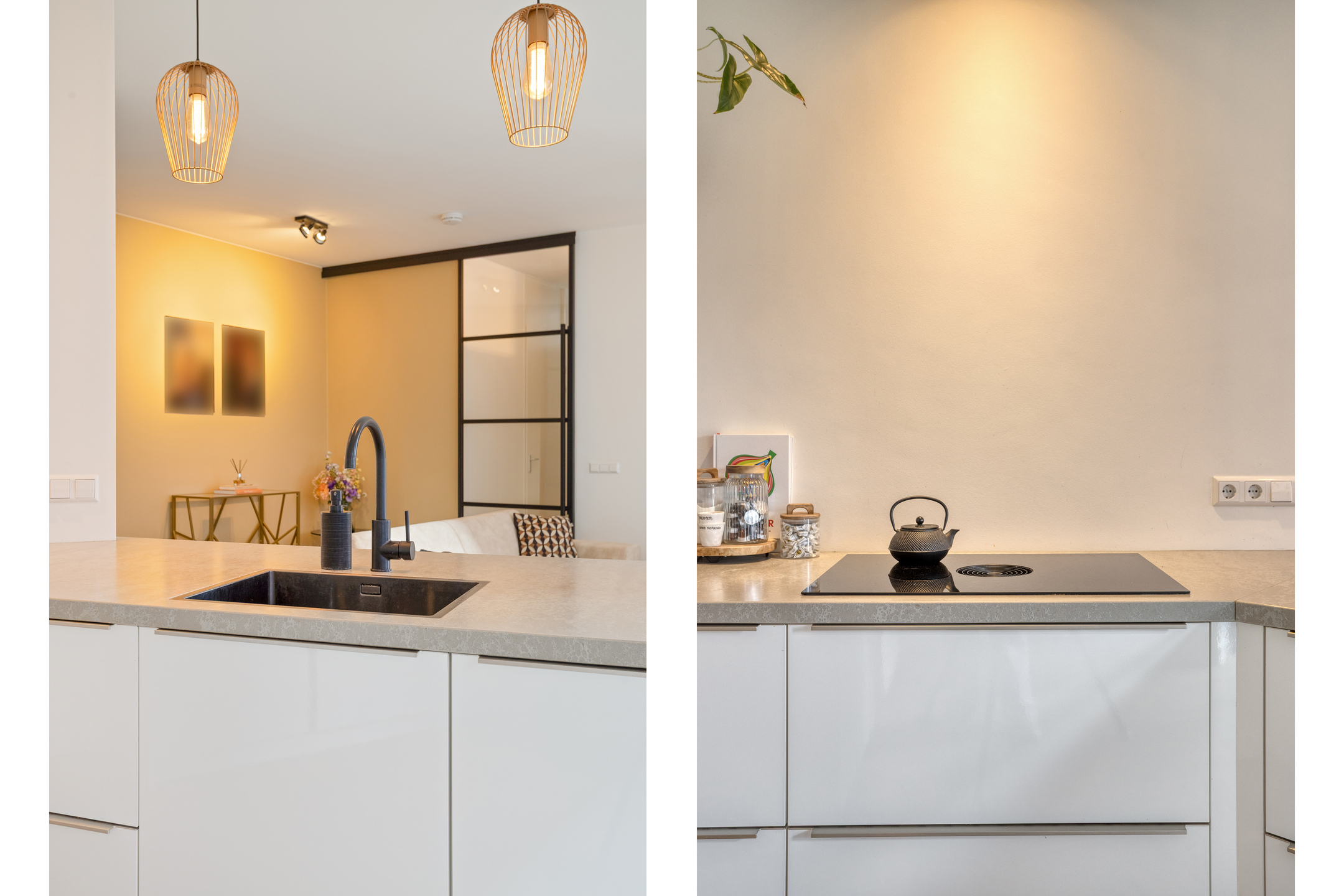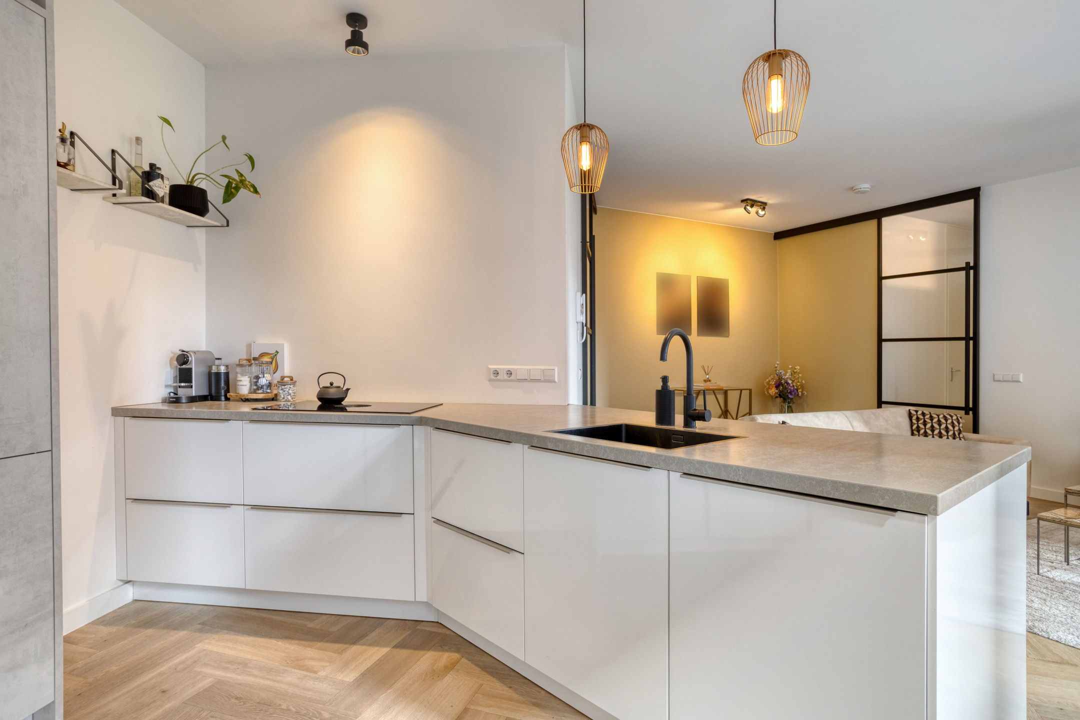 De open keuken vormt het hart van het appartement. Deze is uitgerust met een modern spoeleiland dat de keuken op een natuurlijke manier met de woonkamer verbindt. Verder beschikt de keuken over een ruime kastenwand en hoogwaardige inbouwapparatuur, waaronder een koelkast, vriezer, combi oven/magnetron en kookplaat met geïntegreerd afzuigsysteem.