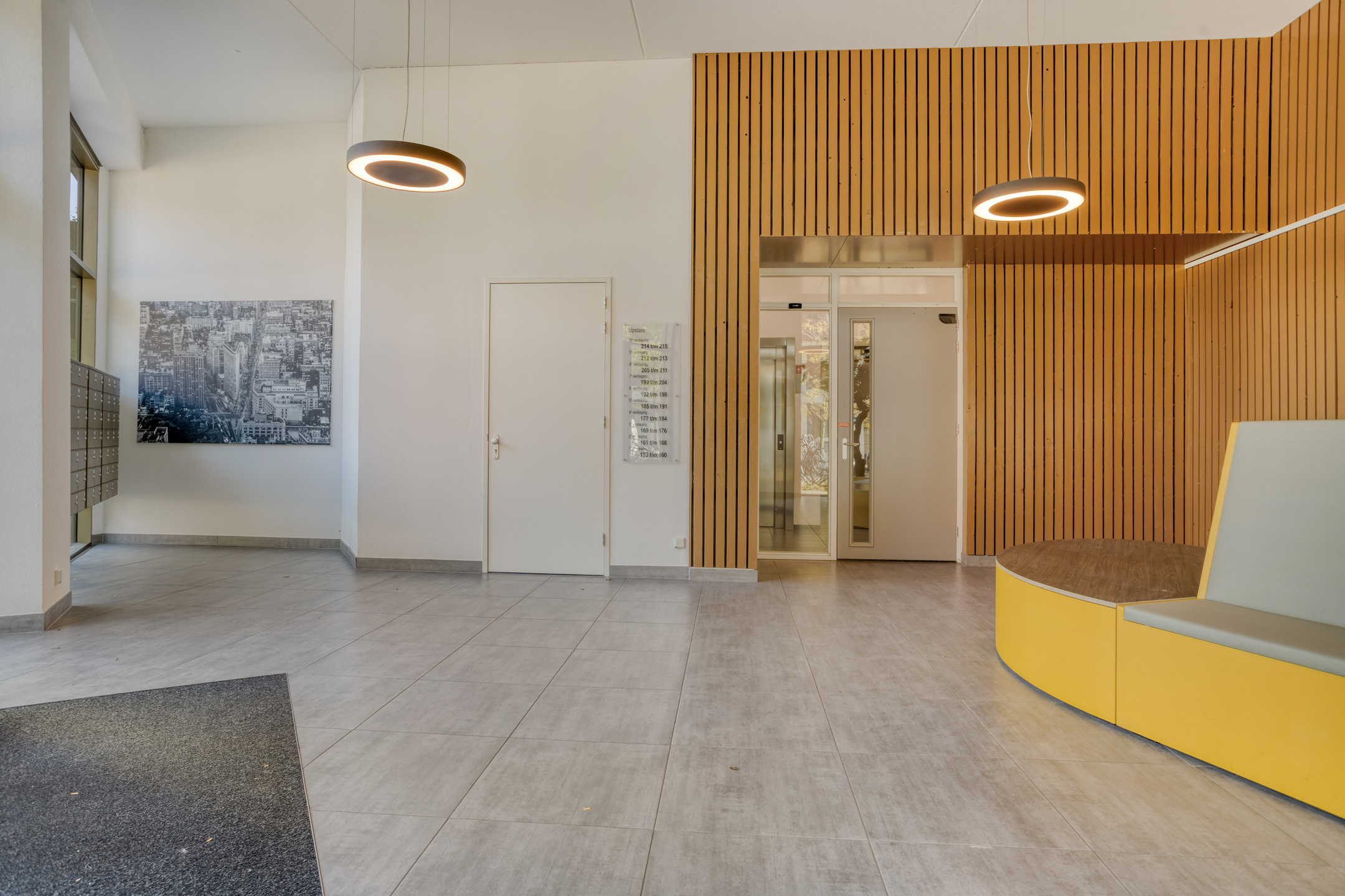 De centrale entree met bellentableau en videofoon-installatie biedt toegang tot de lift, het trappenhuis en het souterrain met persoonlijke berging. Om de hoek bevindt zich de gemeenschappelijke fietsenberging. De privé-parkeerplaats bevindt zich in de garage van het tegenover gelegen complex Belvédère.