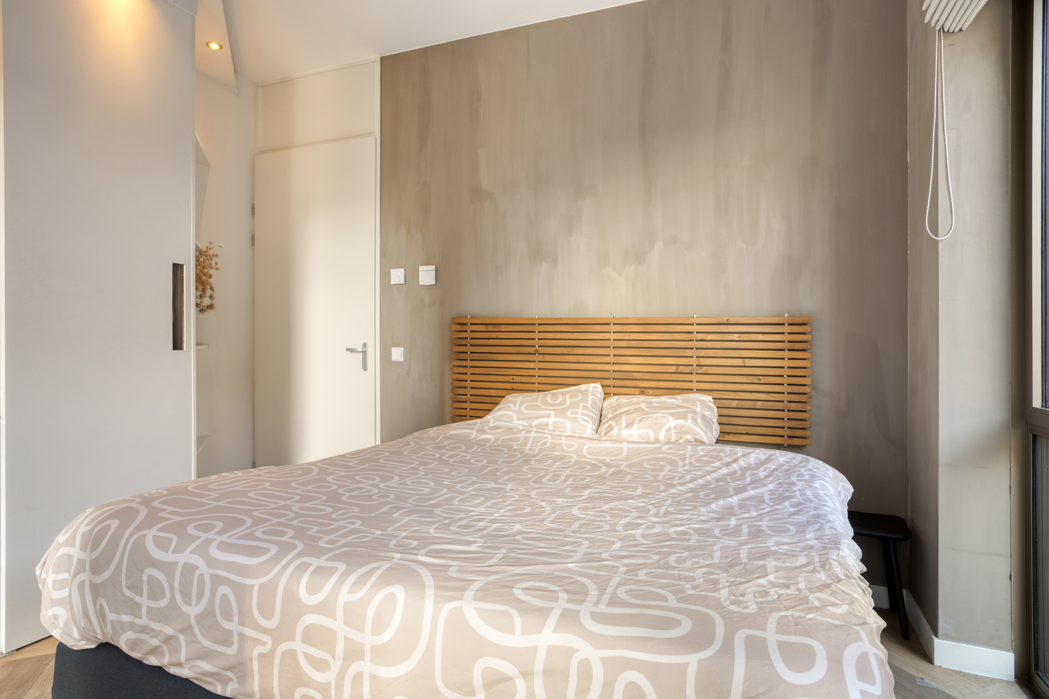Het appartement beschikt over twee slaapkamers, waarvan vooral de hoofdslaapkamer ruim van formaat is. De moderne badkamer is stijlvol ingericht met een inloopdouche, dubbele wastafel met meubel en een verzorgde afwerking.