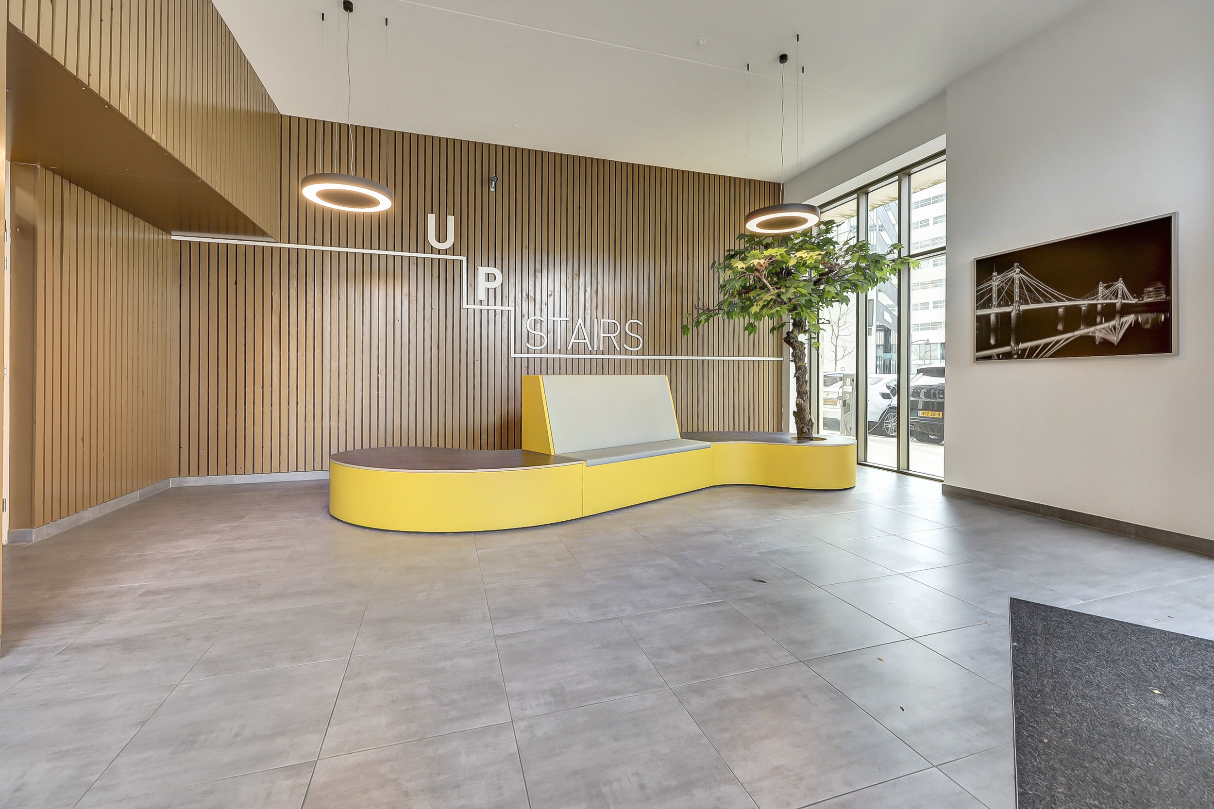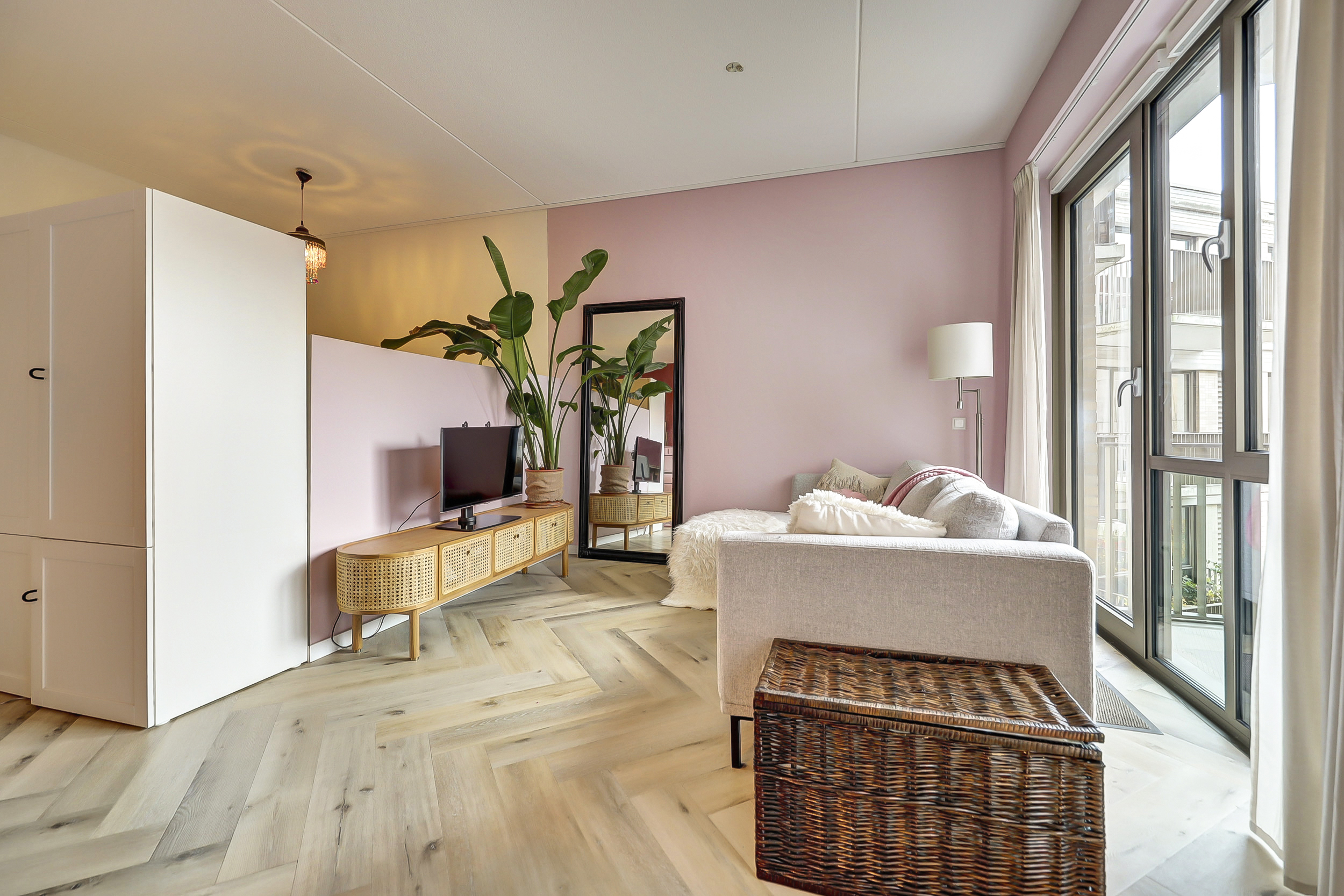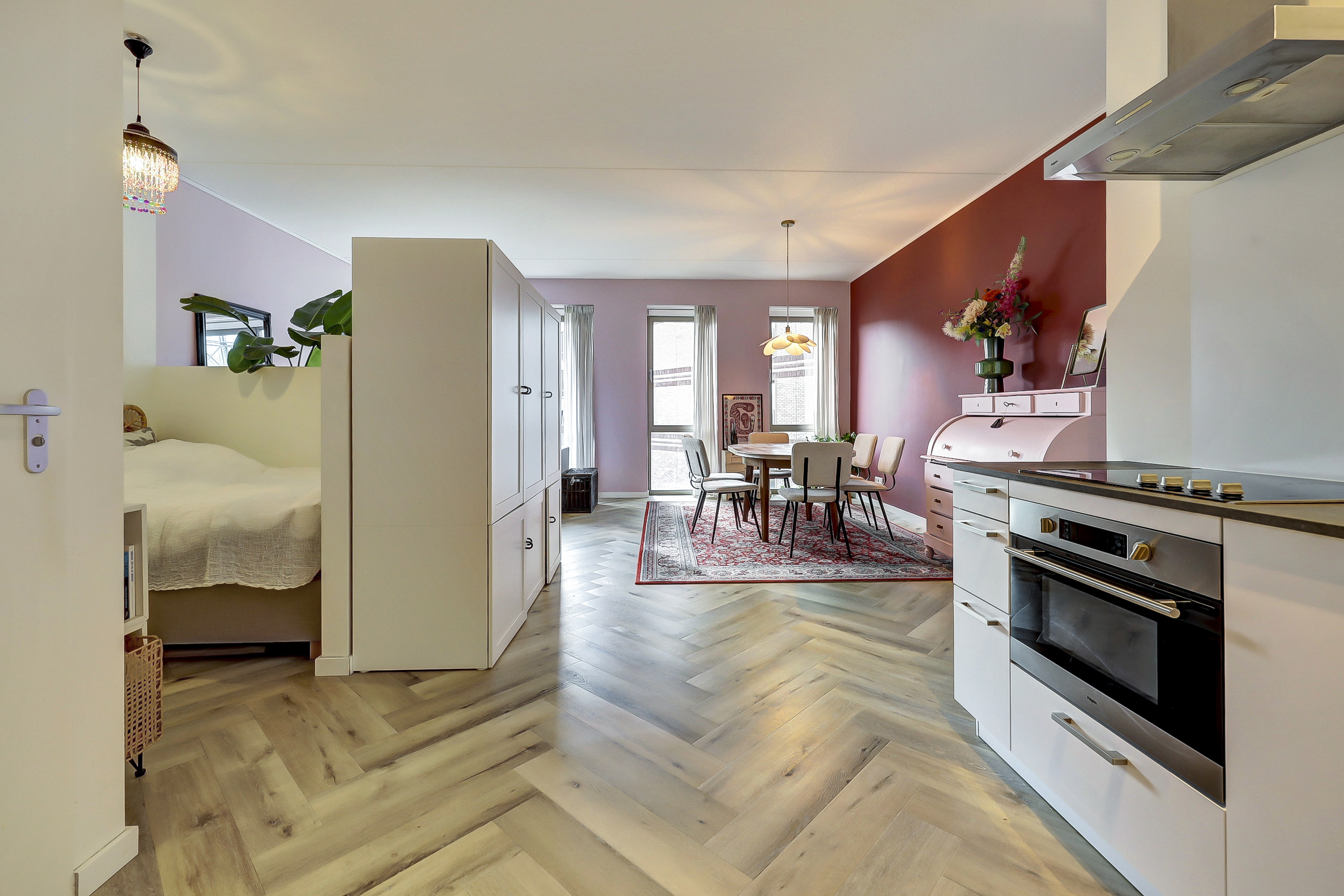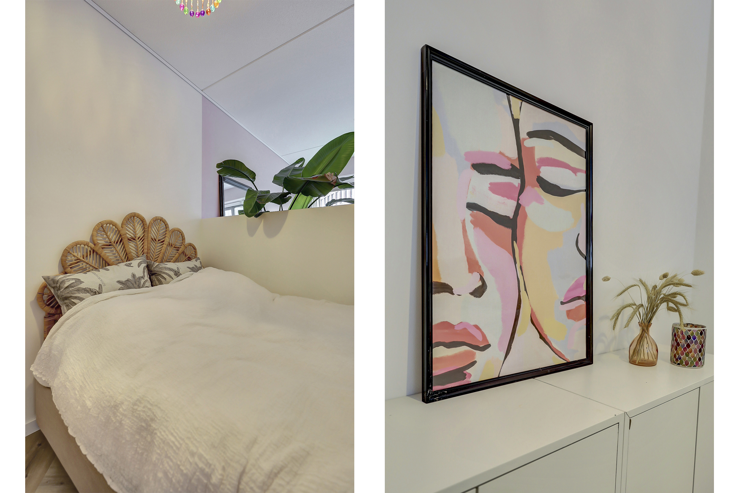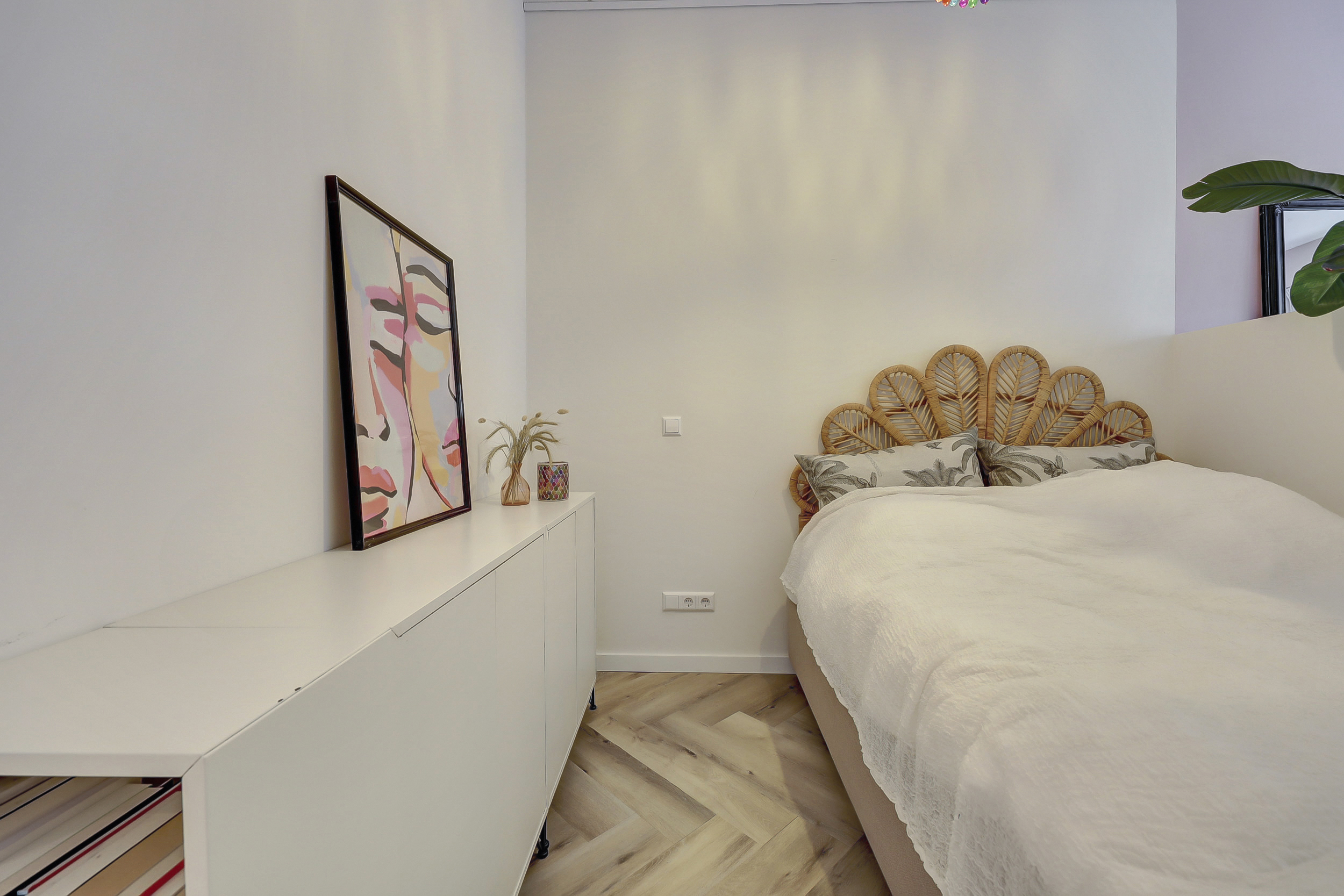 Dankzij een roomdivider is een knus slaapgedeelte gecreëerd. Hierdoor voelt de ruimte intiem en praktisch ingedeeld, zonder het open karakter van het appartement te verliezen.