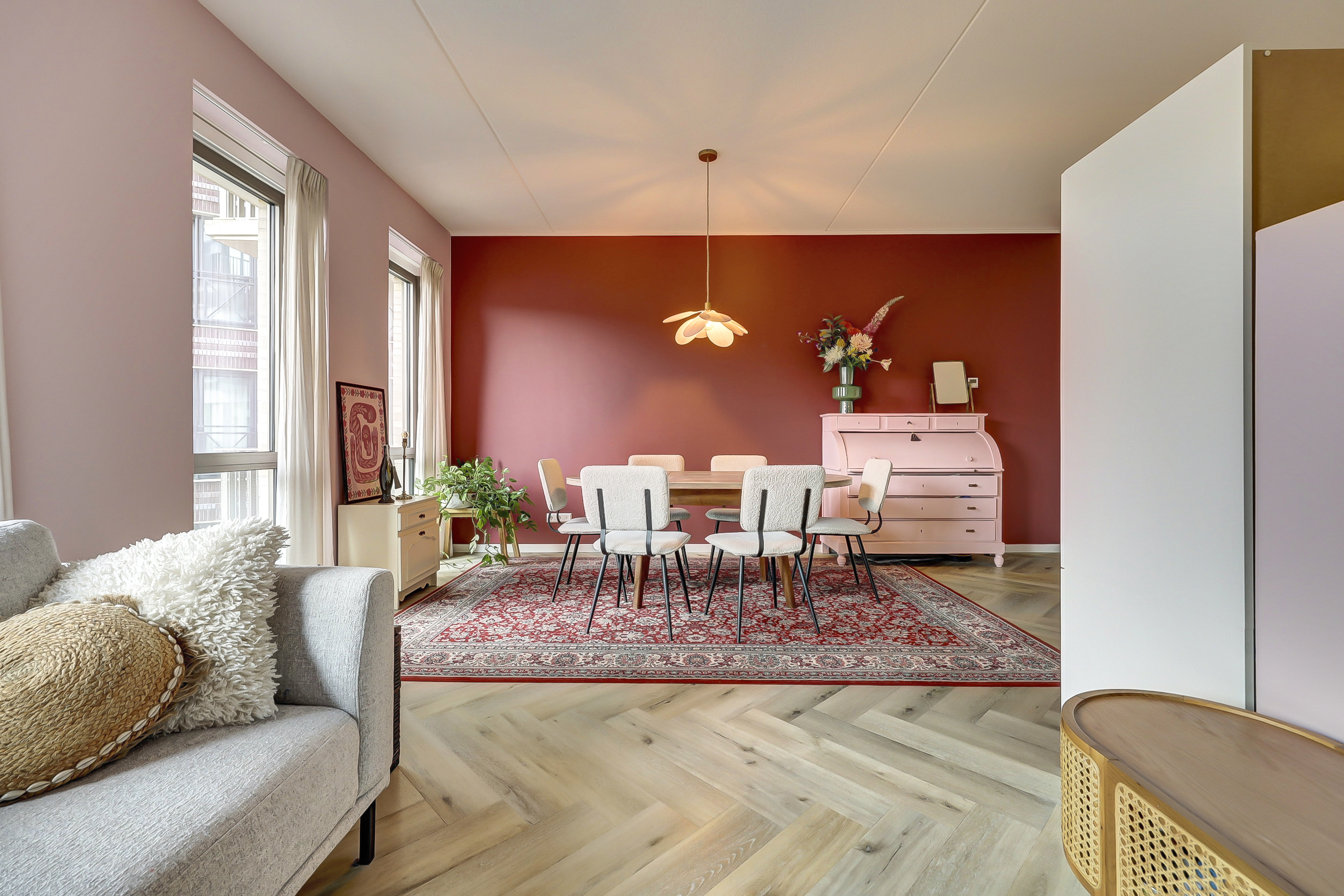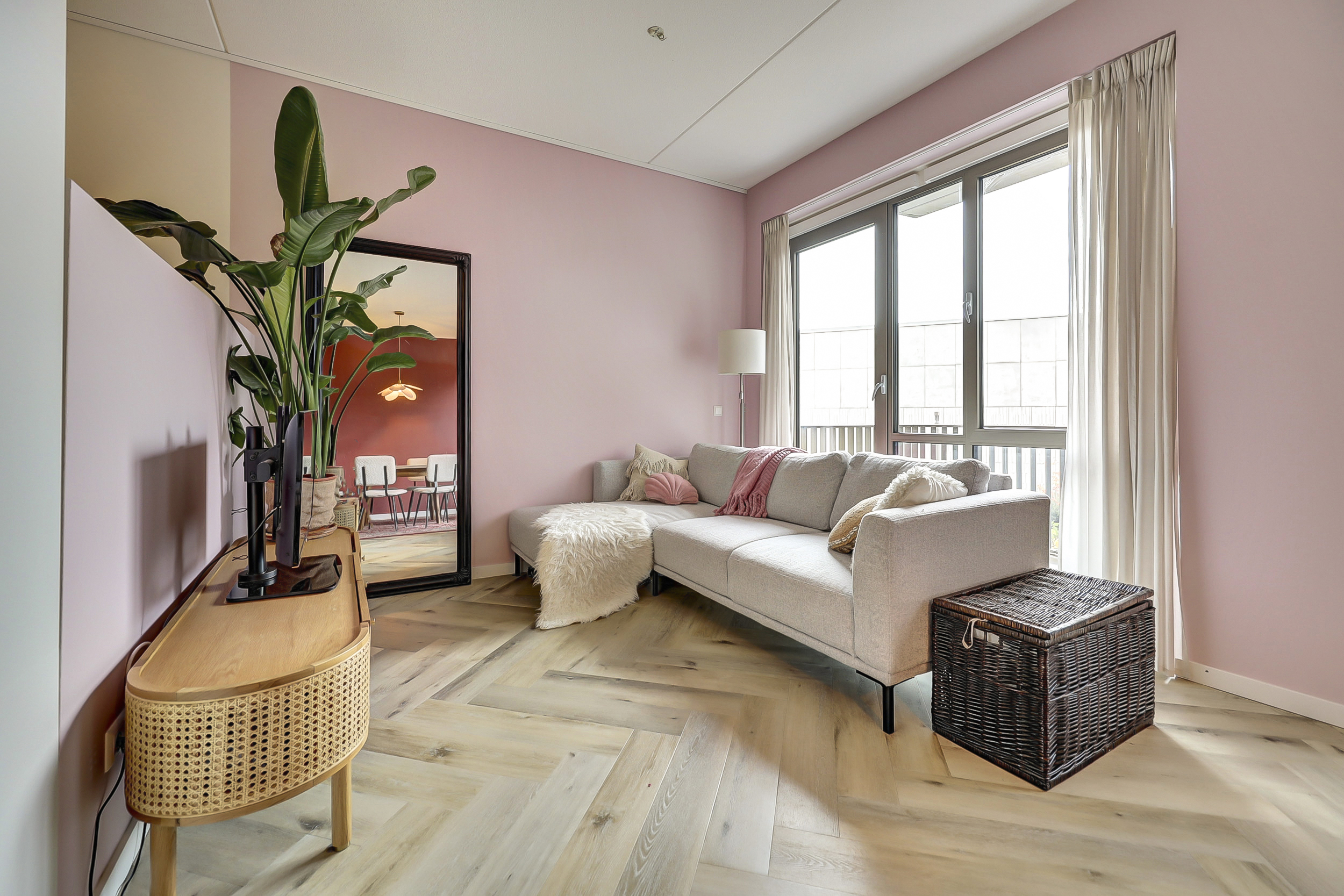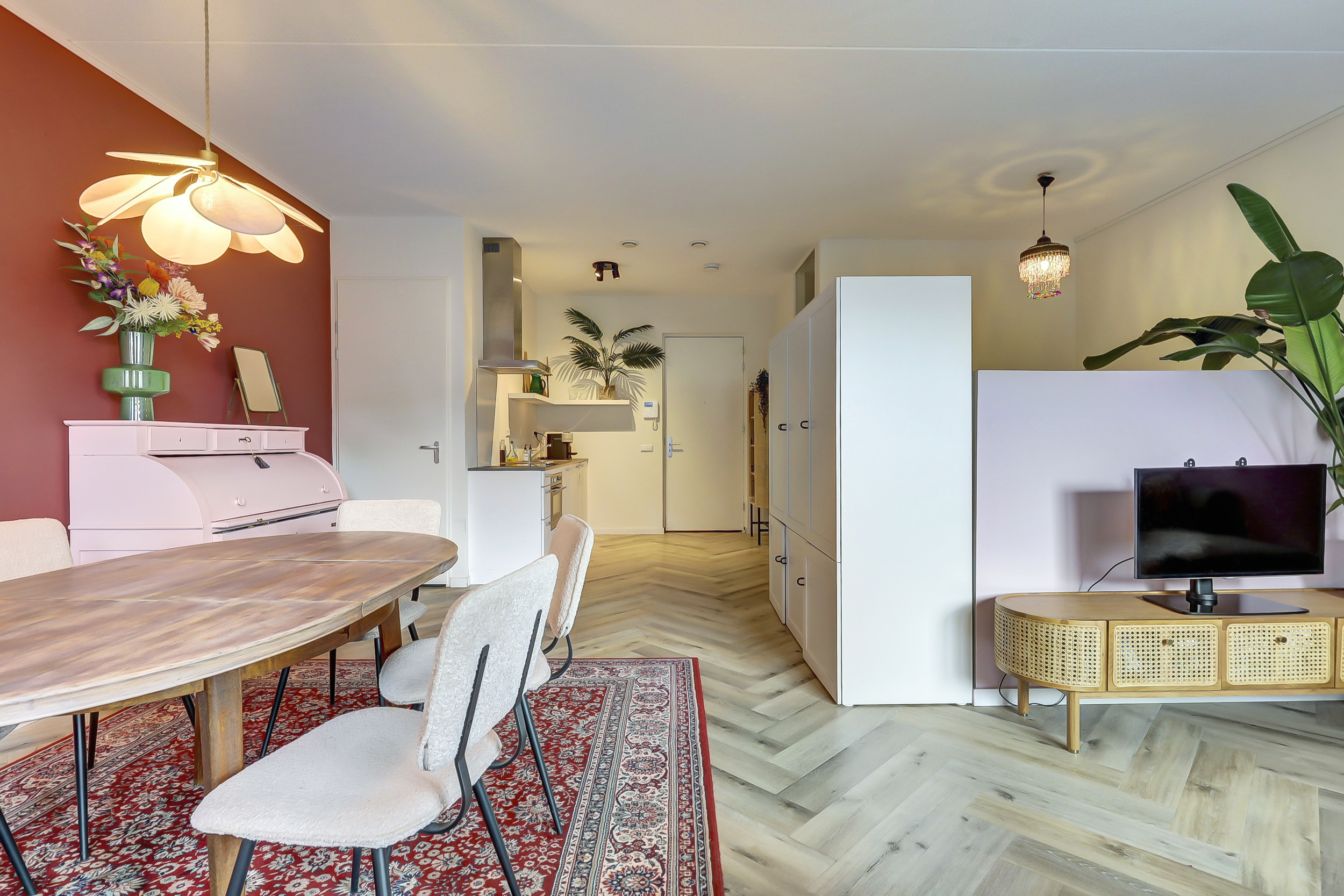 Bij binnenkomst stap je direct een bijzonder sfeervolle woonkamer binnen. De ruimte is warm ingericht, met een prachtige visgraatvloer die de basis vormt voor het elegante geheel. De combinatie van zachte kleuren, stijlvolle meubels en de fijne lichtinval zorgt voor een zeer aangename leefruimte waar je je meteen thuis voelt.