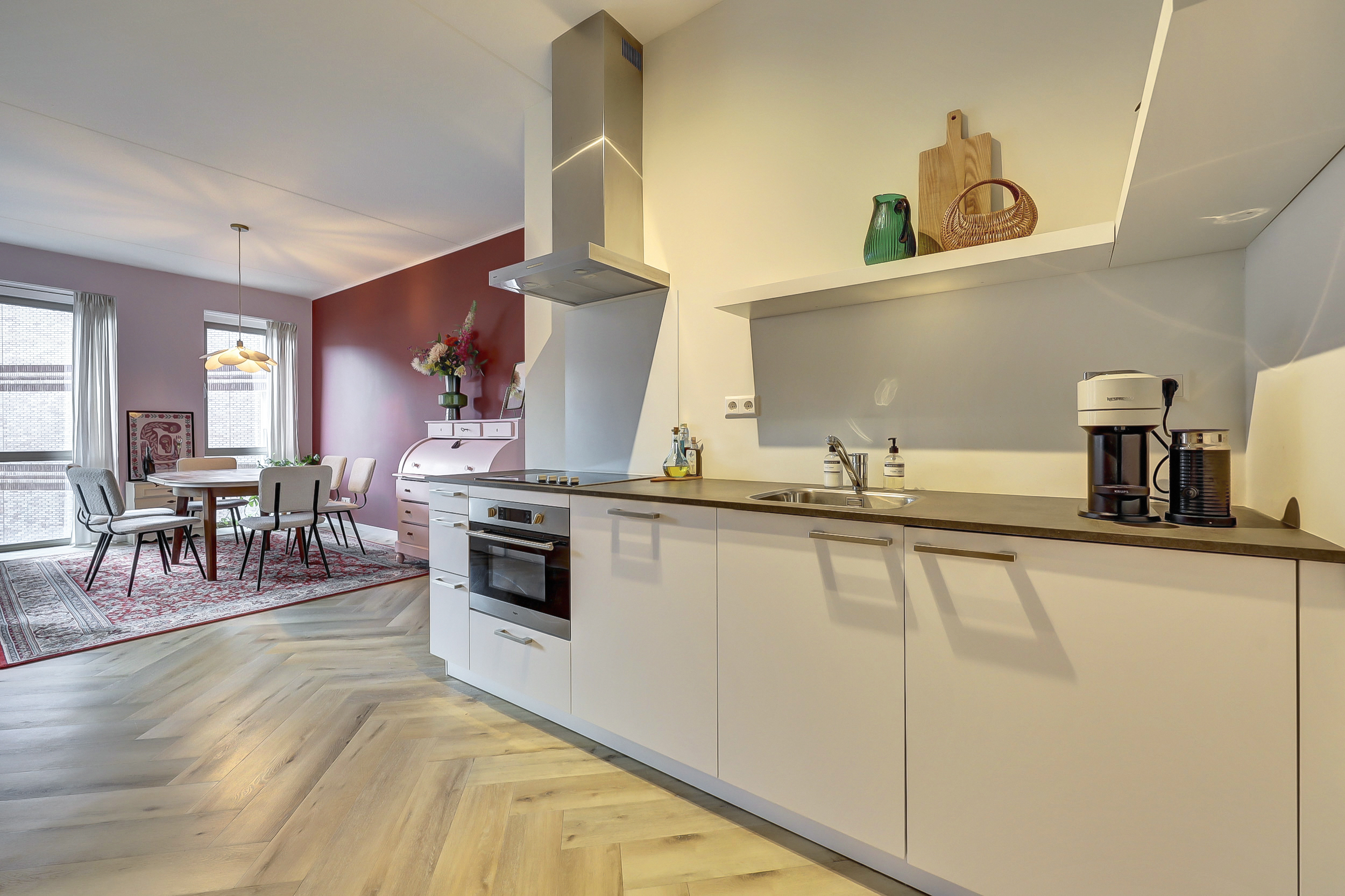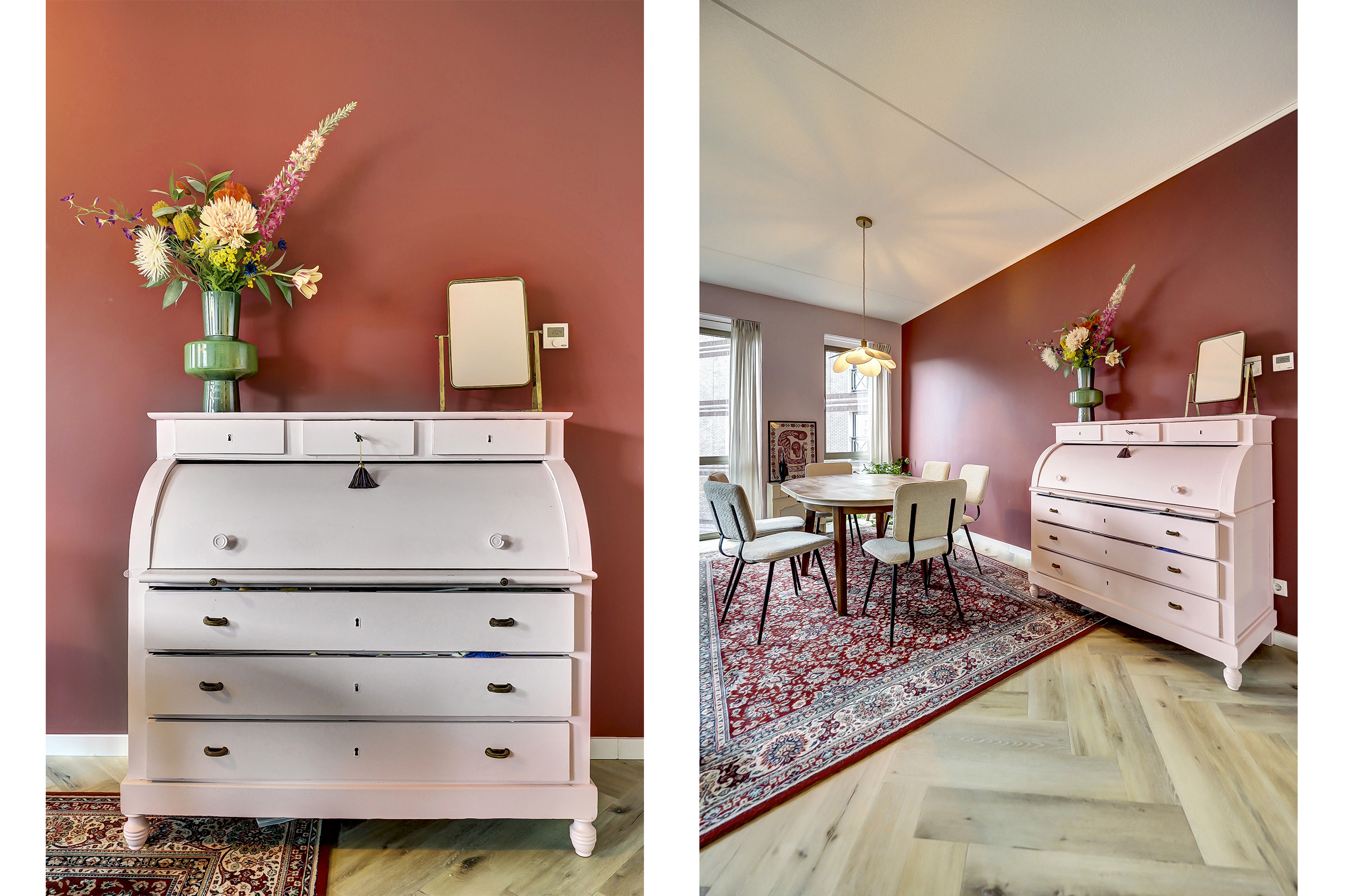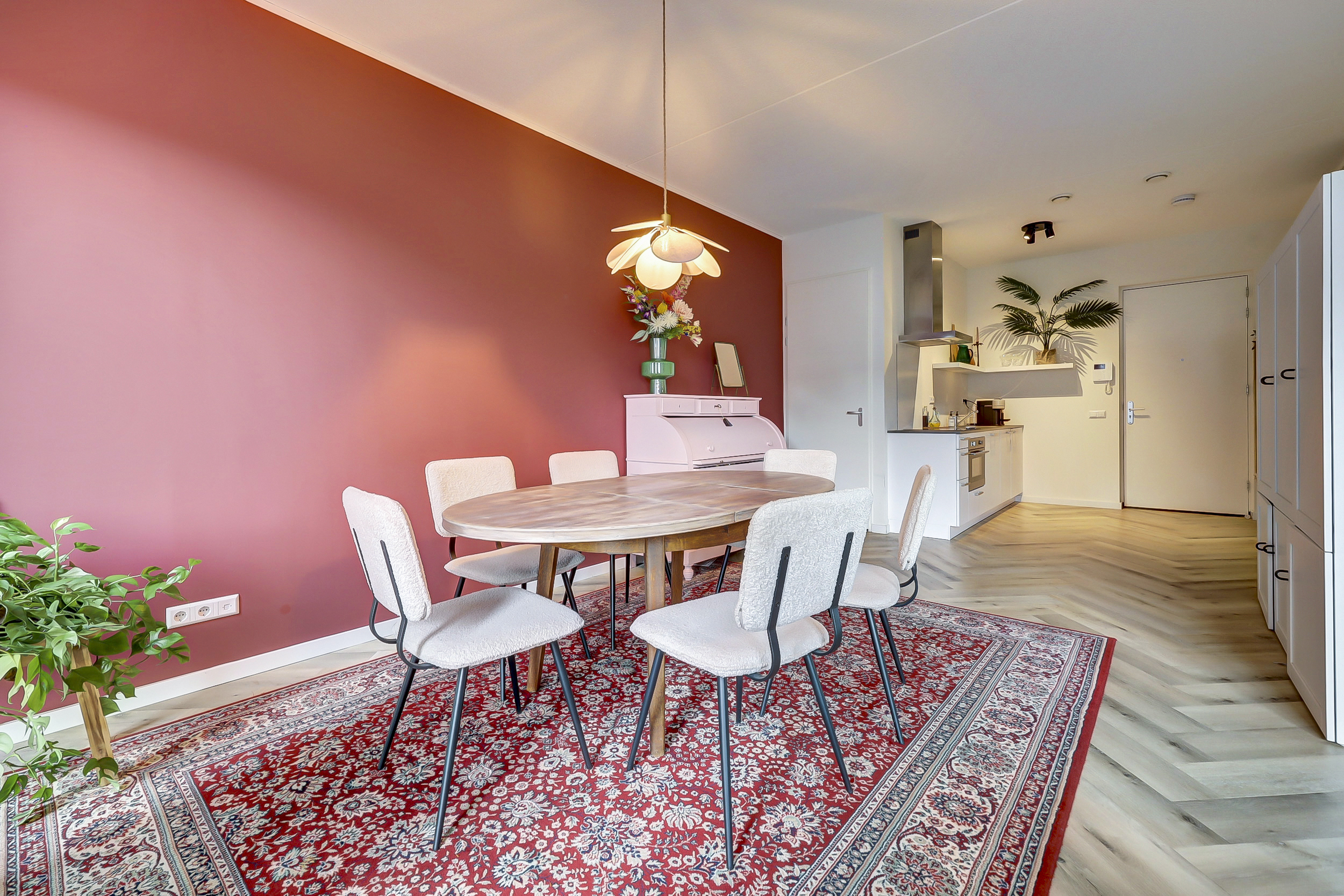 Bij binnenkomst stap je direct een bijzonder sfeervolle woonkamer binnen. De ruimte is warm ingericht, met een prachtige visgraatvloer die de basis vormt voor het elegante geheel. De combinatie van zachte kleuren, stijlvolle meubels en de fijne lichtinval zorgt voor een zeer aangename leefruimte waar je je meteen thuis voelt.