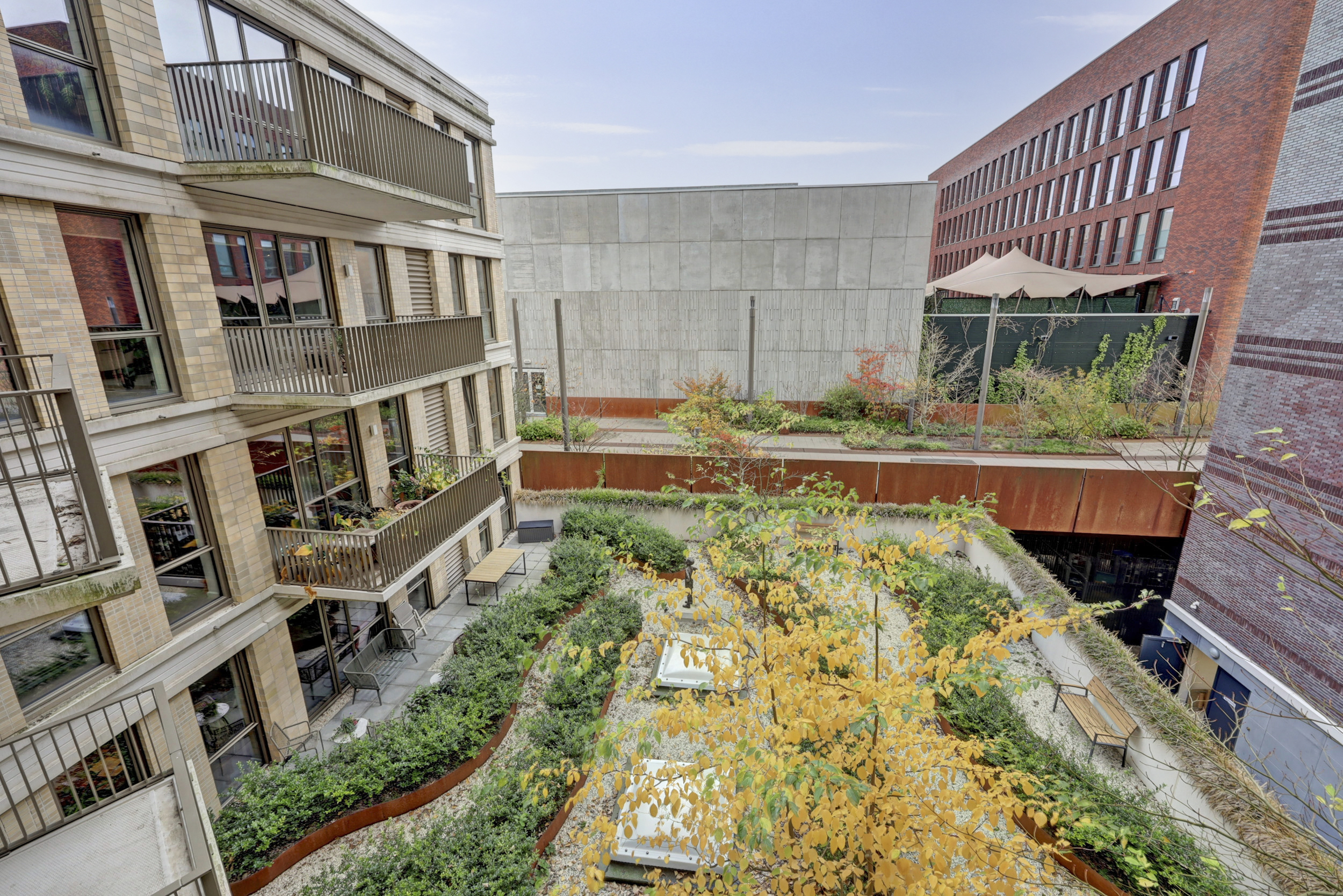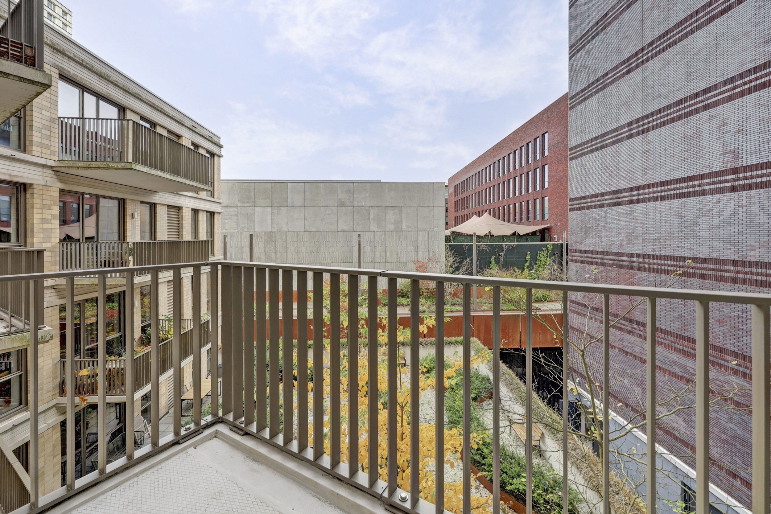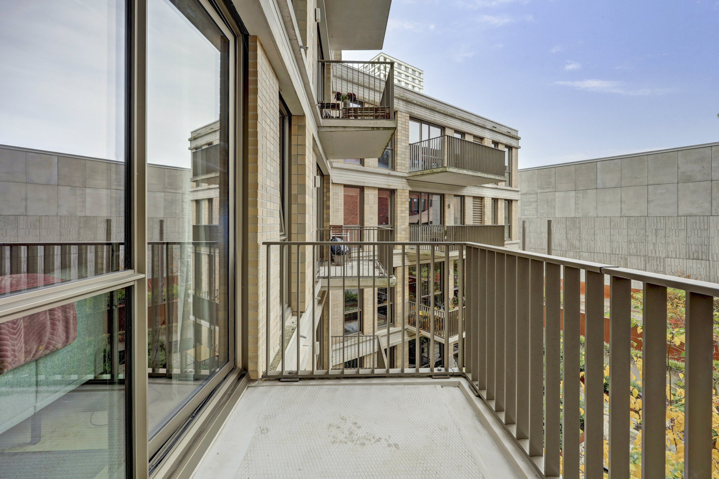 Via de woonkamer bereik je het balkon, dat uitkijkt op de groene binnentuin. Het is een heerlijke, rustige plek om van de buitenlucht te genieten.
