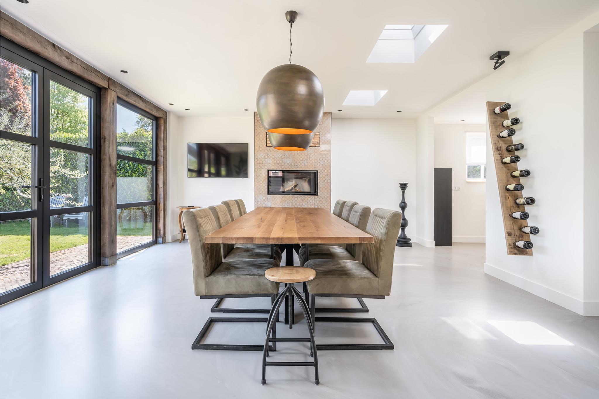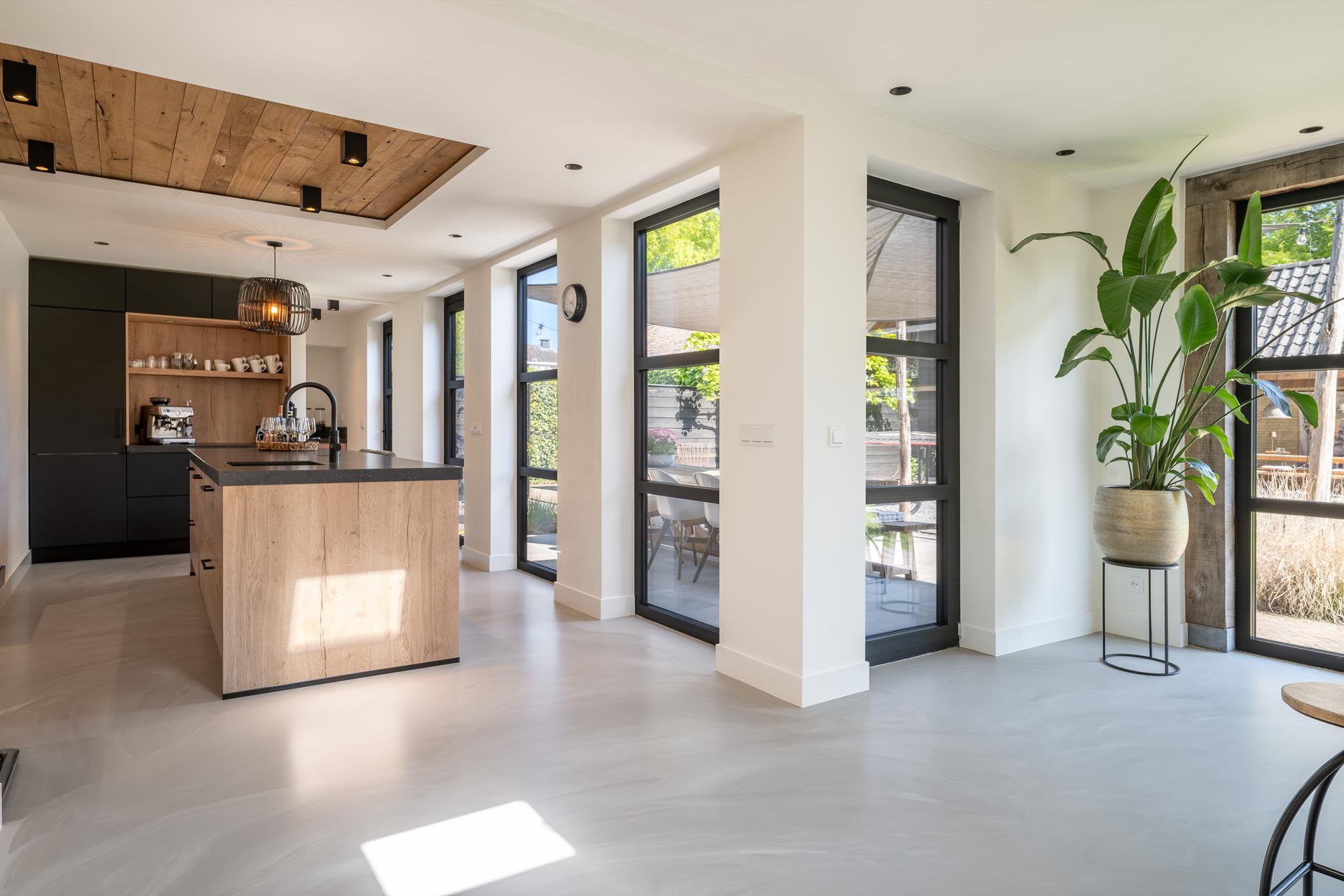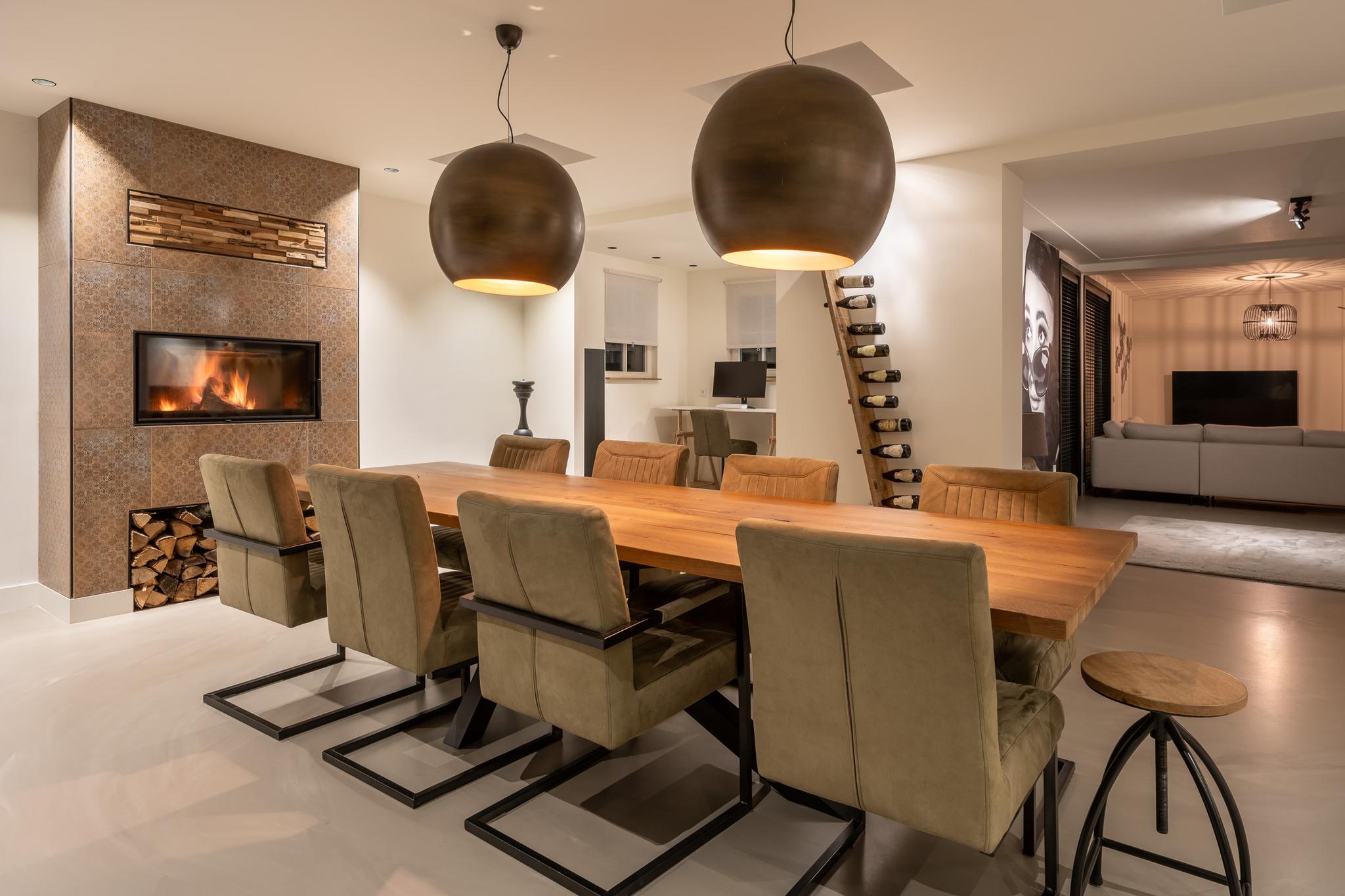 Aan de achterzijde van de woning is een zeer ruime luxueuze woonkeuken aangebouwd. Vanuit de woonkeuken kijk je prachtig uit over de tuin die dankzij de openslaande deuren letterlijk een verlengstuk wordt van je leefruimte. Deze ruimte is een echte eyecatcher en nodigt meteen uit tot koken en lang tafelen. Bij de eettafel is op ooghoogte is een gezellige houthaard ingebouwd. Ook hier is nog een multifunctionele aanbouw gerealiseerd, welke nu in gebruik is als thuiswerkplek.