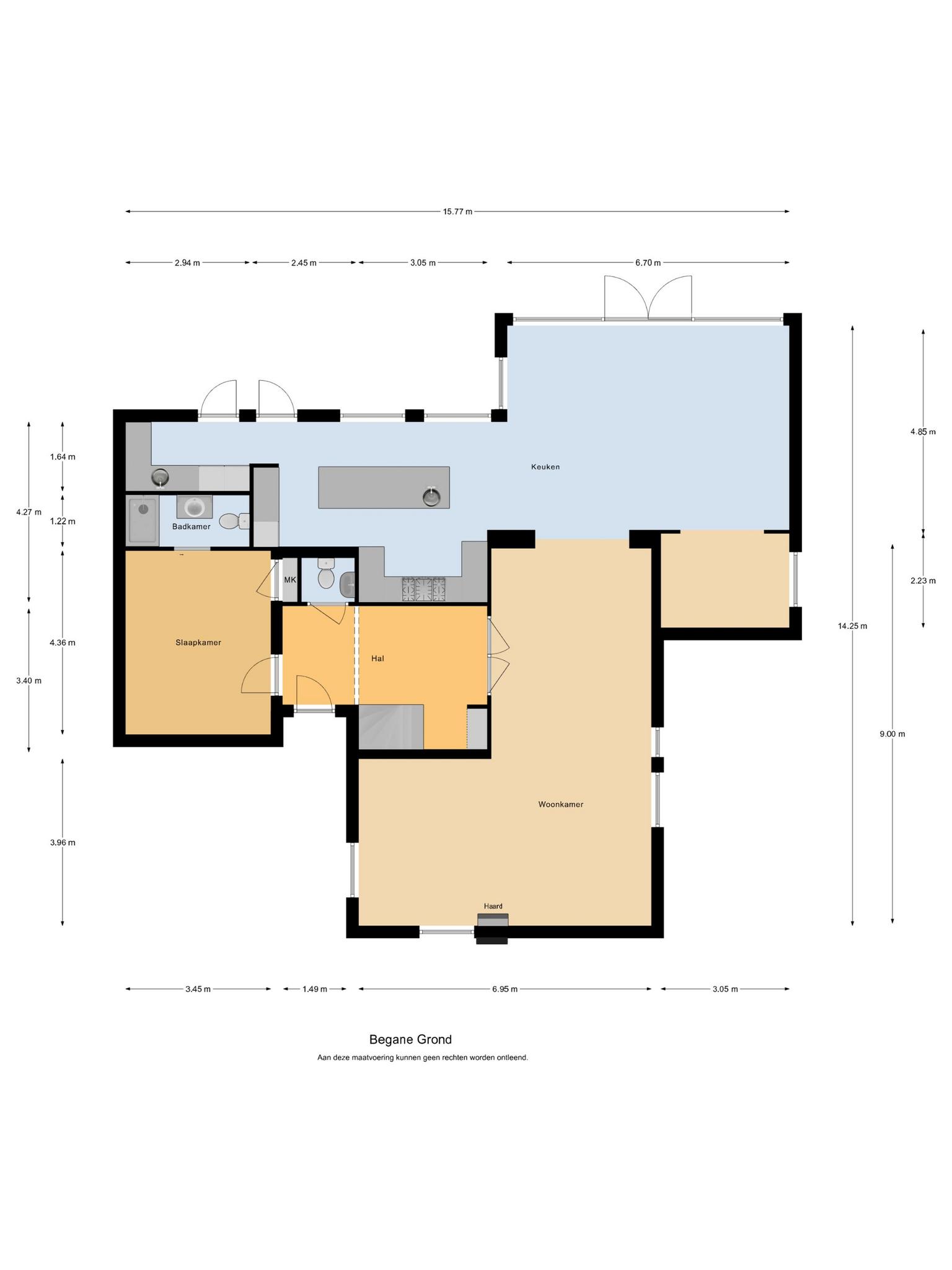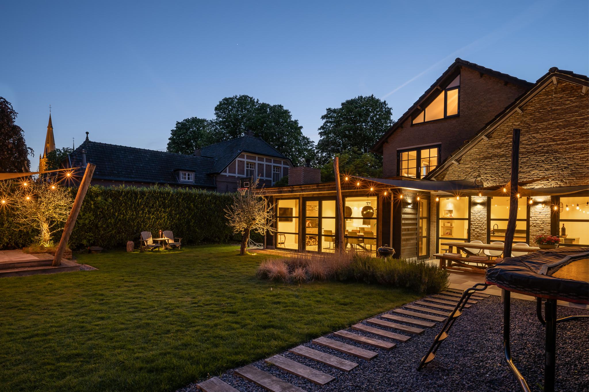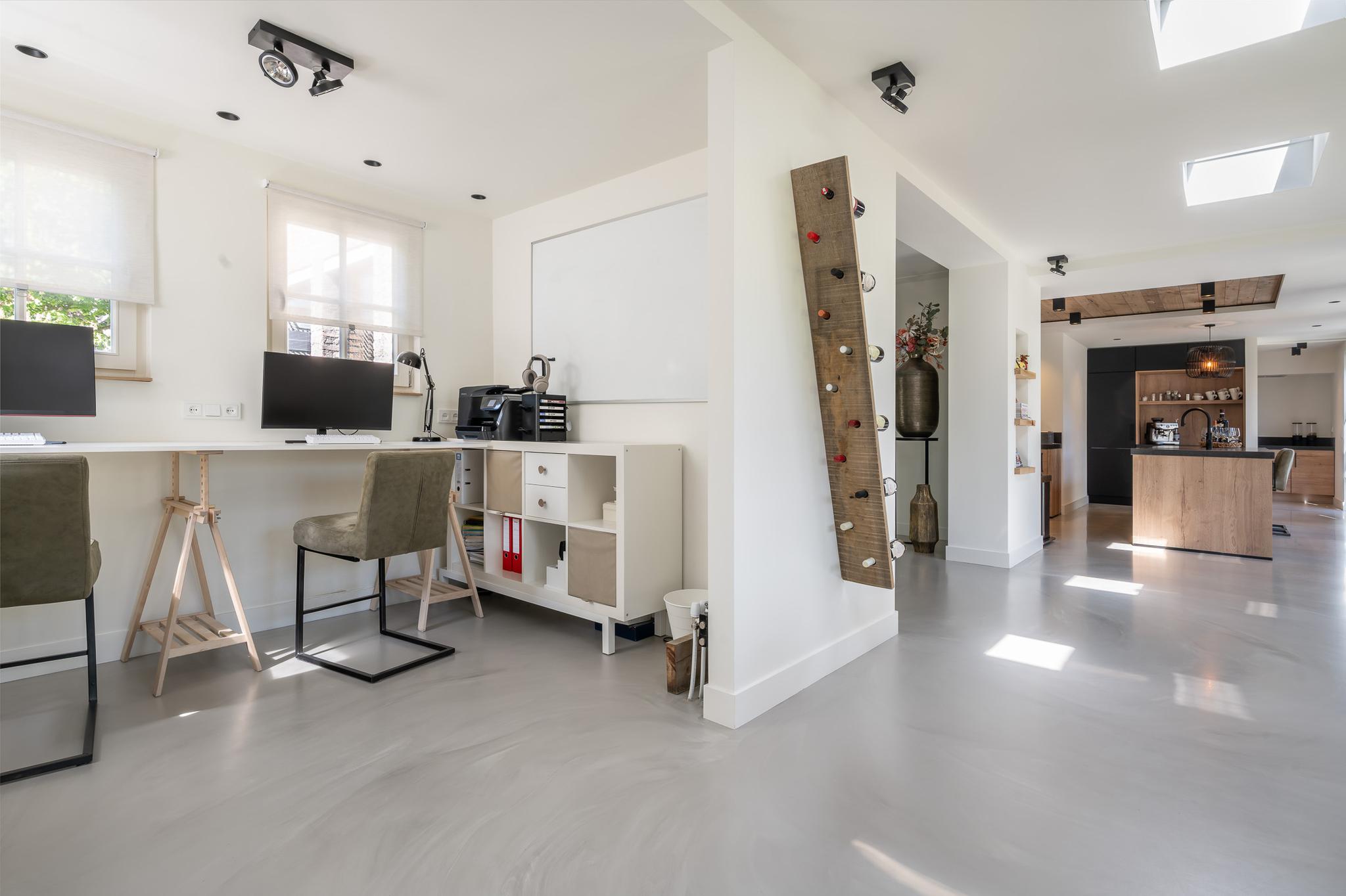 Aan de achterzijde van de woning is een zeer ruime luxueuze woonkeuken aangebouwd. Vanuit de woonkeuken kijk je prachtig uit over de tuin die dankzij de openslaande deuren letterlijk een verlengstuk wordt van je leefruimte. Deze ruimte is een echte eyecatcher en nodigt meteen uit tot koken en lang tafelen. Bij de eettafel is op ooghoogte is een gezellige houthaard ingebouwd. Ook hier is nog een multifunctionele aanbouw gerealiseerd, welke nu in gebruik is als thuiswerkplek.