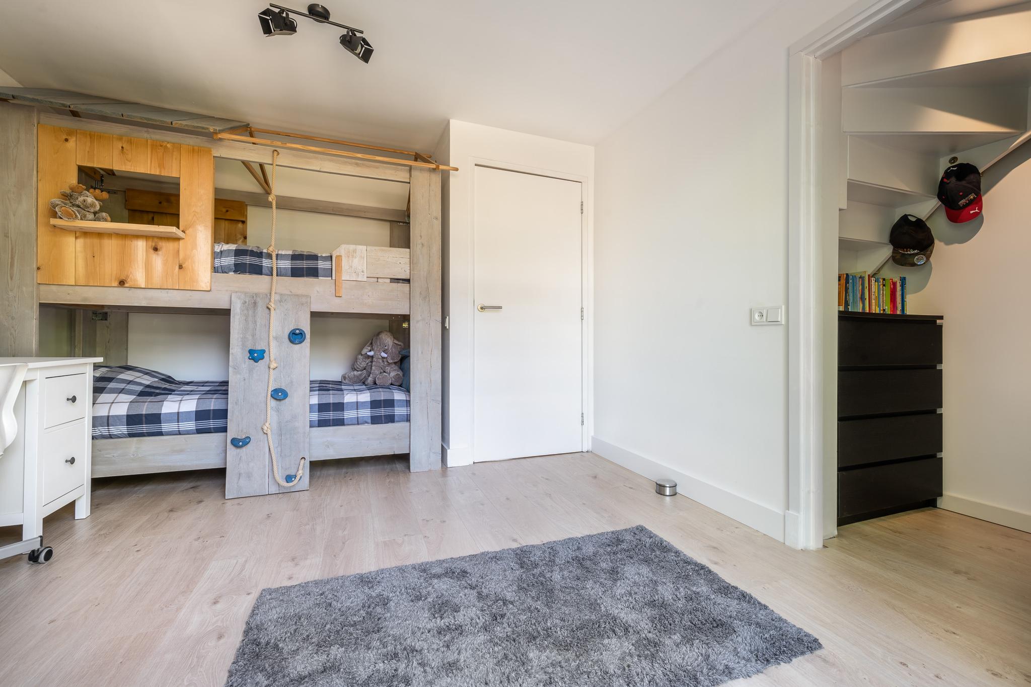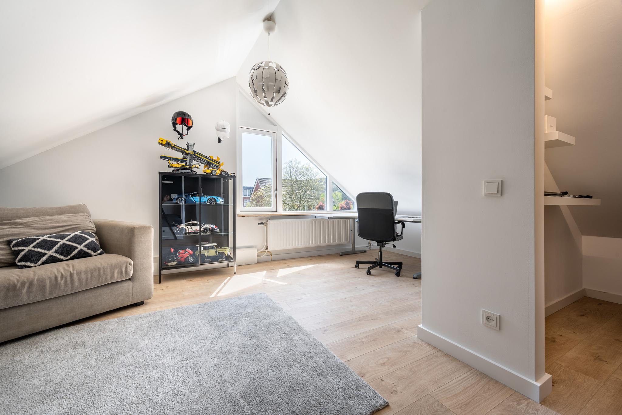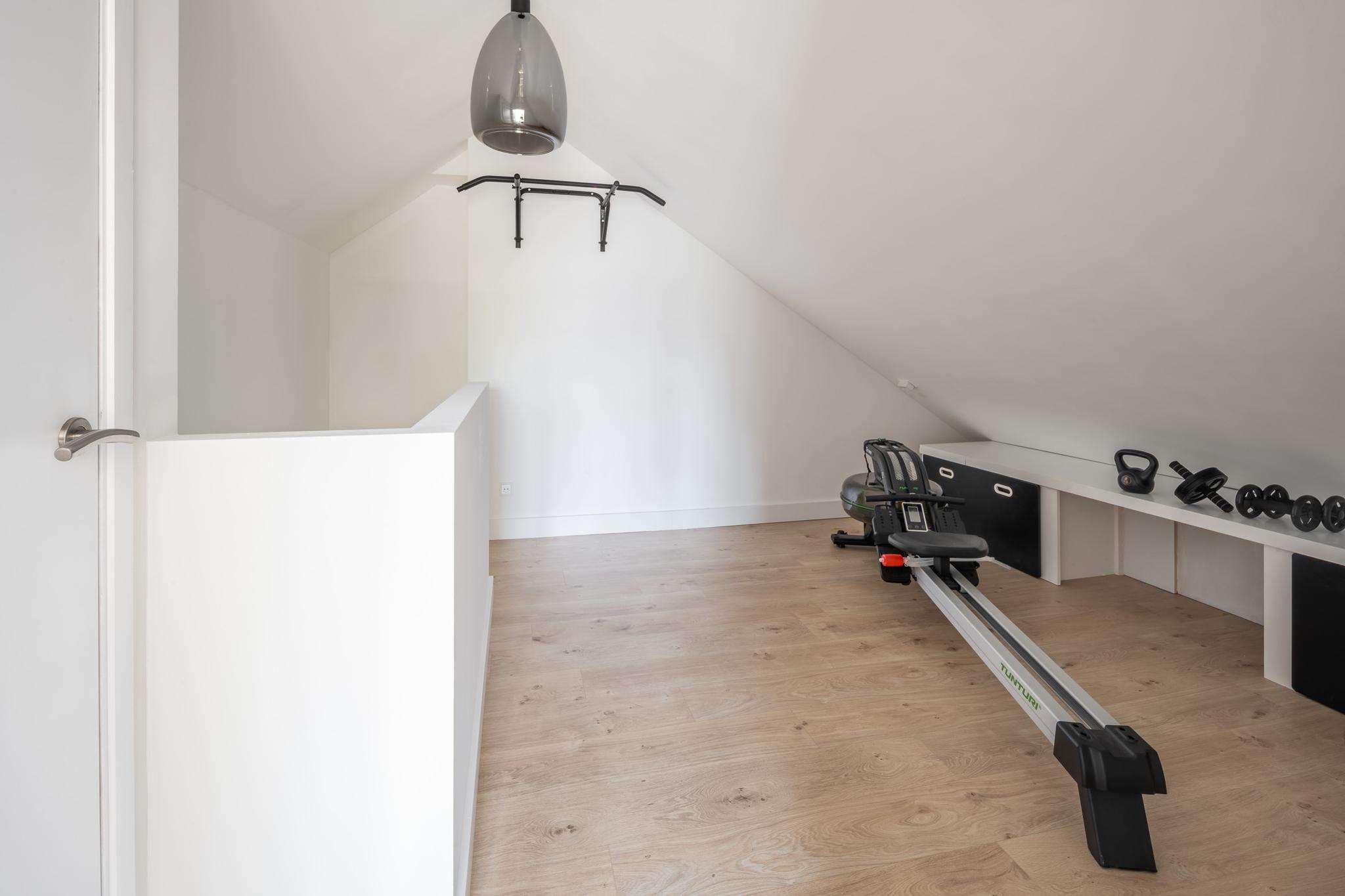 Voorzolder met functionele open ruimte waar nu de fitnessapparatuur staat. Vanuit de voorzolder is de afgesloten berging bereikbaar. Toegang tot de vierde slaapkamer met een speelse indeling. Ook deze kamer heeft een kleine inloopkast, berging achter knieschot en veel daglicht door het hoge raam.