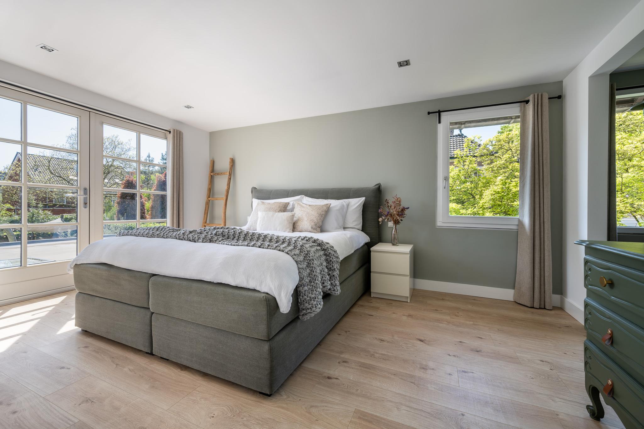 De grootste slaapkamer heeft een royale inloopkast en dubbele deuren naar het platte dak. De slaapkamer aan de voorzijde heeft een deur naar het balkon, een eigen wastafel en een kleinere inloopkast.