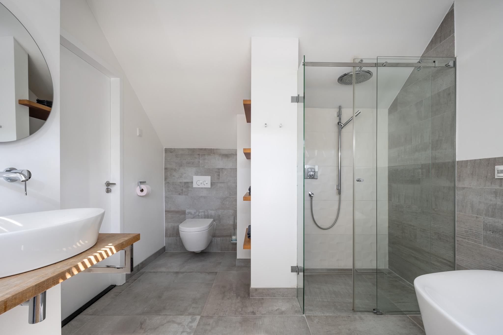 - Toilet, wastafelmeubel, inloopdouche, vloerverwarming, ligbad en dubbele wastafel