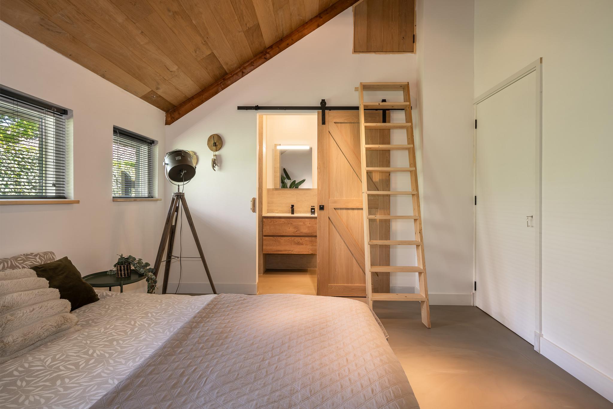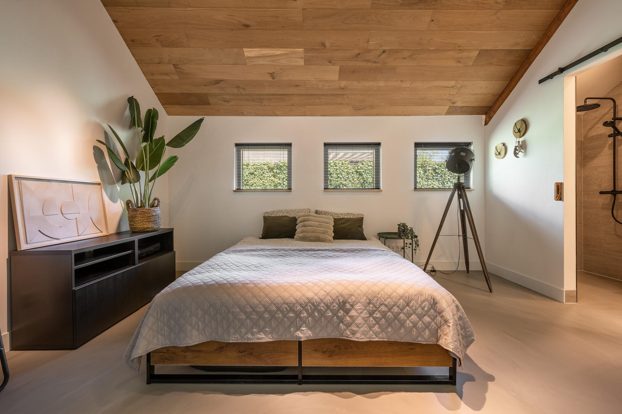 Tot slot is er op de begane grond nog een ruime slaapkamer en een badkamer waardoor hier ook de mogelijkheid is om volledig op de begane grond te wonen. Deze slaapkamer is ruim genoeg voor tweepersoonsbed en kledingkast. Direct grenzend aan de slaapkamer ligt de moderne badkamer (2025) voorzien van inloopdouche, toilet en een wastafel met stijlvol meubel. Ook in deze slaapkamer/badkamer loopt de gietvloer met vloerverwarming in door.
