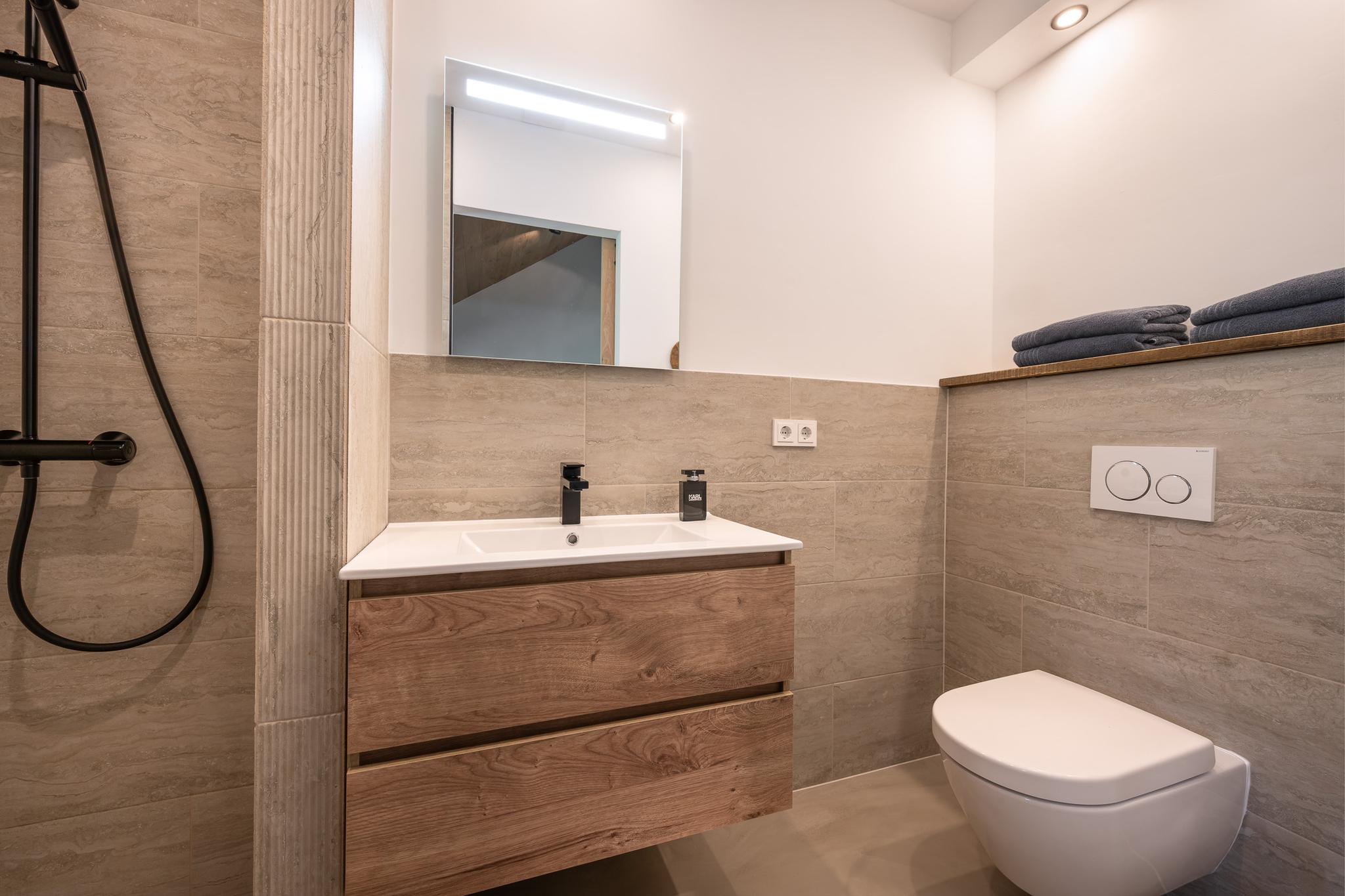 De badkamer is ruim en uitgerust met een ligbad, een inloopdouche, een breed wastafelmeubel en een toilet. De badkamer wordt verwarmd door de vloerverwarming.