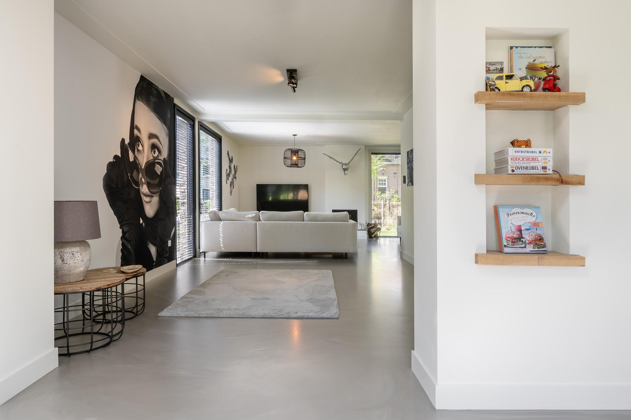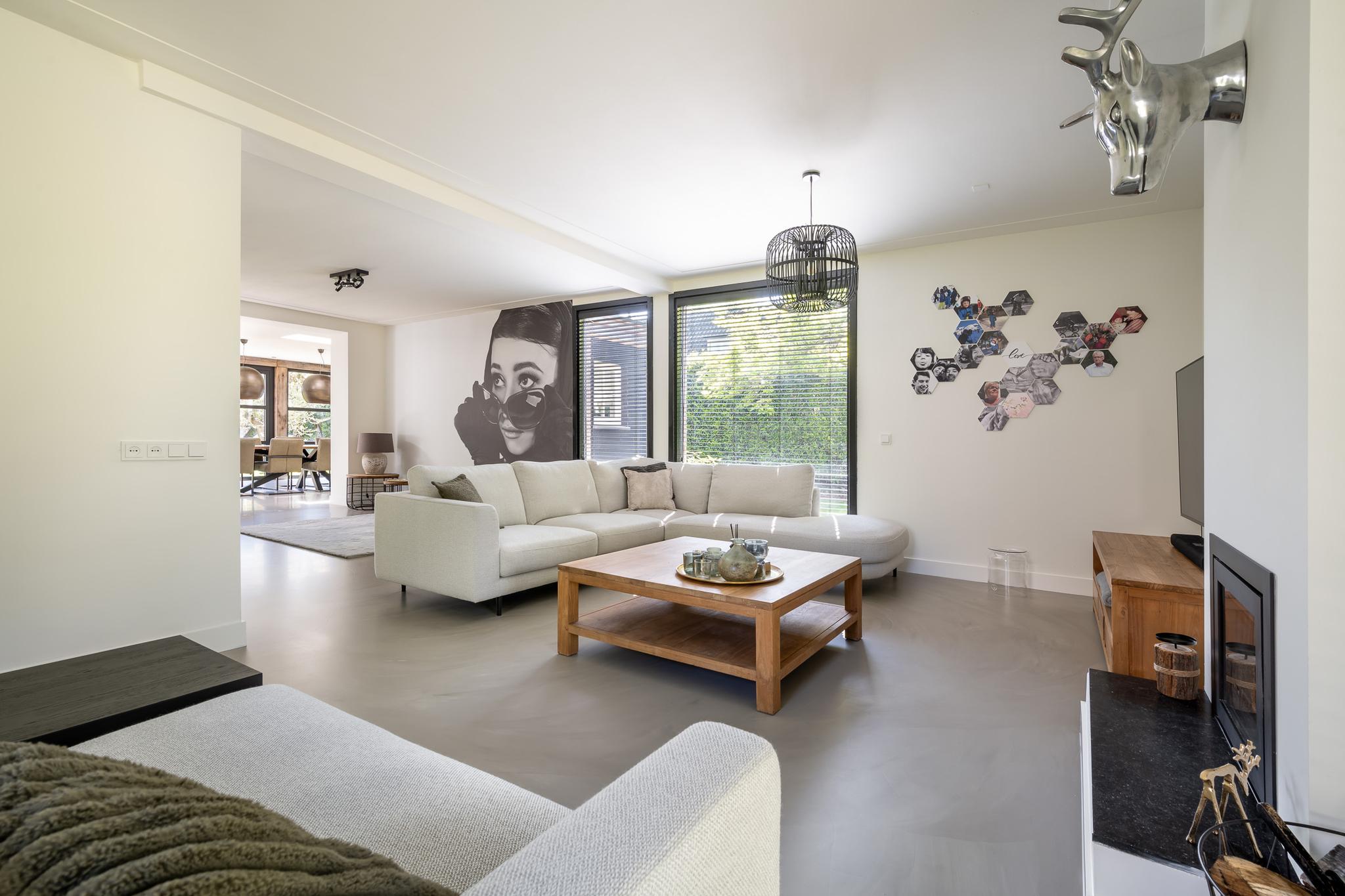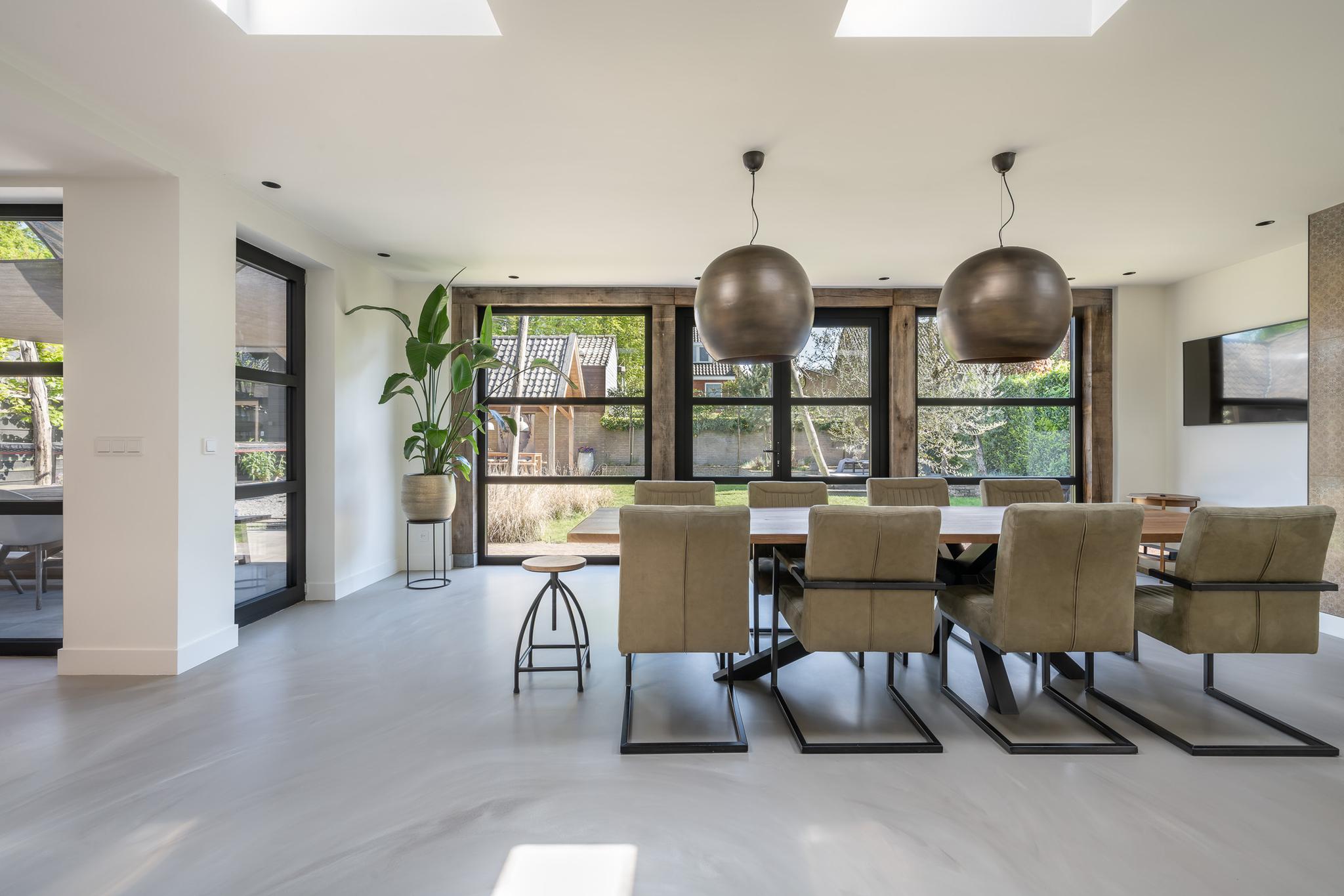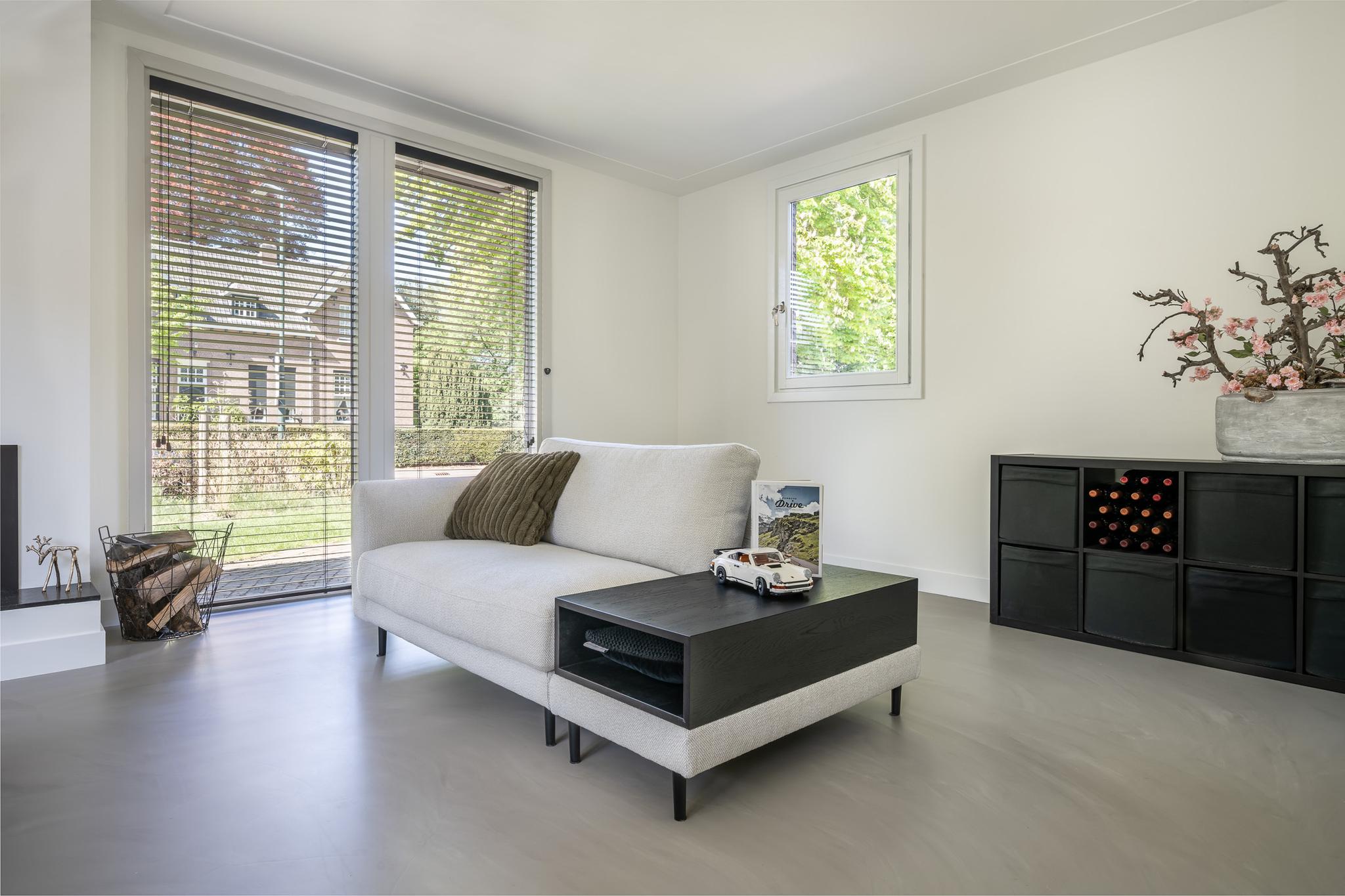 De gehele begane grondvloer is afgewerkt met een gietvloer uiteraard voorzien van comfortabele vloerverwarming. Via de prachtige dubbele glazen deuren betreed je het woongedeelte. Aan de voorzijde van de woning, is het zitgedeelte royaal opgezet rondom de tv en open haard.