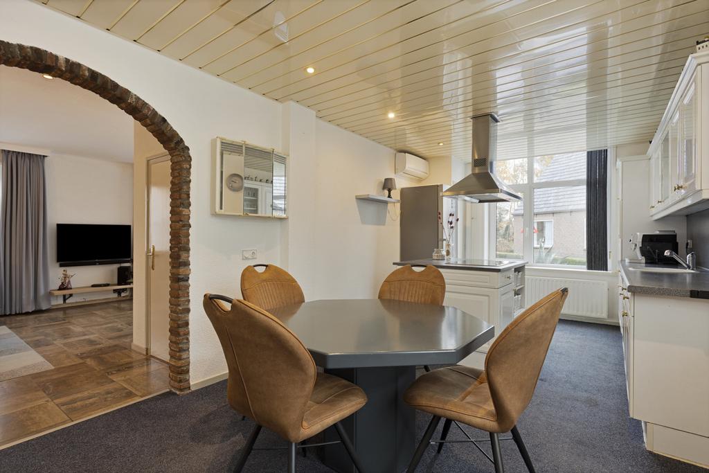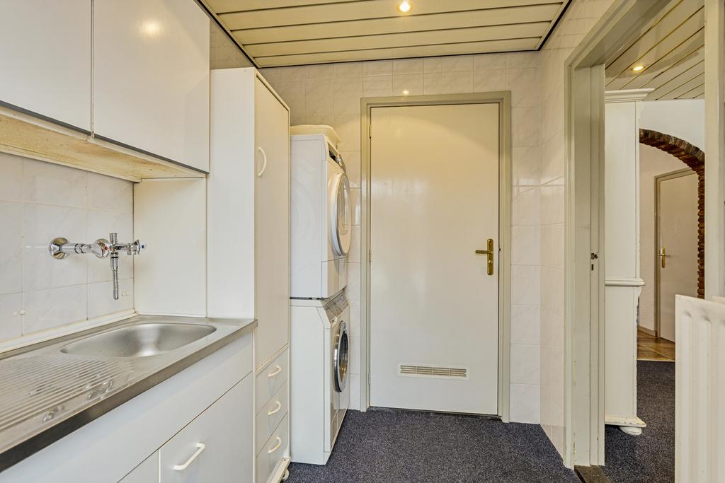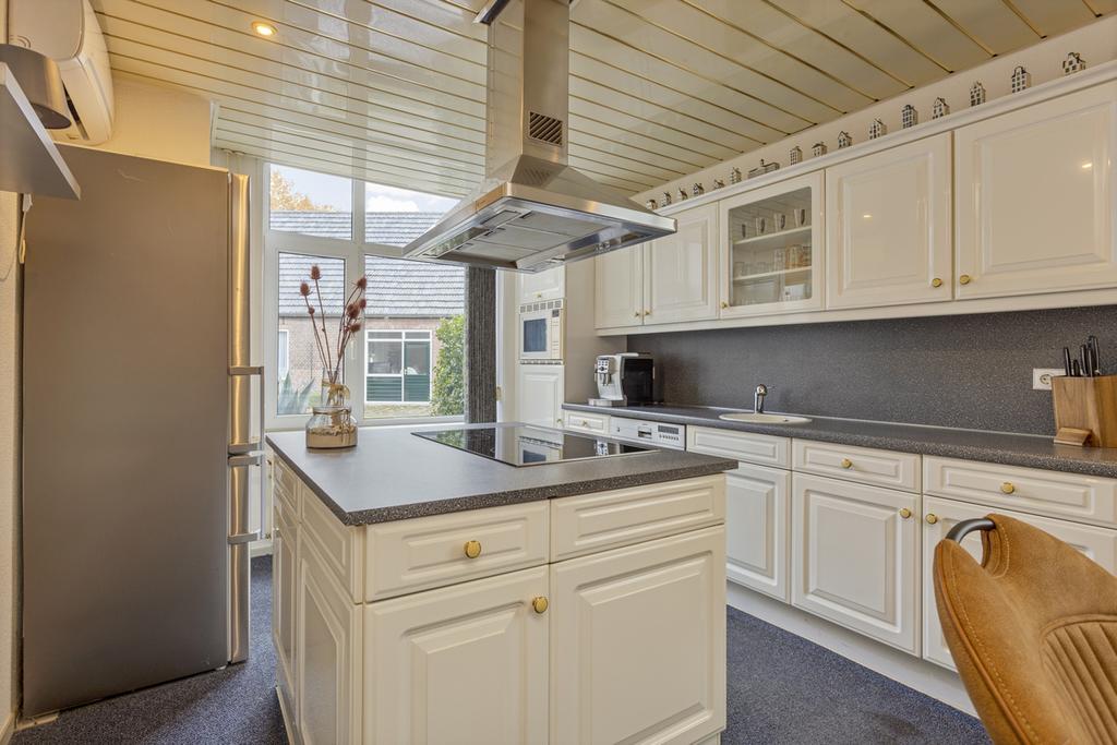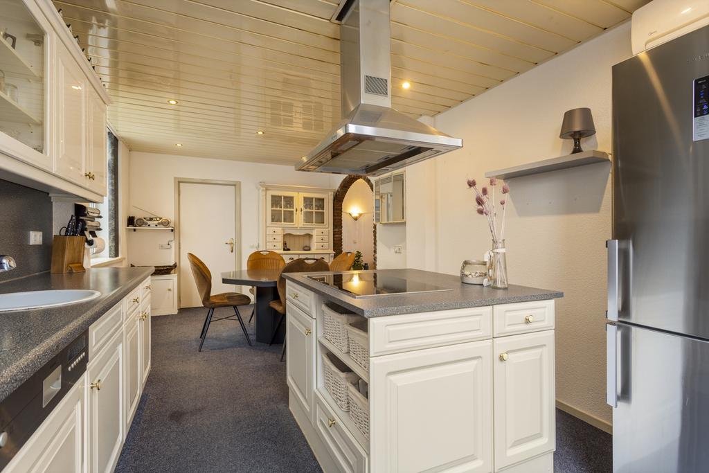 De woonkamer loopt over in de keukenruimte. In deze ruimte vinden we een kookeiland met inductieplaat en de keuken in klassieke stijl. Aansluitend vinden we naast de keuken de bijkeuken met de aansluiting voor uw wasapparatuur en de toiletruimte met fonteintje.