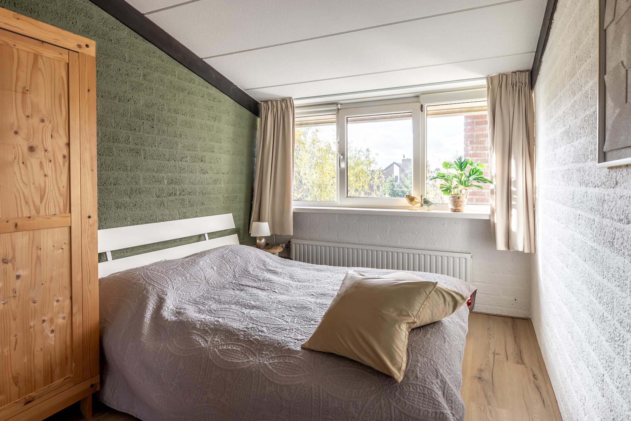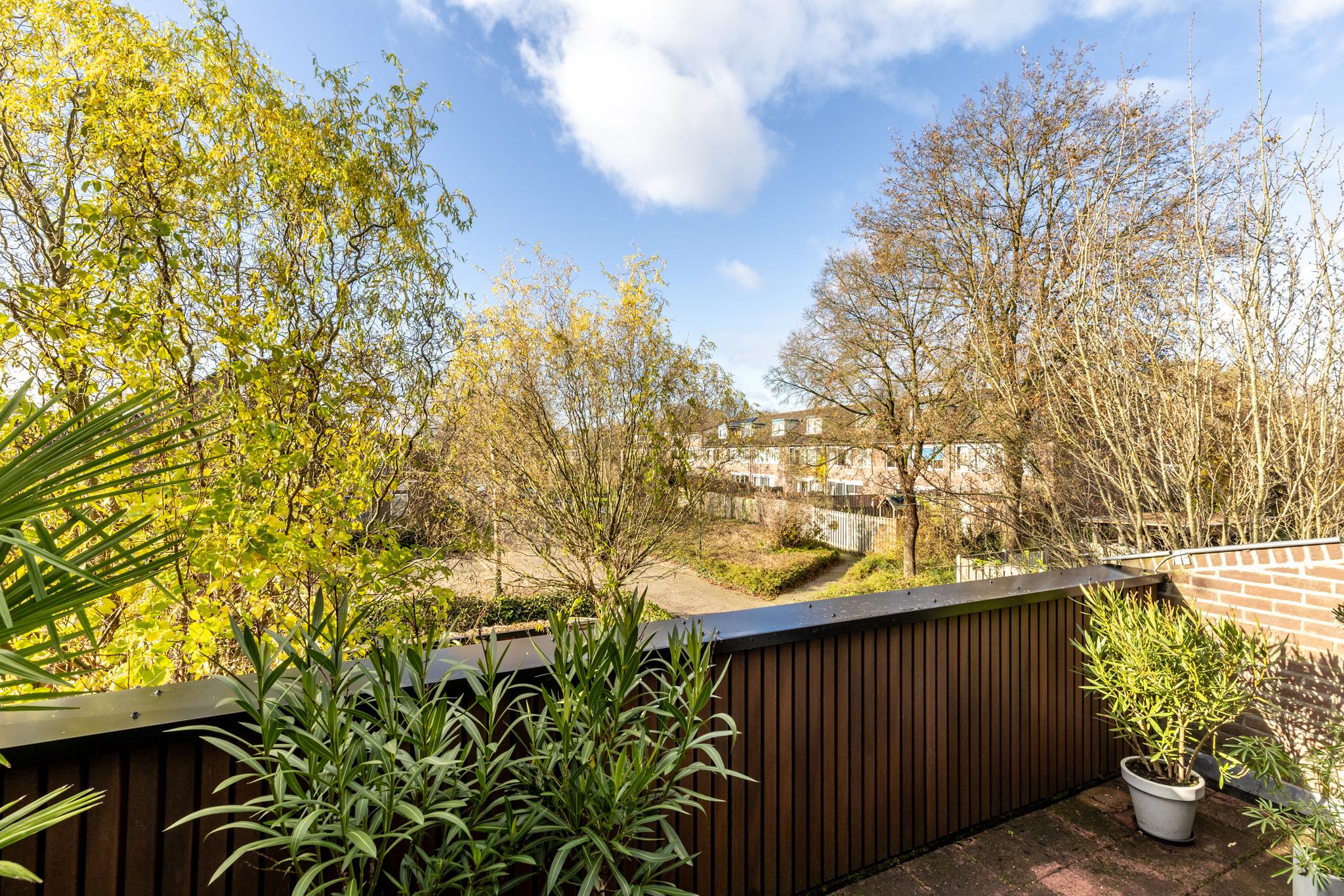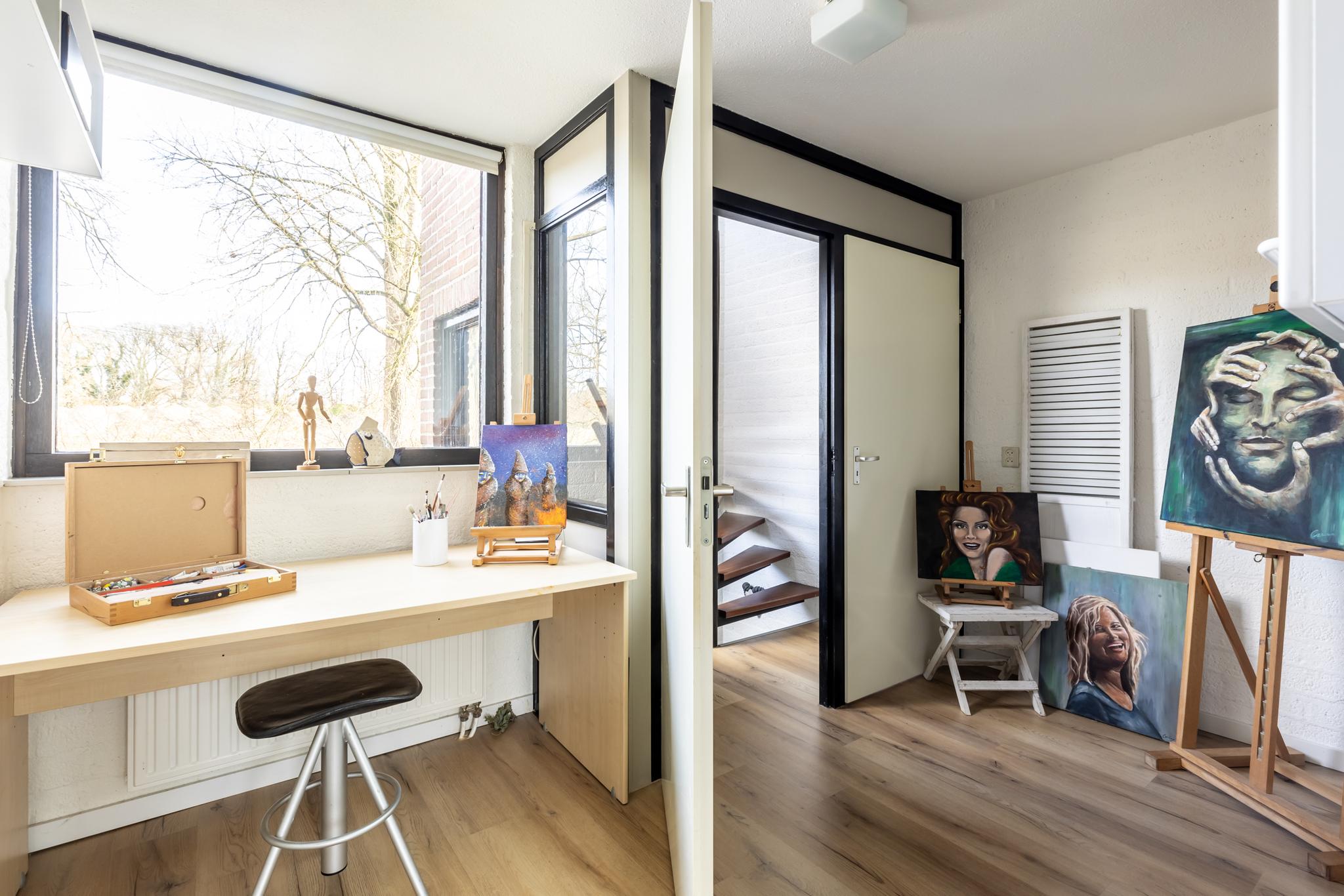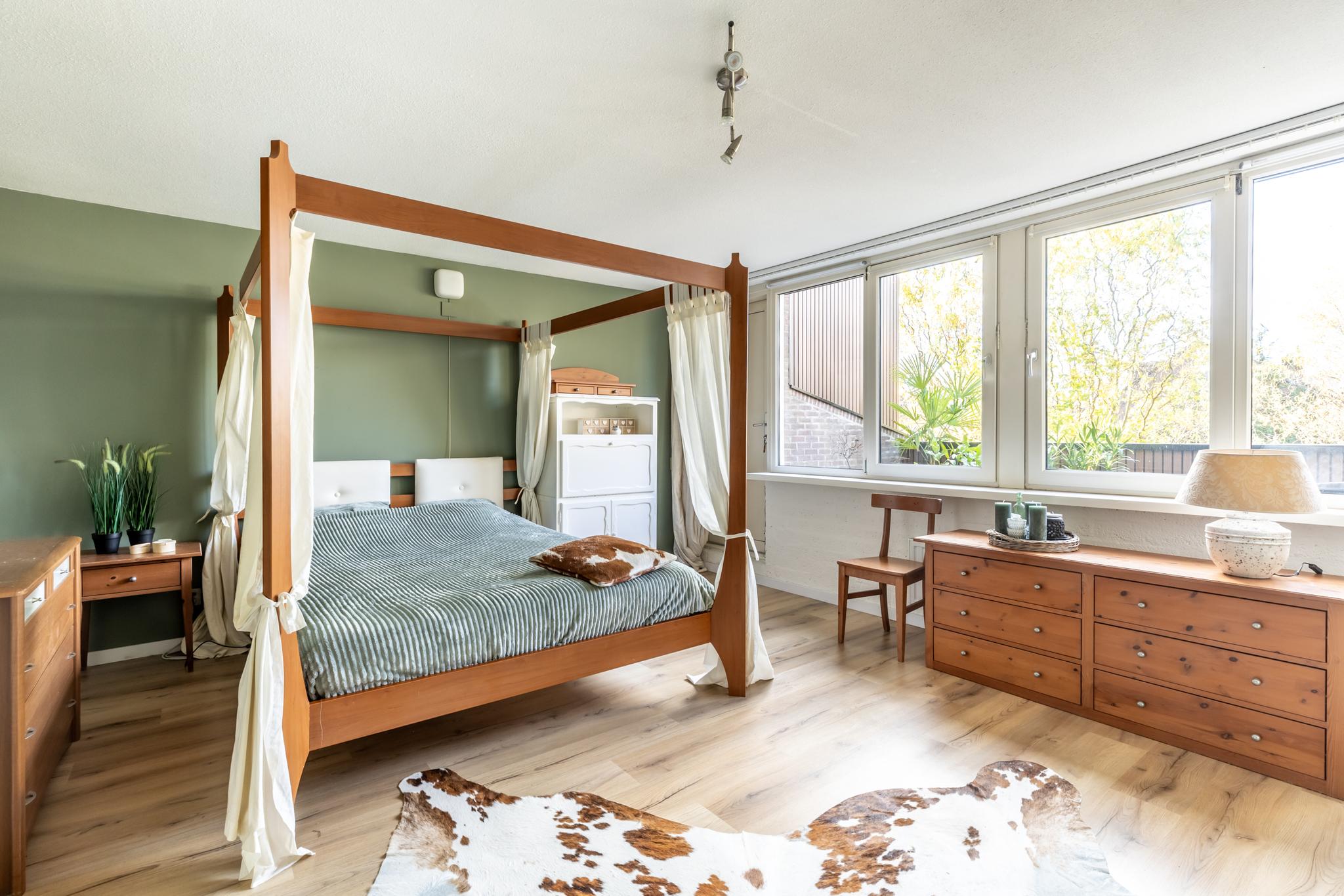 De overloop geeft toegang tot de werkkamer en de hoofdslaapkamer. De hoofdslaapkamer is zeer royaal en biedt directe toegang tot het zonnige dakterras aan de achterzijde van de woning. Het dakterras en achtergevel zijn gerenoveerd en voorzien van fraai en modern geveltimmerwerk. De badkamer is volledig vernieuwd en is in een lichte kleurstelling en voorzien van een hangend toilet, dubbel wastafelmeubel met verlichting en een ligbad met douchemogelijkheid.