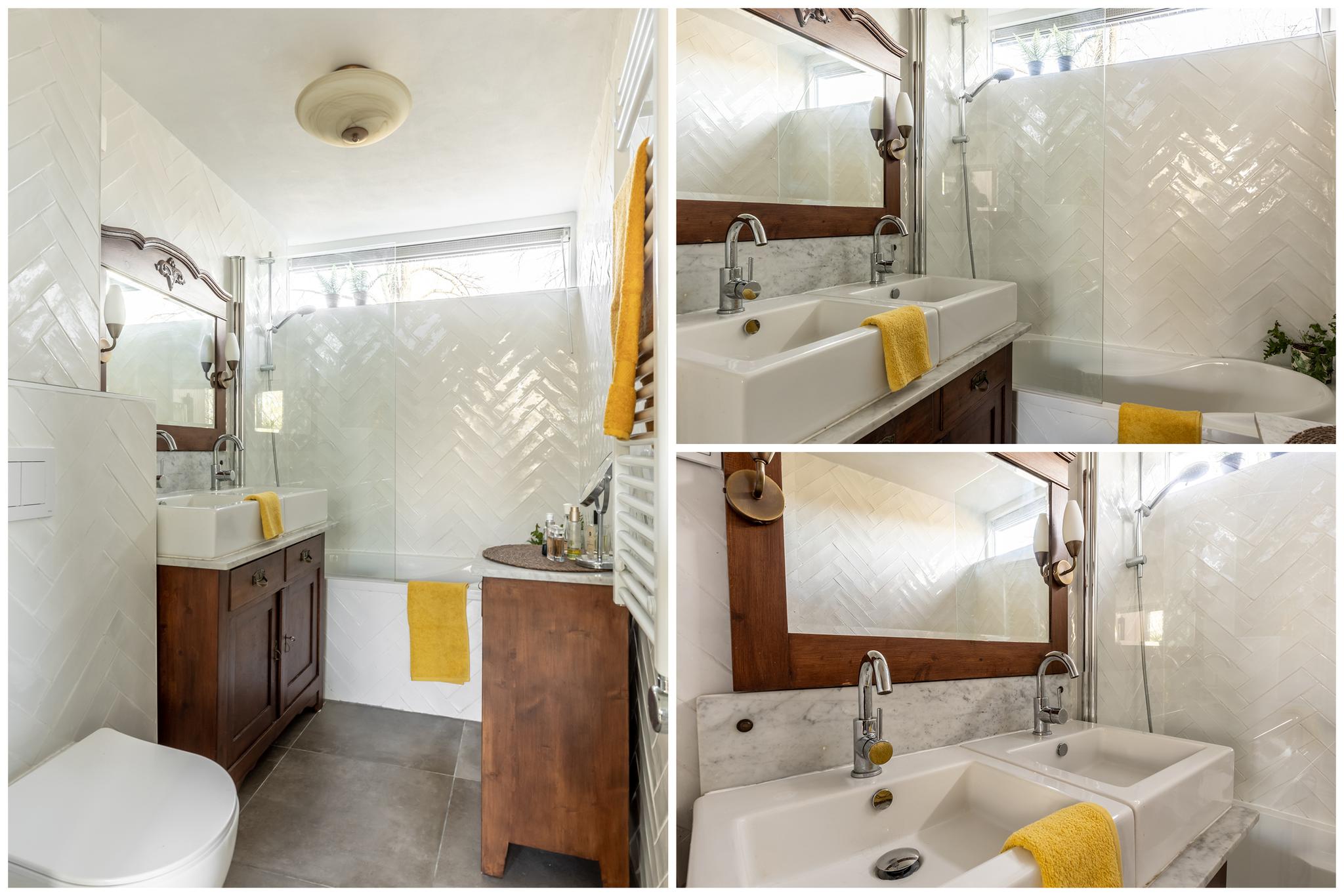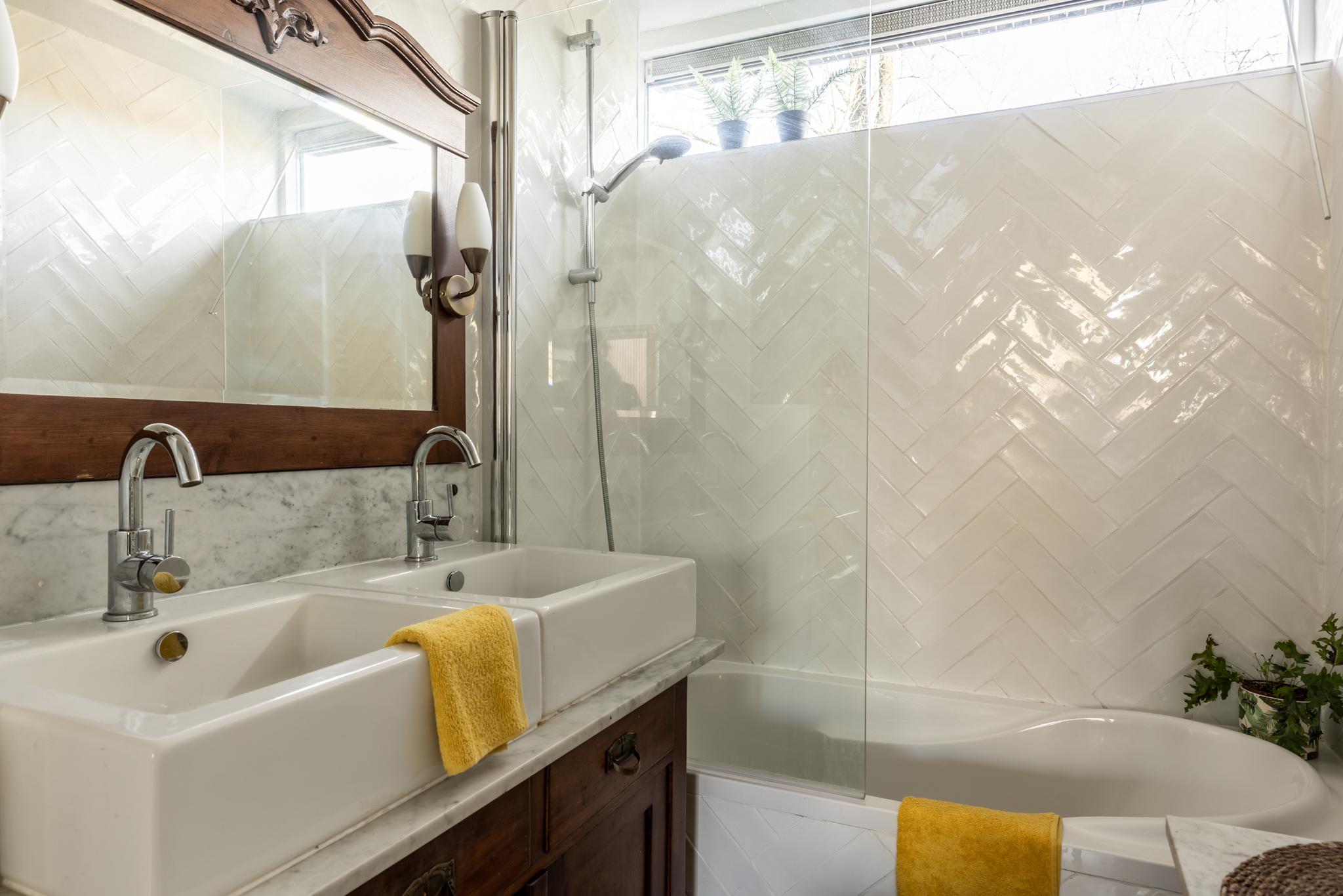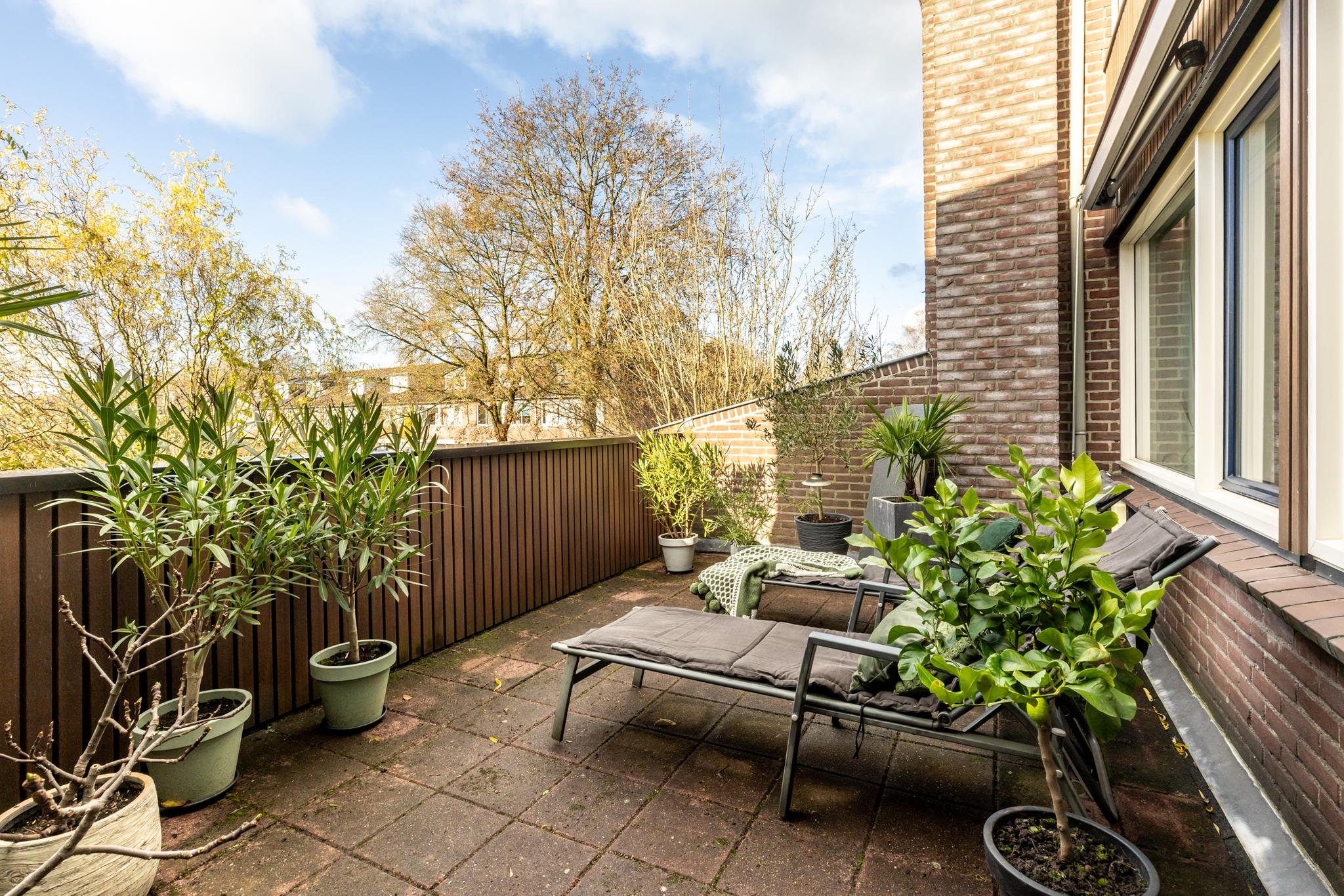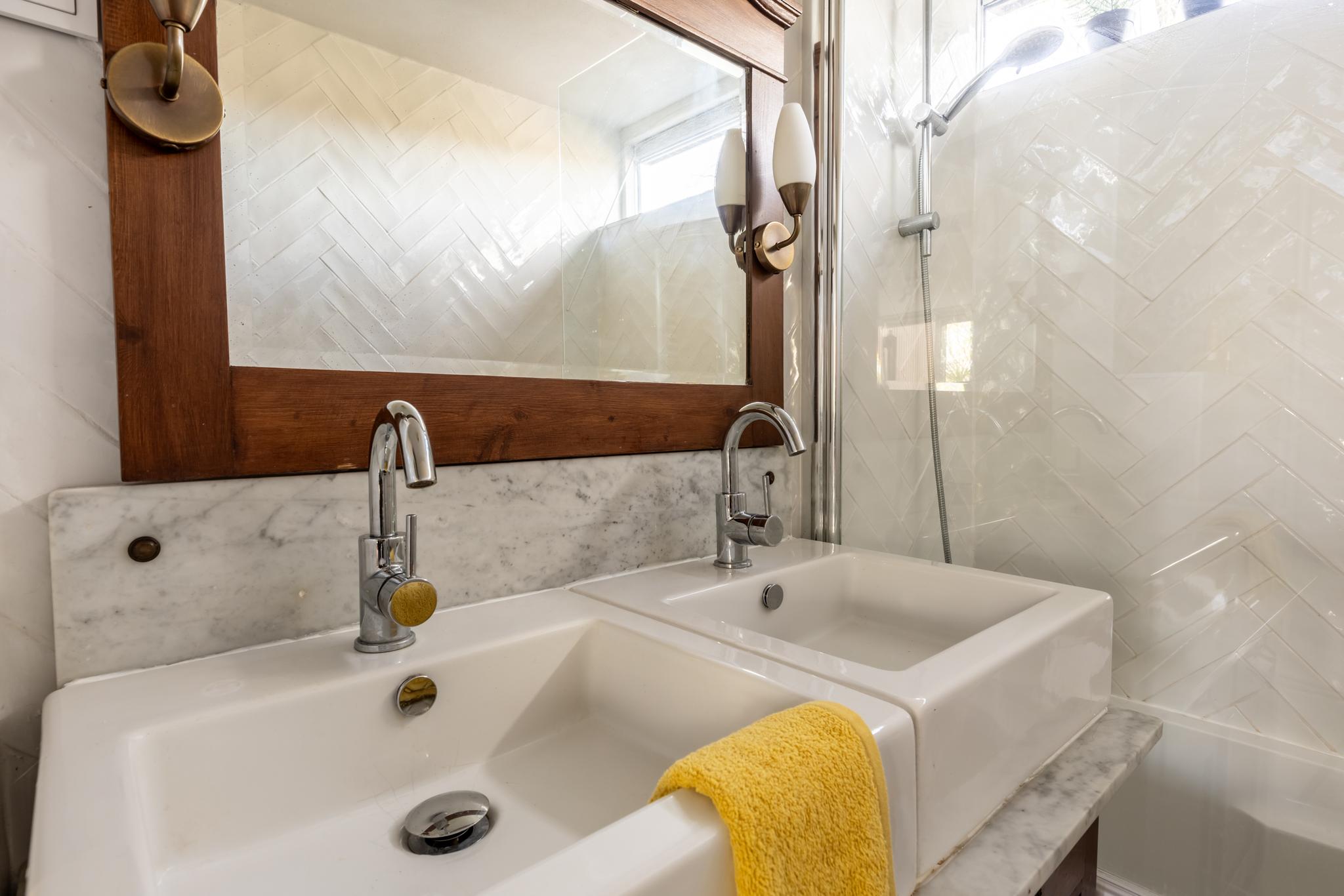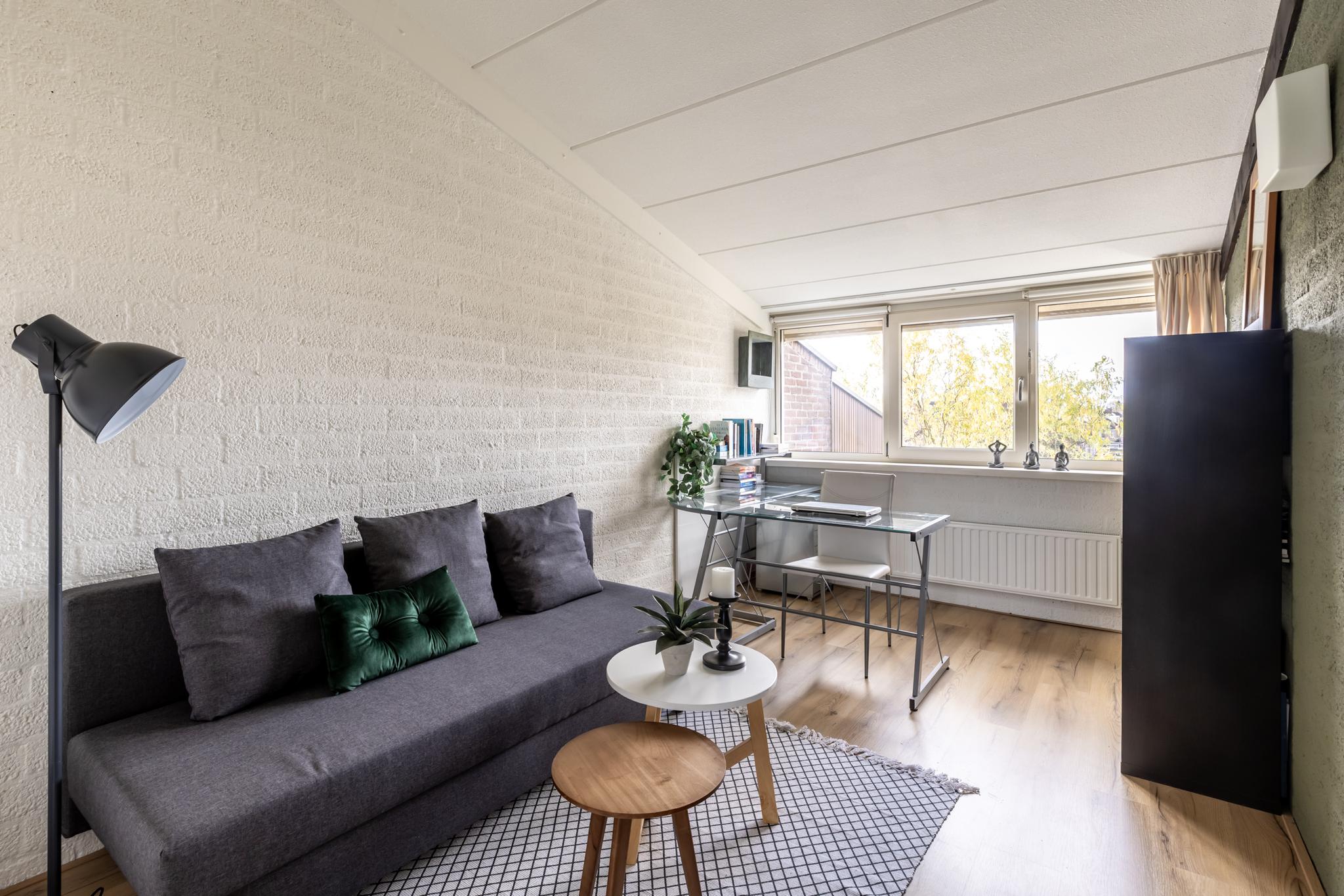 De overloop geeft toegang tot de werkkamer en de hoofdslaapkamer. De hoofdslaapkamer is zeer royaal en biedt directe toegang tot het zonnige dakterras aan de achterzijde van de woning. Het dakterras en achtergevel zijn gerenoveerd en voorzien van fraai en modern geveltimmerwerk. De badkamer is volledig vernieuwd en is in een lichte kleurstelling en voorzien van een hangend toilet, dubbel wastafelmeubel met verlichting en een ligbad met douchemogelijkheid.
