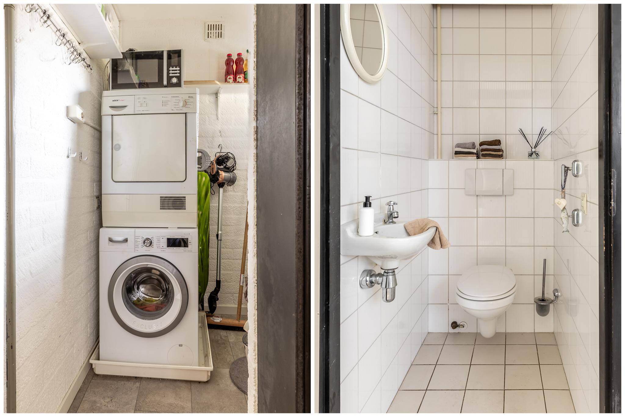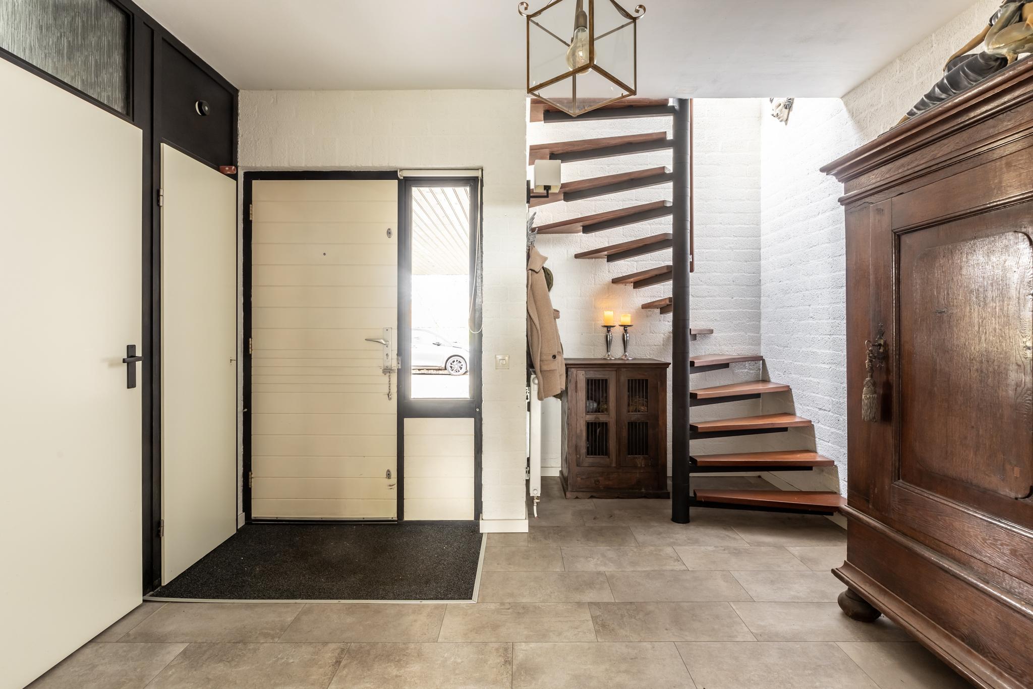 Ruime hal met meterkast, garderobe en toiletruimte met toilet en fonteintje geeft toegang tot de tuingerichte living, de wasruimte en de trap naar de eerste verdieping.