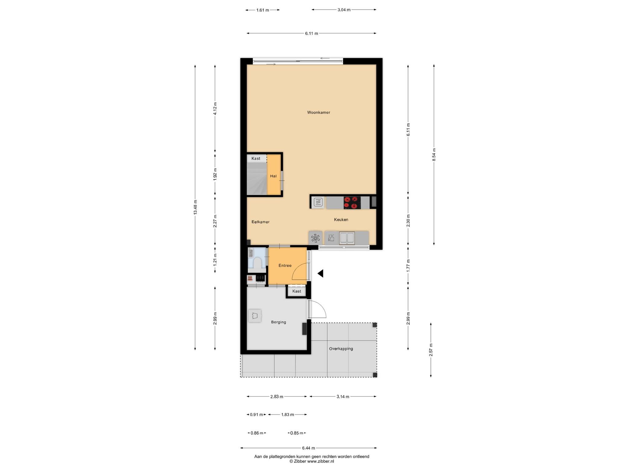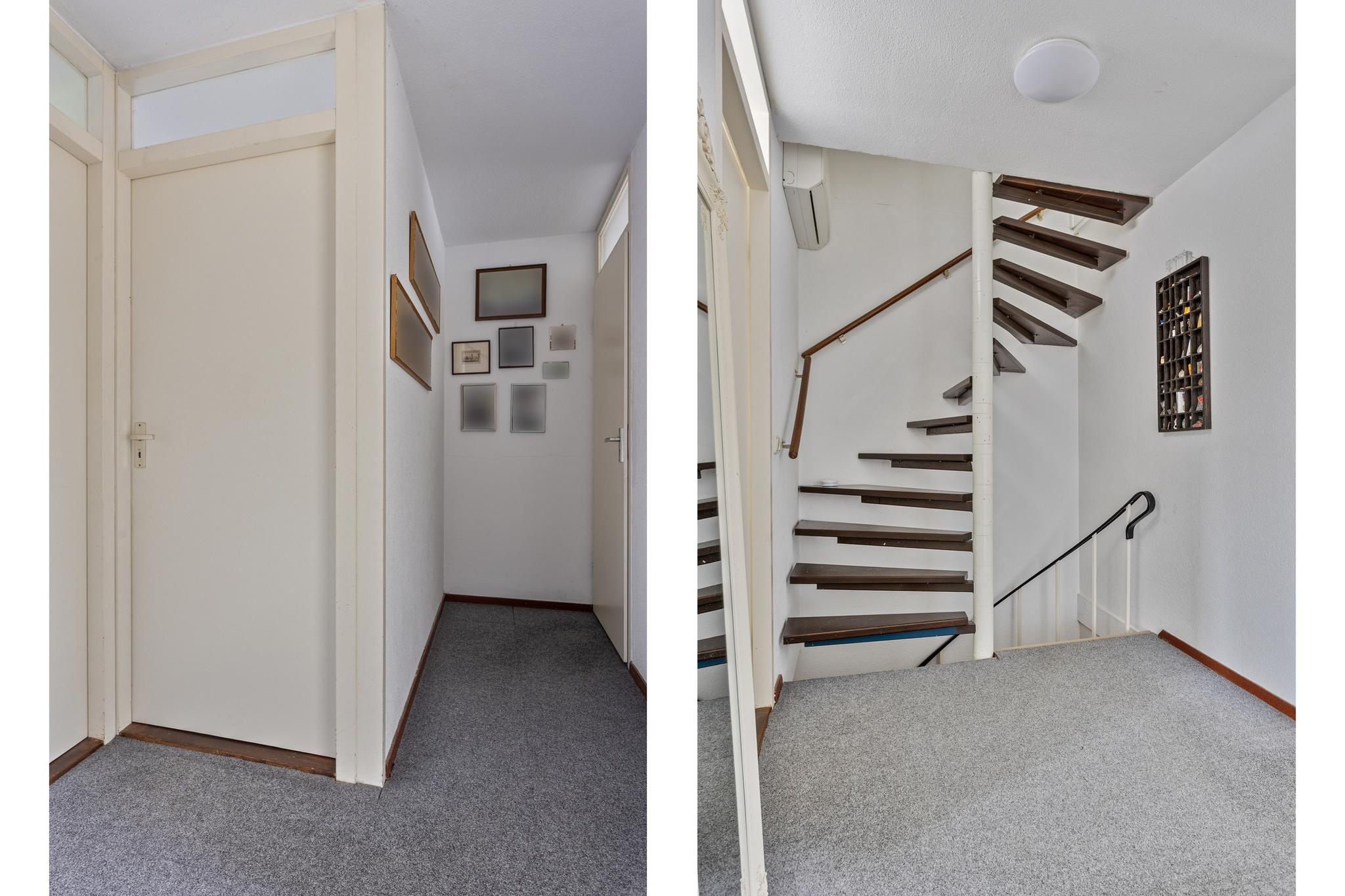 De hal geeft toegang tot de woonkamer, het toilet en de inpandige berging. Ook is hier garderoberuimte aanwezig. De inpandige berging biedt mogelijkheid tot stallen van fietsen alsmede plaatsen van was-apparatuur. Ook bevindt zich hier de meterkast. Het toilet is in lichte kleurstelling betegeld en voorzien van douche-wc en fonteintje.
