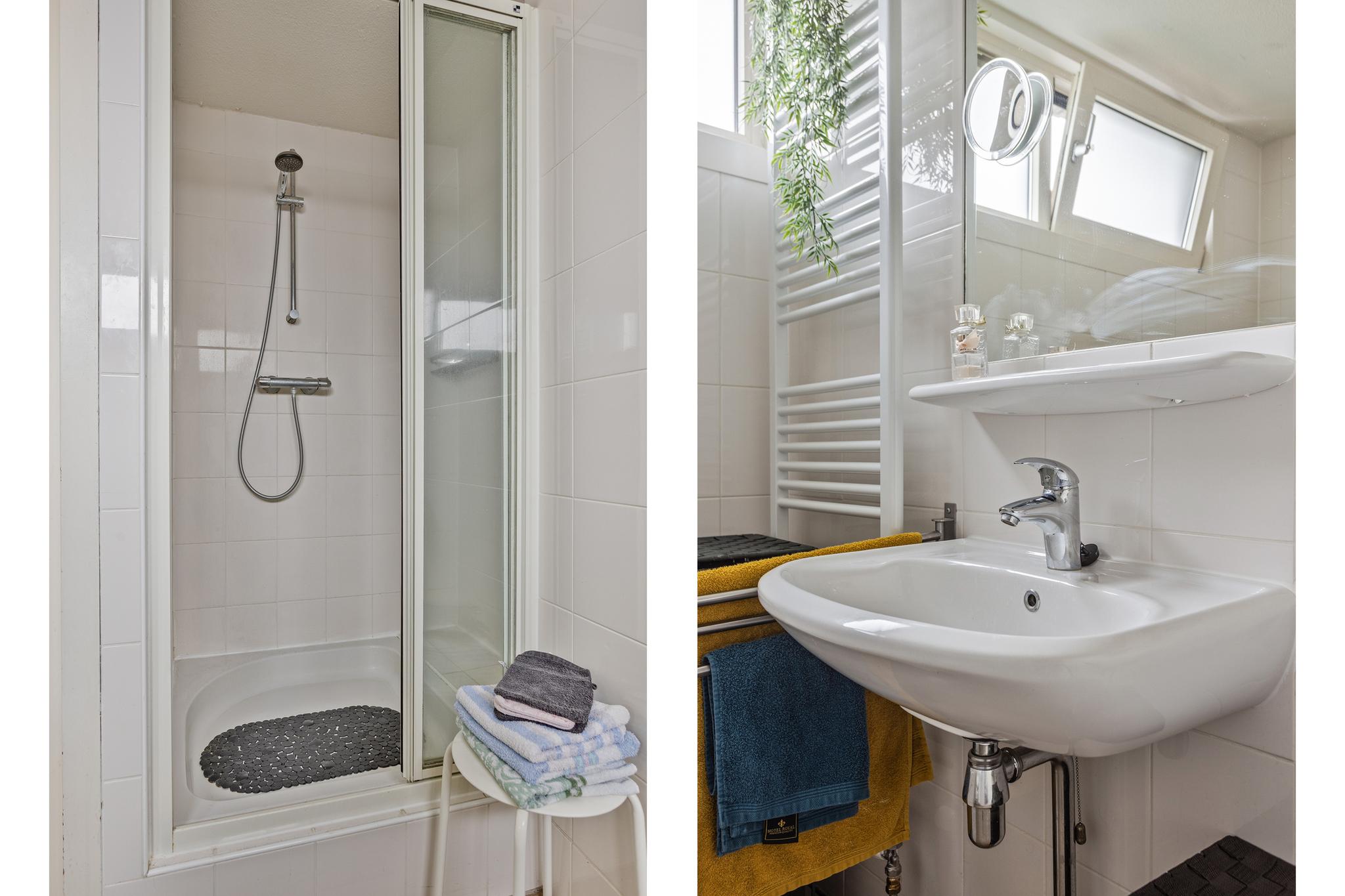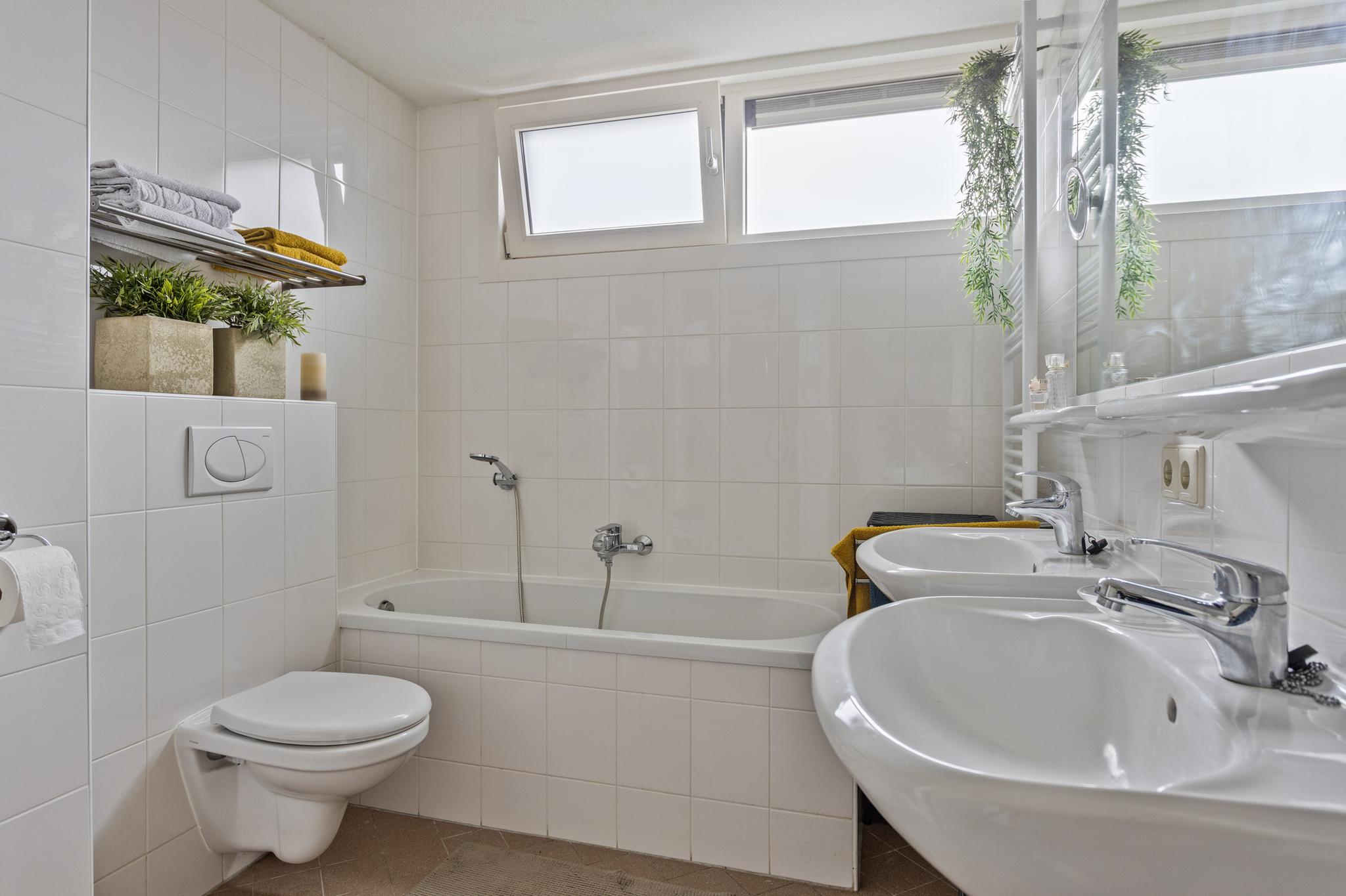 De badkamer is geheel betegeld in lichte kleurstelling. De badkamer is uitgerust met: ligbad, zwevend closet, separate douchecabine, dubbele wastafels.