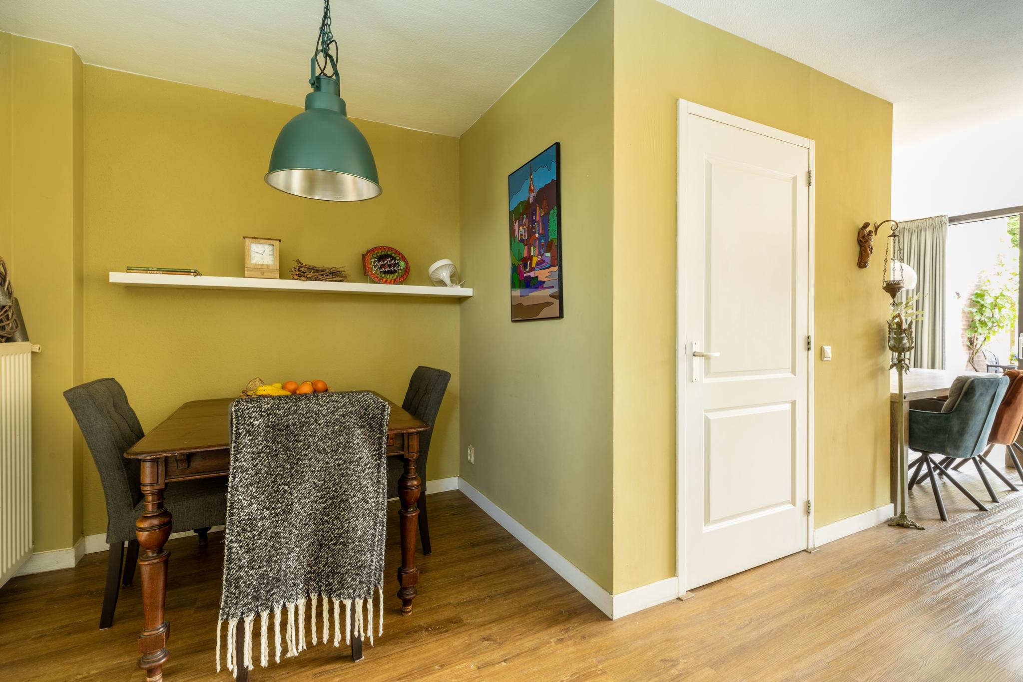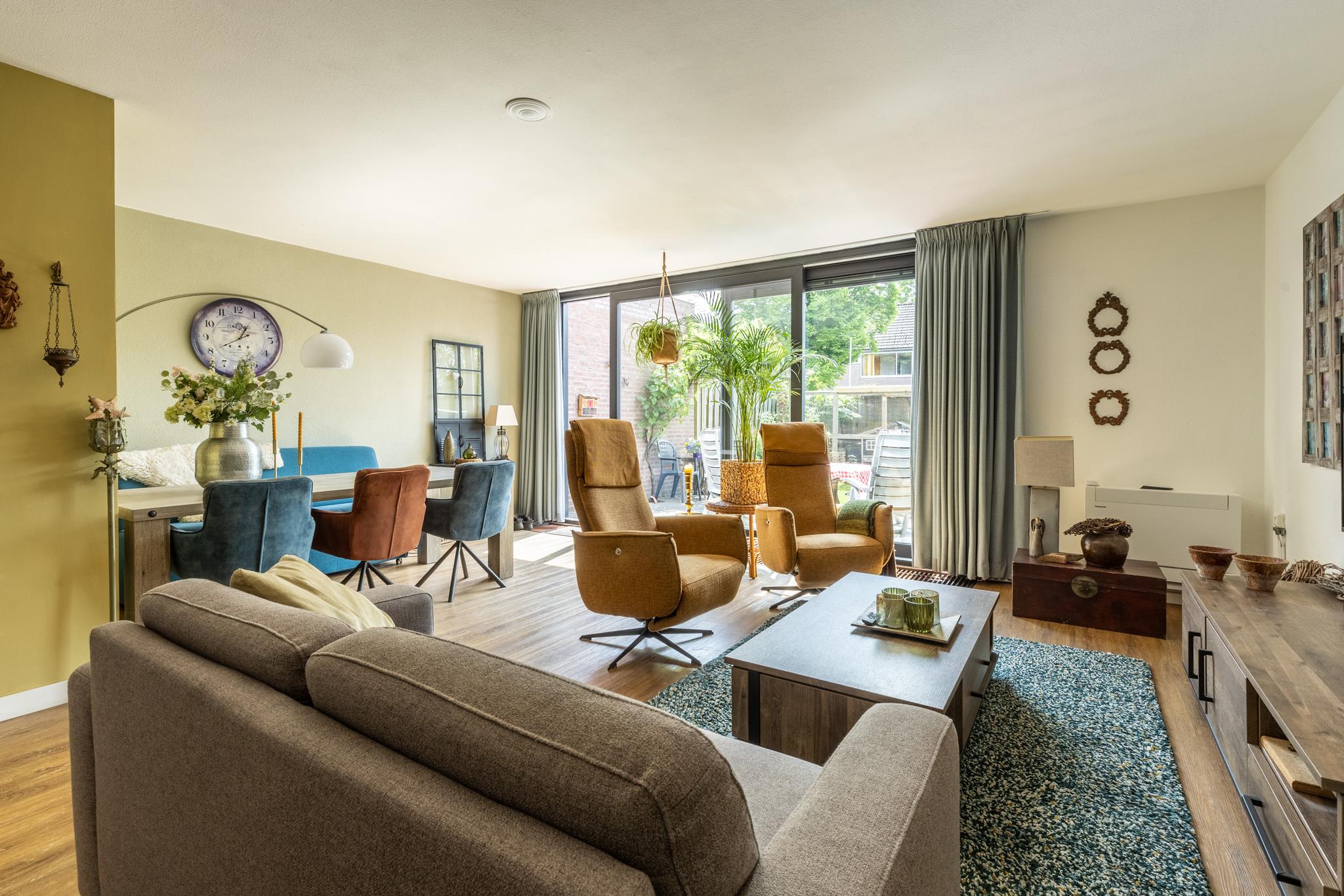 Wat een heerlijke woonkamer! Deze lichte en sfeervolle ruimte straalt warmte en comfort uit. De grote schuifpui zorgt niet alleen voor een prettige verbinding met de tuin, maar laat ook volop natuurlijk daglicht binnenstromen, wat de kamer een open en ruimtelijk gevoel geeft. De PVC-vloer in houtlookstijl voegt een warme, natuurlijke uitstraling toe en er is genoeg plek voor een comfortabele zithoek én een eettafel, wat deze woonkamer tot een gezellige leefruimte maakt voor het hele gezin. Vanuit de woonkamer is er toegang tot een tussenportaal welke toegang biedt tot de eerste verdieping doormiddel van een spiltrap.