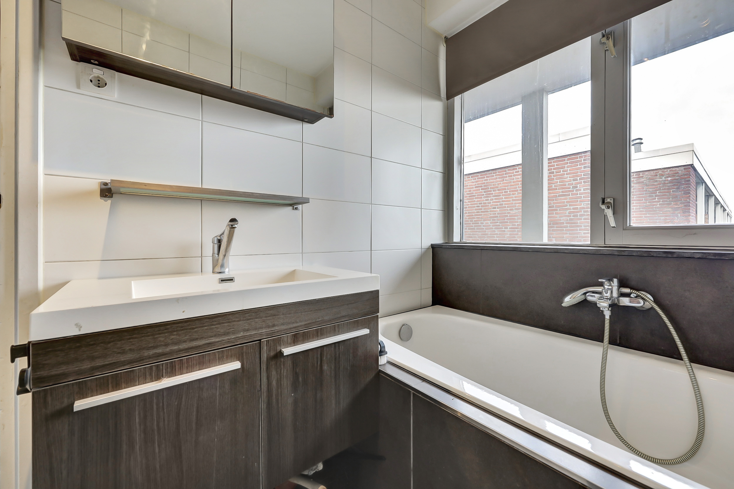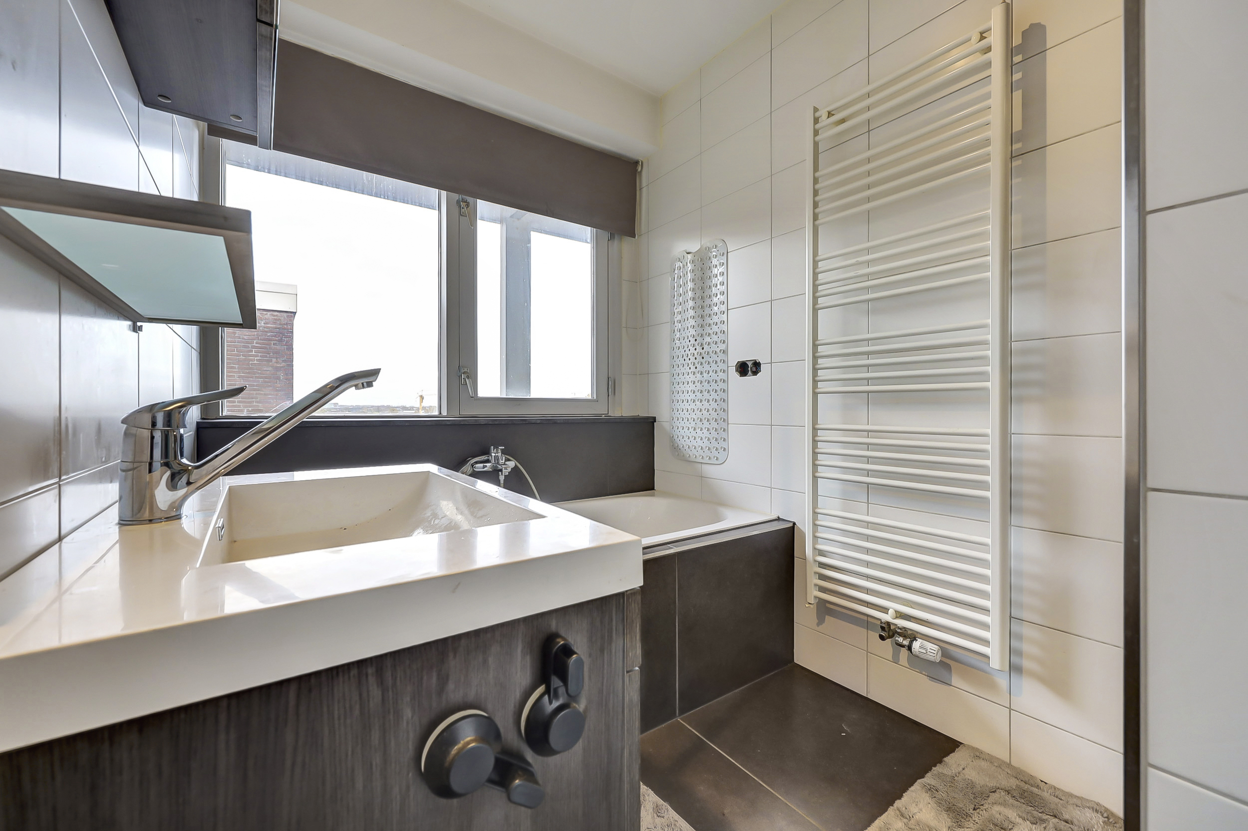 De badkamer is compleet ingericht met een ligbad, douche, wastafel met stijlvol meubel en een designradiator. Ook hier zorgen de aanwezige ramen voor een frisse en lichte uitstraling.