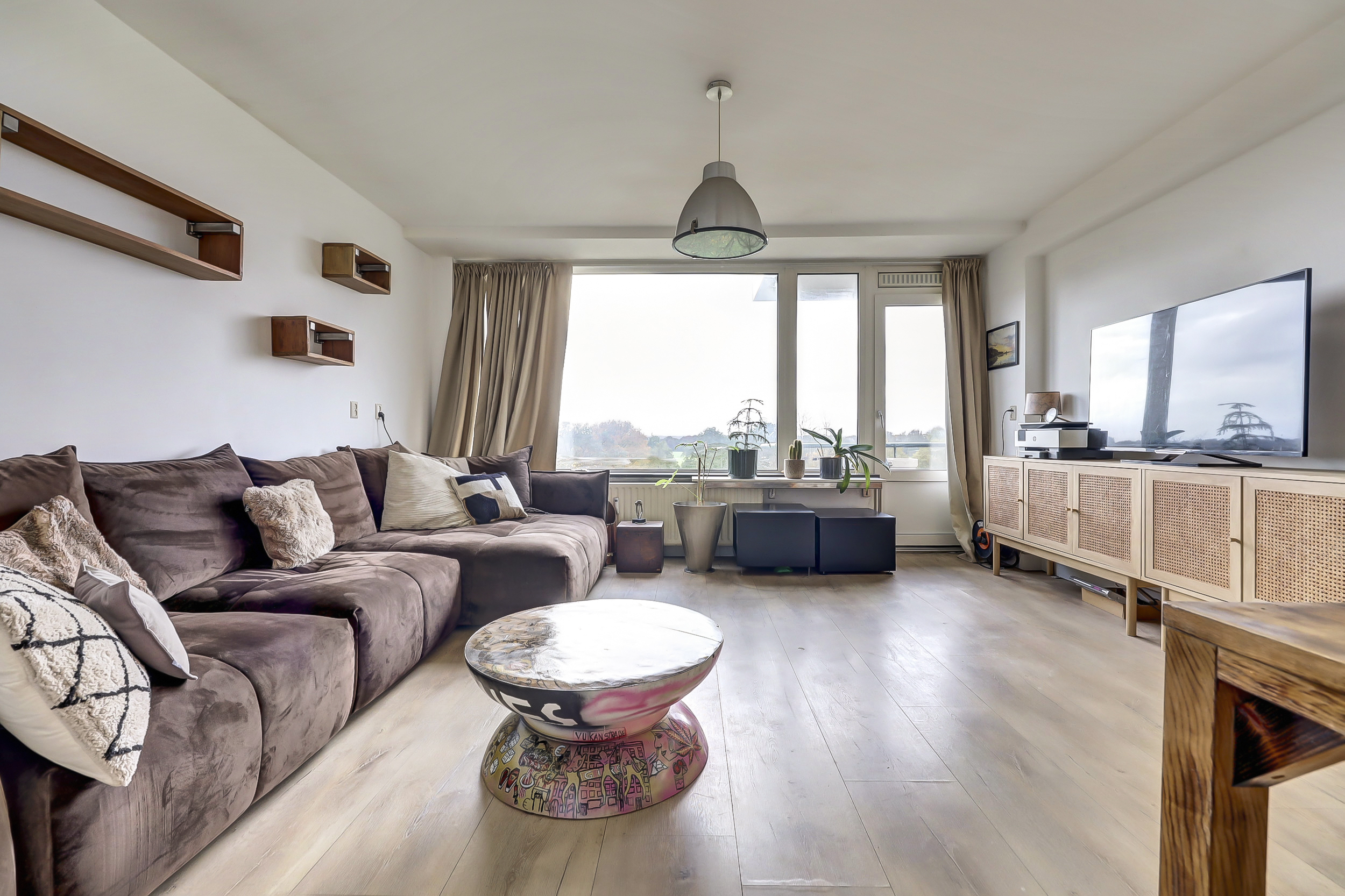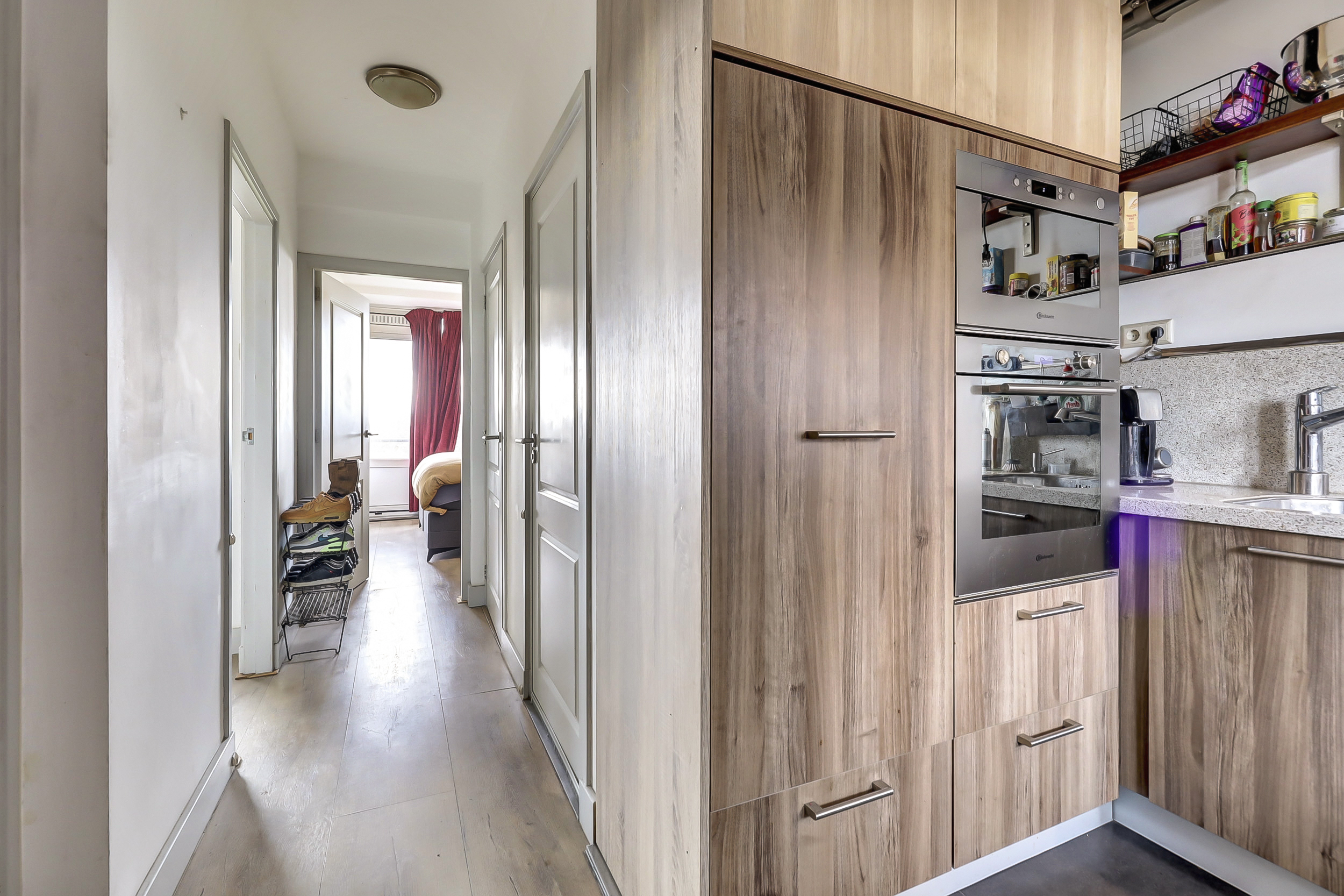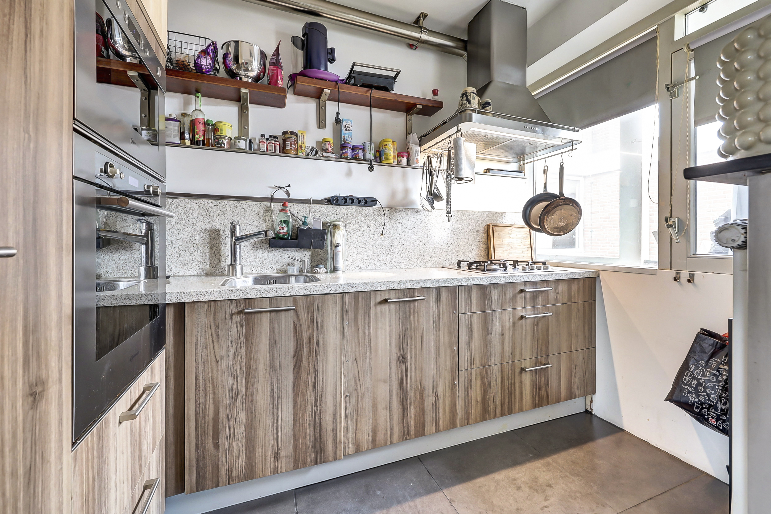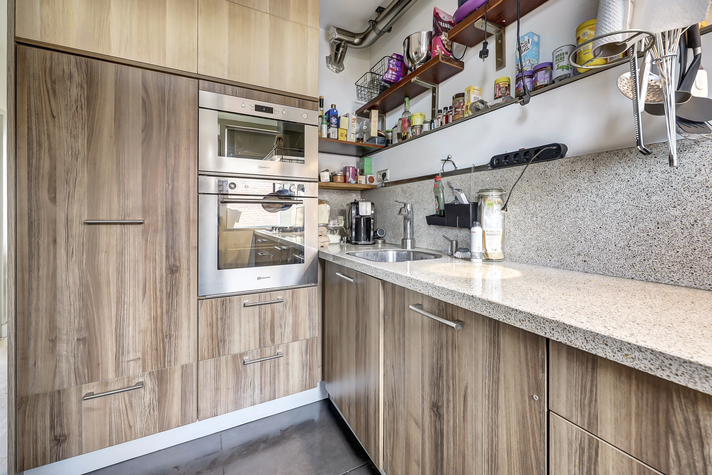 De halfopen keuken, gelegen aan de andere zijde van het appartement, biedt verrassend veel kast- en werkruimte. De keuken is uitgerust met diverse inbouwapparatuur, waaronder vaatwasser, koelkast, oven en magnetron. Dankzij de grote raampartijen valt hier veel daglicht binnen en heb je een prettige doorkijk naar buiten – een fijne plek om te koken en te tafelen.