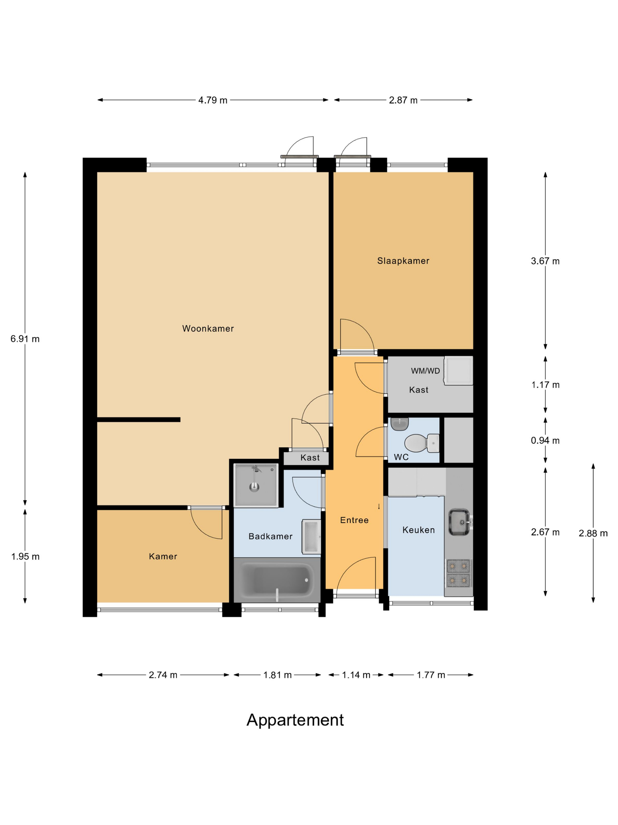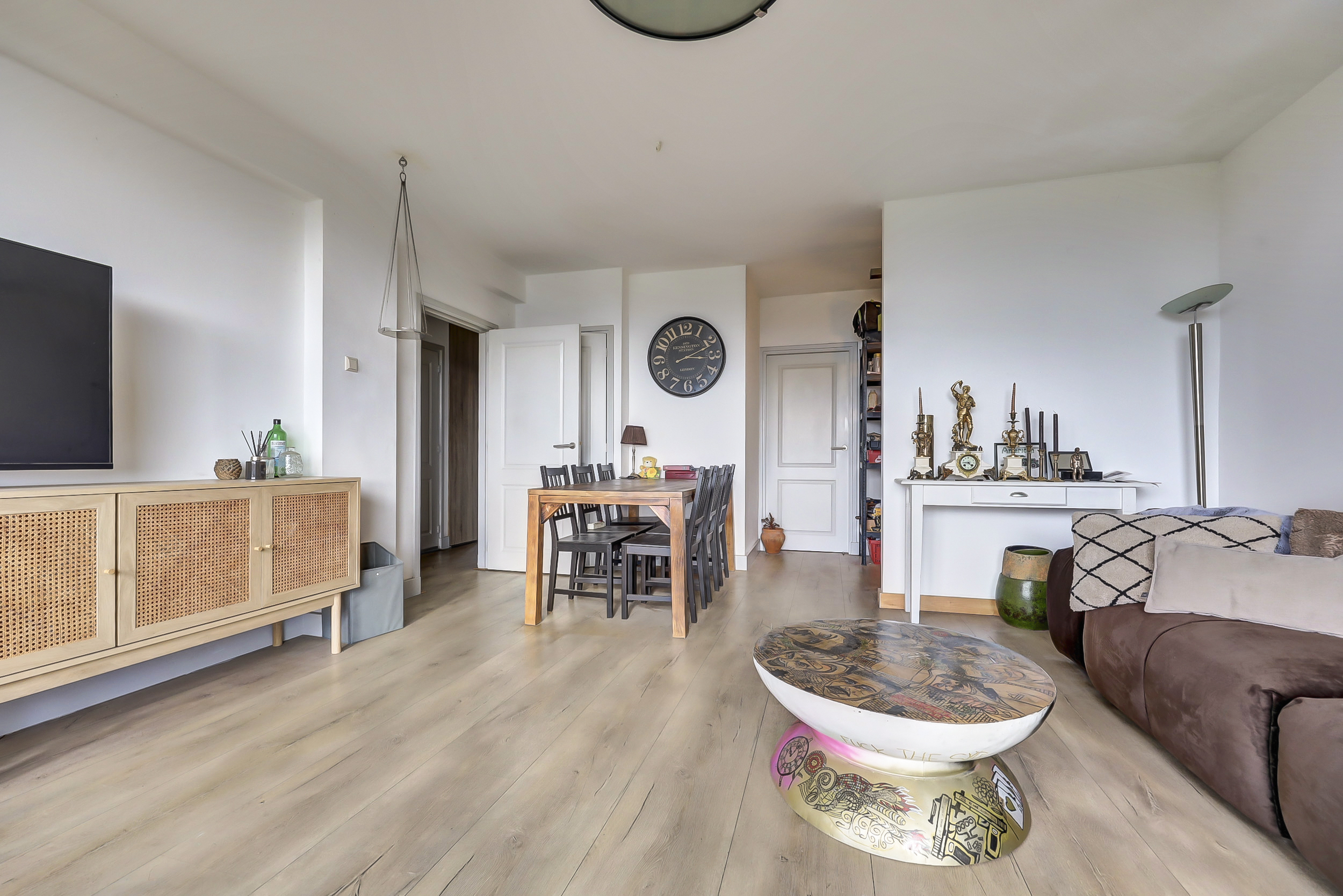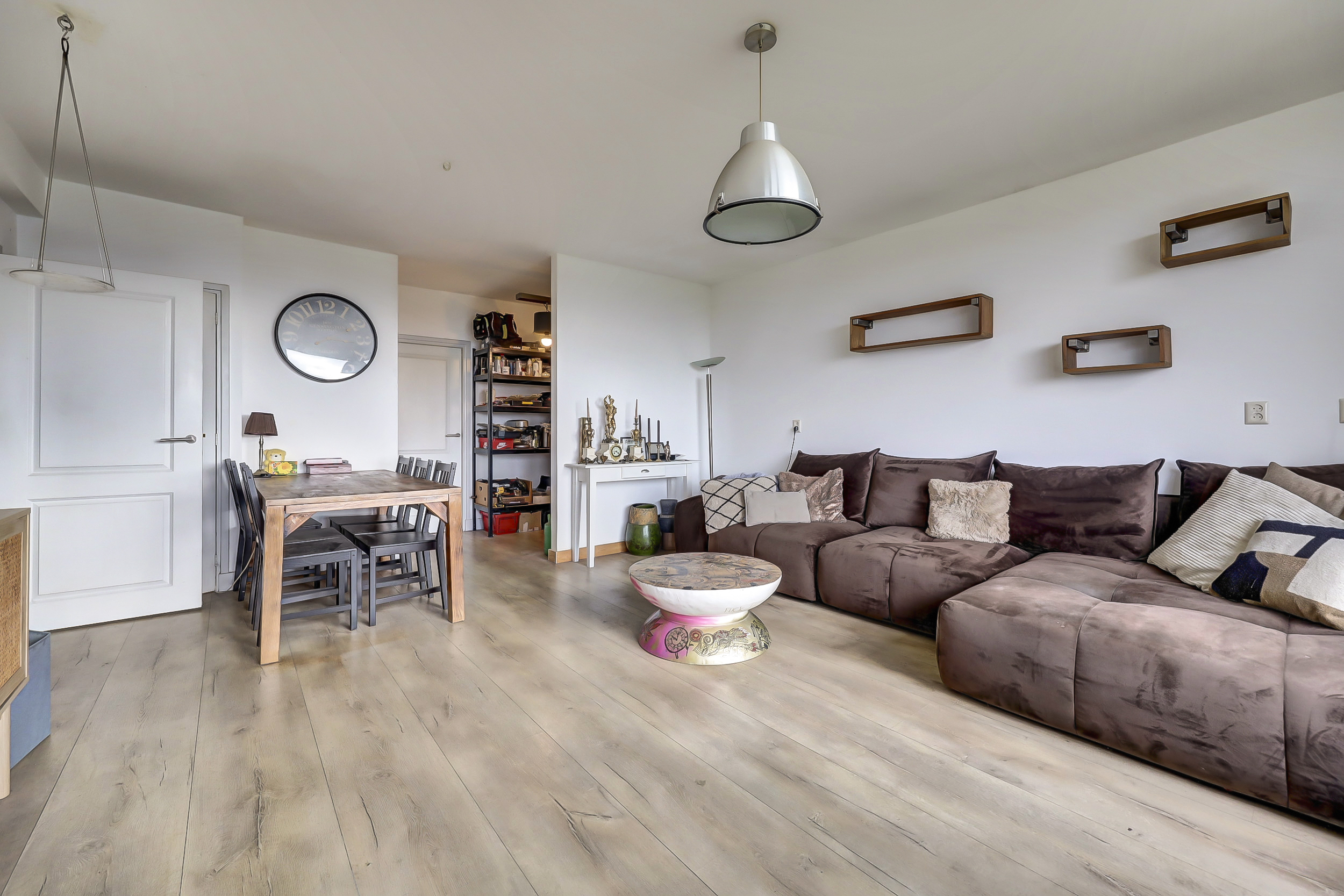 Via de hal van het appartement betreed je direct de lichte en sfeervolle woonkamer met een prettig uitzicht over de omgeving. De ruimte is royaal van opzet, waardoor je hier moeiteloos een comfortabele zithoek met een grote hoekbank én een eettafel kunt creëren. Een handige roomdivider scheidt de woonkamer subtiel, waardoor er een extra plek is ontstaan voor opslag of een compacte werkhoek. Ideaal voor wie thuis wil werken of wat extra bergruimte zoekt. Achter deze ruimte bevindt zich bovendien nog een praktische kamer, perfect voor het opbergen van voorraad of het inrichten van een thuiswerkplek.