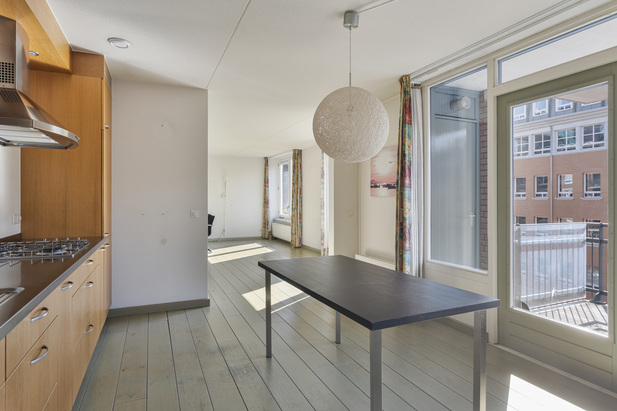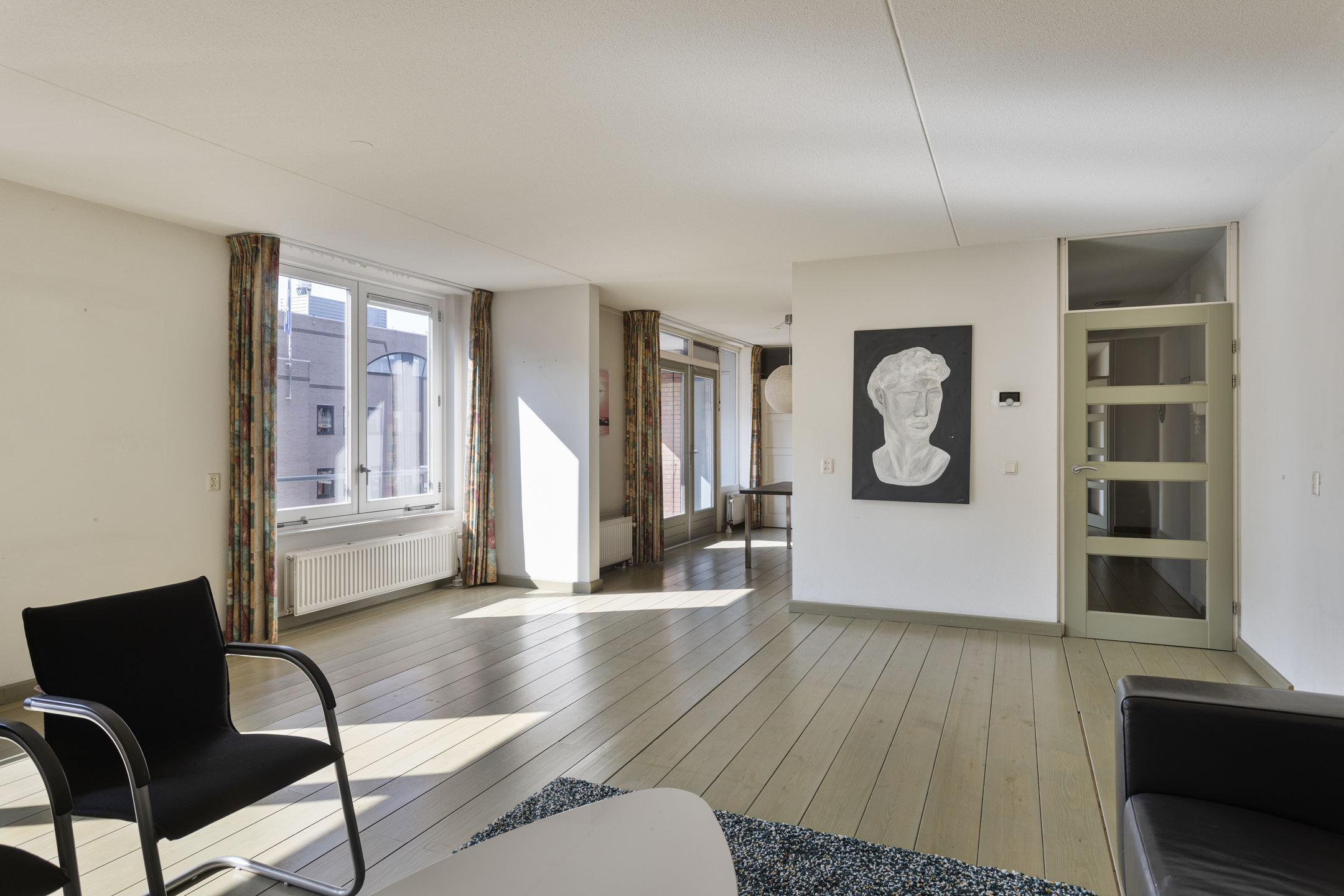 De lichte woonkamer met aansluitend de woonkeuken (samen rond de 50 m2) met openslaande deuren naar het balkon op het zuiden is uniek te noemen voor dit appartement.