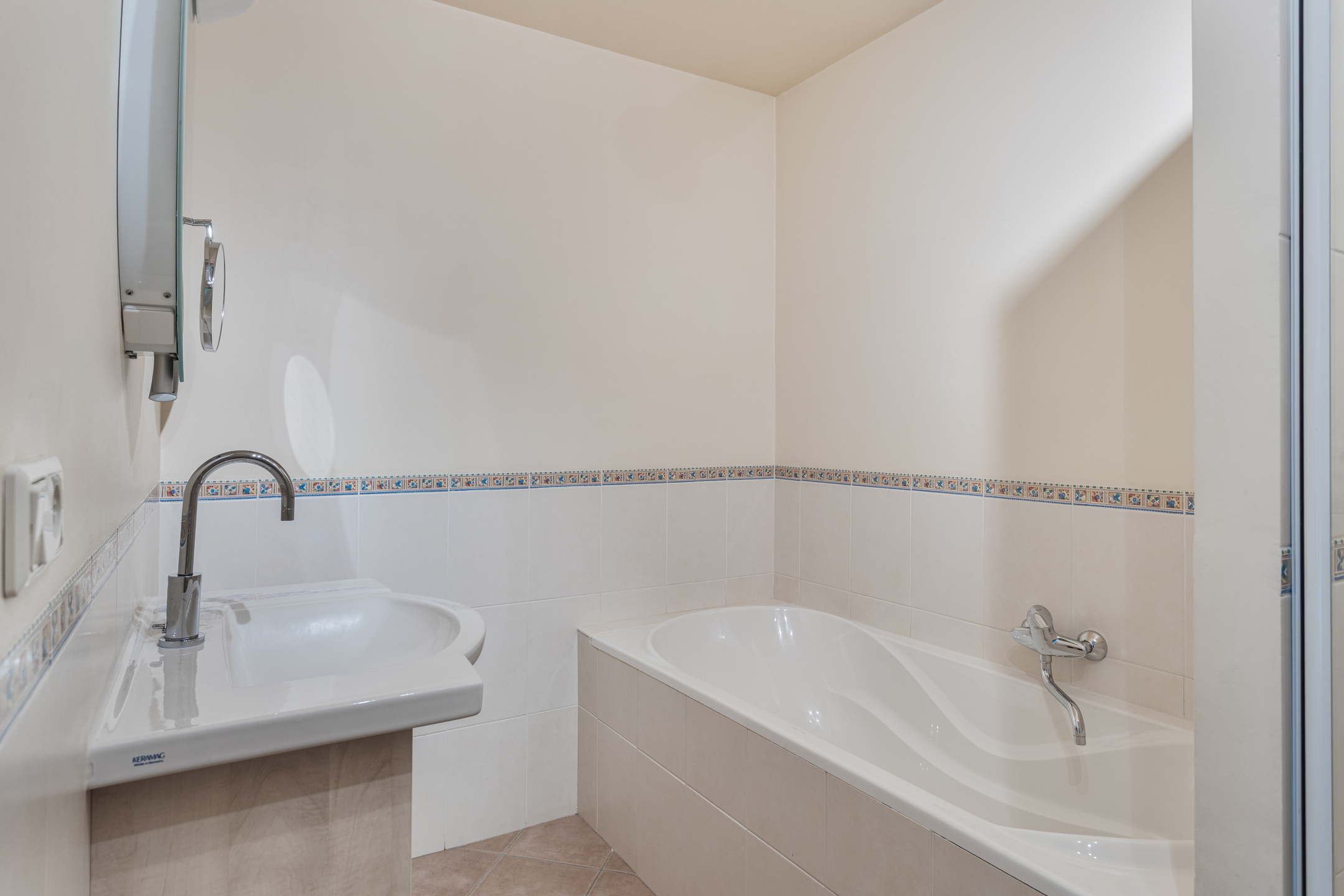 Grenzend aan de slaapkamer, bevindt zich de badkamer. Met de lichte kleurstelling en praktische indeling geeft de badkamer een ruimtelijk gevoel. De badkamer is voorzien van een ligbad, douche en wastafel met meubel.